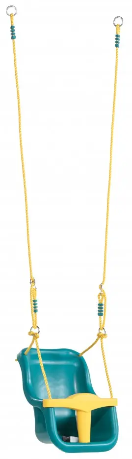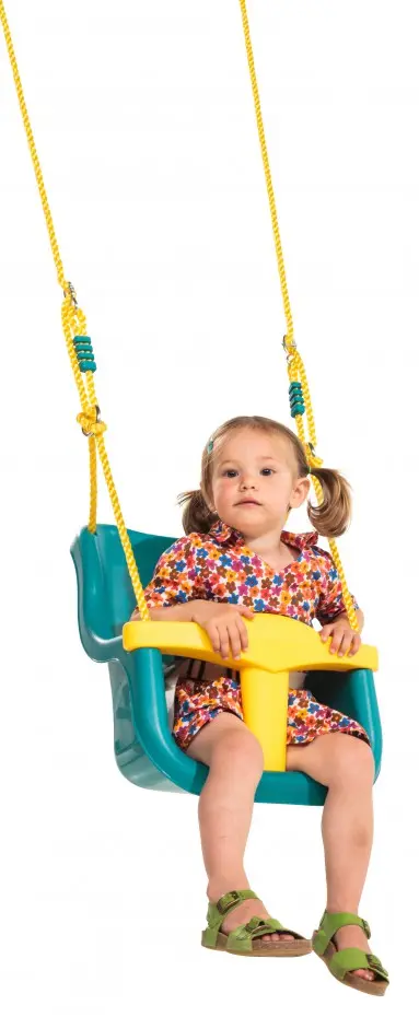 Le siège de balançoire pour bébé turquoise est équipé d'une barre en T jaune. Le siège de balançoire est également doté d'une sangle de sécurité. La balançoire pour bébé est équipée de corde en PP jaune.