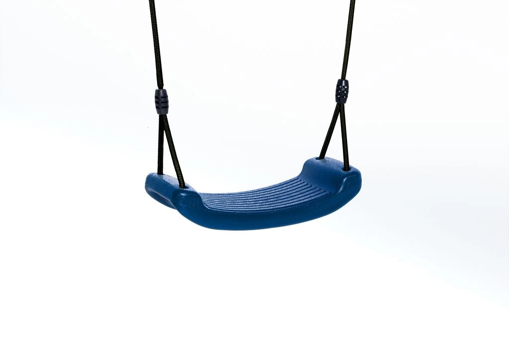 Siège de balançoire en plastique de couleur bleu. Une balançoire robuste, spécialement pour les enfants. La taille est de 42x17x8,5cm. Ce siège de balançoire en plastique est équipé d'une corde BR noire. Anneaux et arbres réglables en acier galvanisé.