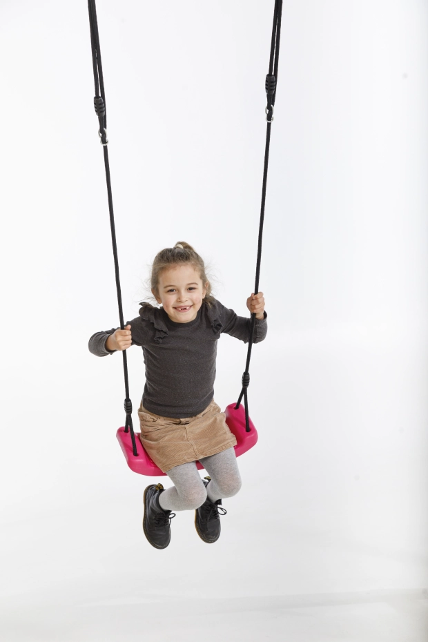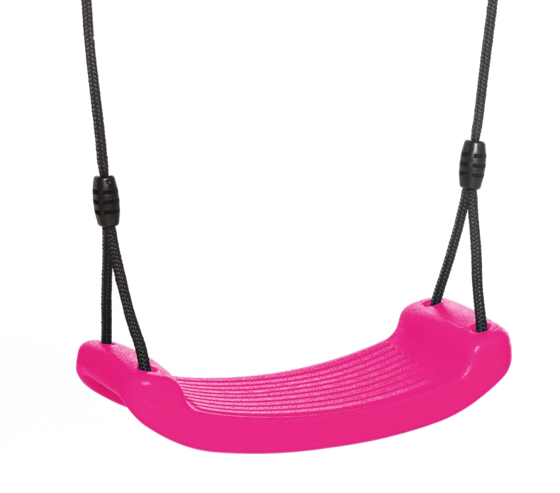 Siège de balançoire amusant pour enfants. La surface totale du siège de balançoire est de 42x17 cm. Ce siège de balançoire en plastique rose est équipé d'une corde noire tressée. À l'extrémité de la corde, un anneau de suspension est prévu pour accrocher facilement le siège de balançoire.