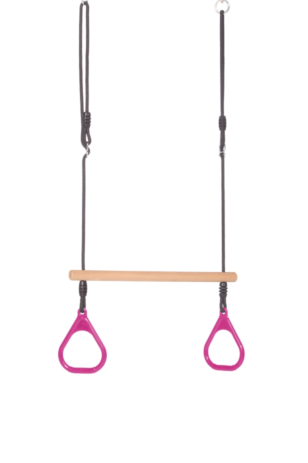 Le trapèze en bois avec anneaux est équipé d’anneaux en plastique couleur rose. Faites divers acrobaties avec les anneaux et le trapèze. Le trapèze garantit des heures de plaisir !