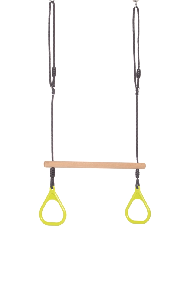 Trapèze en bois avec anneaux en plastique vert citron frais. Équipé d'une corde BR noire douce pour les doigts. Prêt pour des acrobaties!