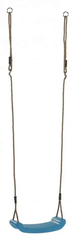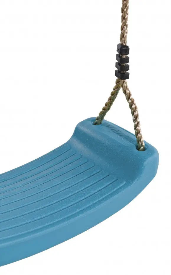 Siège de balançoire en plastique dans la belle couleur turquoise, aussi appelée vert pomme bleuté. Le siège de balançoire a des cordes PP de 10 mm avec des anneaux de suspension. Le siège est en plastique soufflé et peut supporter un poids maximal de 70 kg.