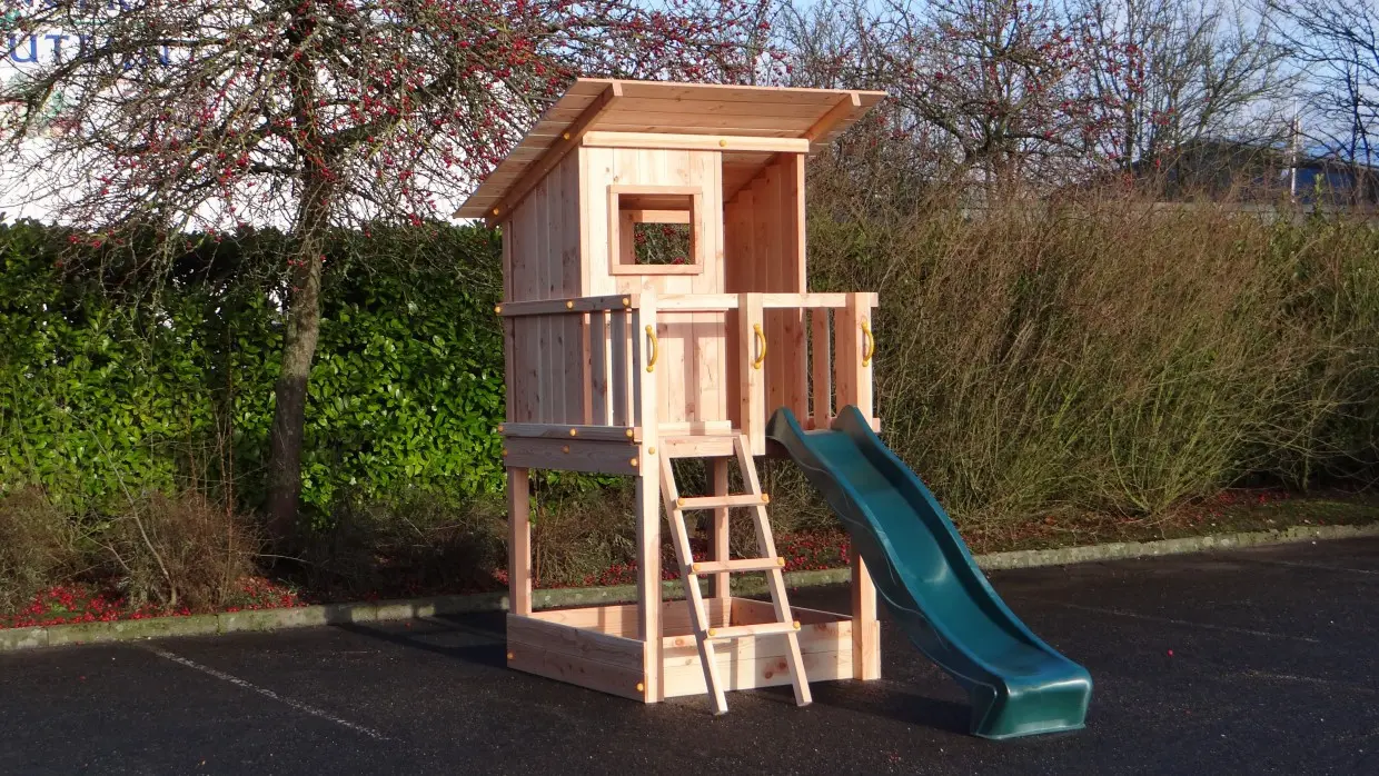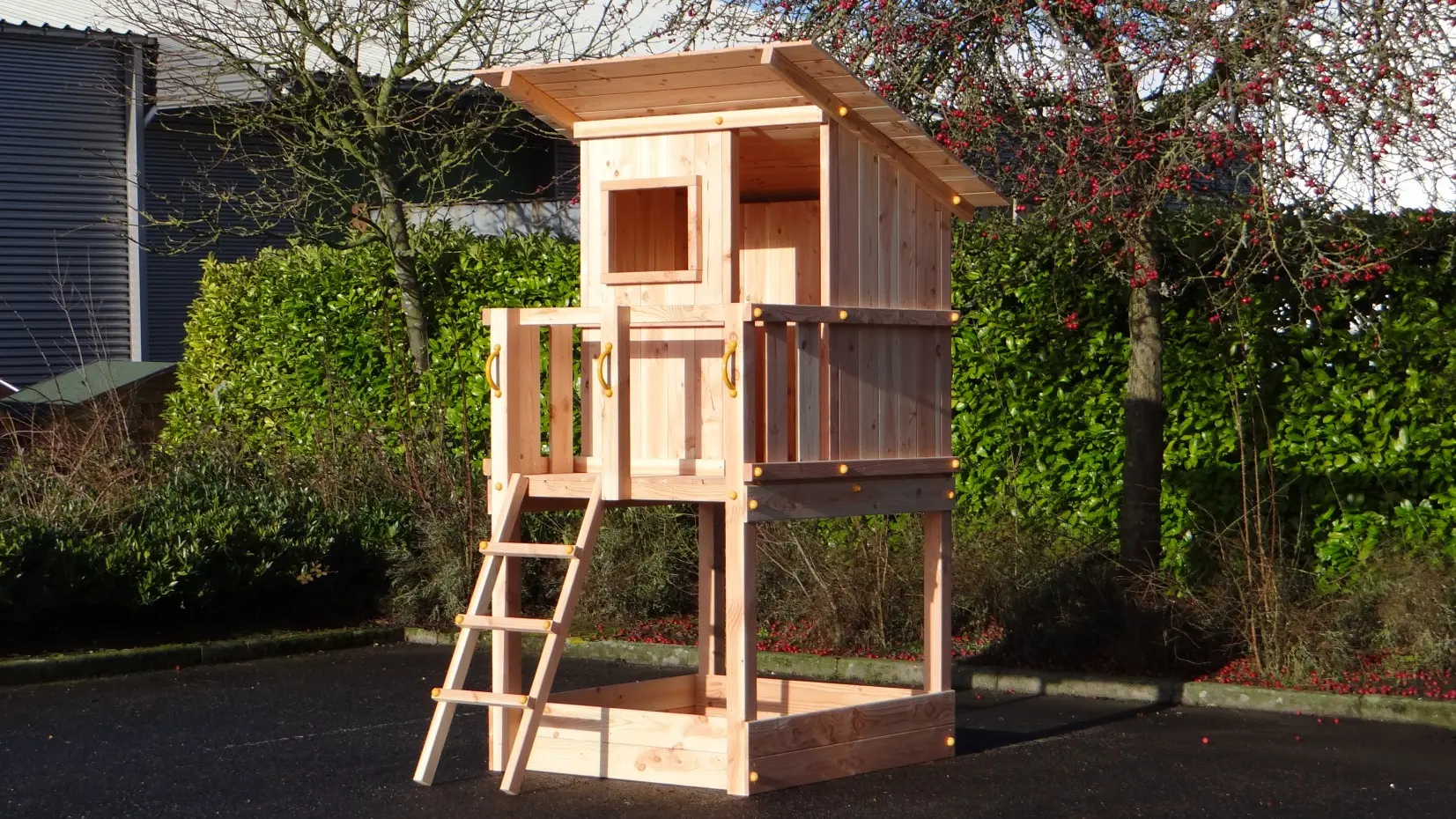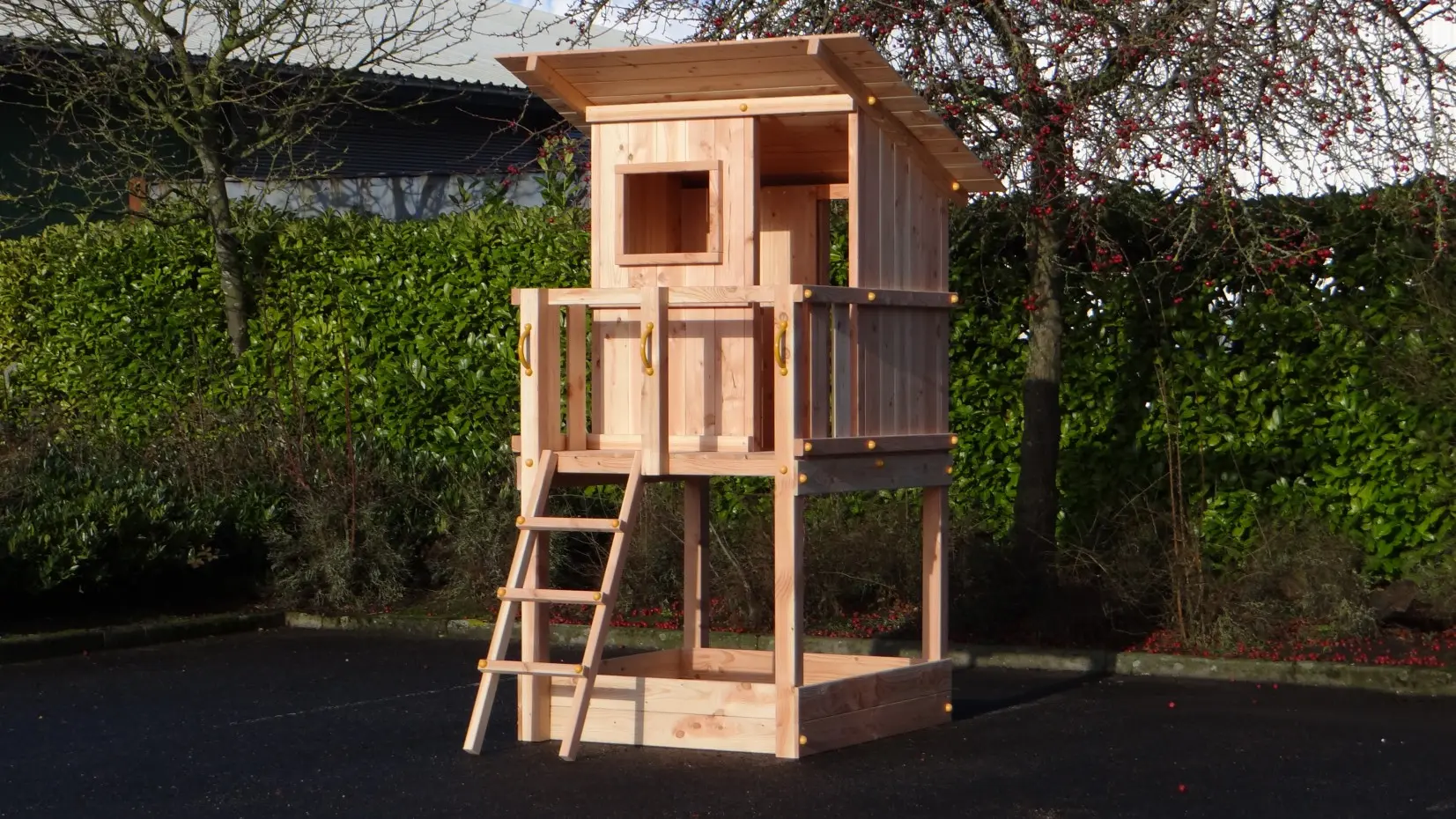 La tour de jeux Beach Hut bas en bois de Douglas est une belle et incroyablement amusante tour de jeux. Comme son nom l'indique, la tour de jeu Beach Hut est une tour de jeux basse. Cependant, l'équipment de jeu Beach Hut offre de nombreuses possibilités de jeu. Cette tour de jeux en bois basse pour l'extérieur est également très adaptée aux petits. Les enfants peuvent y entrer, y grimper, en descendre et jouer agréablement en dessous, de sorte qu'ils n'en ont jamais assez. À l'arrière de la maisonnette, il y a une troisième ouverture. Un élément supplémentaire peut y être fixé, comme un mur d'escalade avec corde (@ramp), un mur d'escalade avec pierres (@wall), un escalier (@steps) ou un pont de connexion avec filet d'escalade (@bridge).