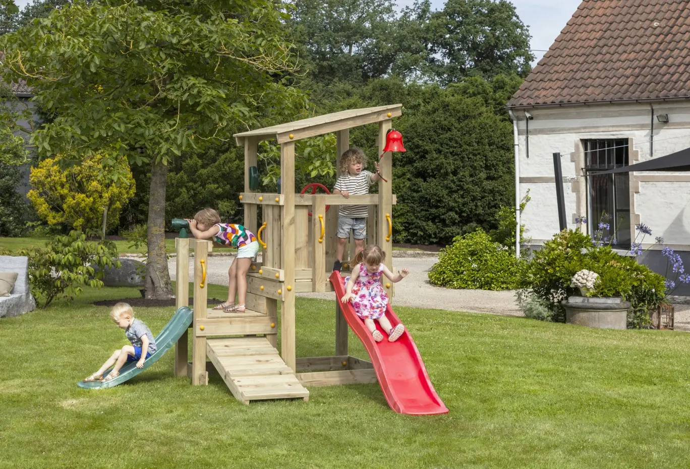 La tour de jeu Cascade de Blue Rabbit est une magnifique tour de jeu que les enfants aimeront immédiatement en raison de son apparence charmante. La tour de jeu Cascade Extra Bas a une plateforme de jeu de 90 cm et une de 60 cm. Les enfants de tous âges peuvent facilement accéder à la tour de jeu grâce à la rampe en bois inclinée. La Cascade assure beaucoup de plaisir en plein air!