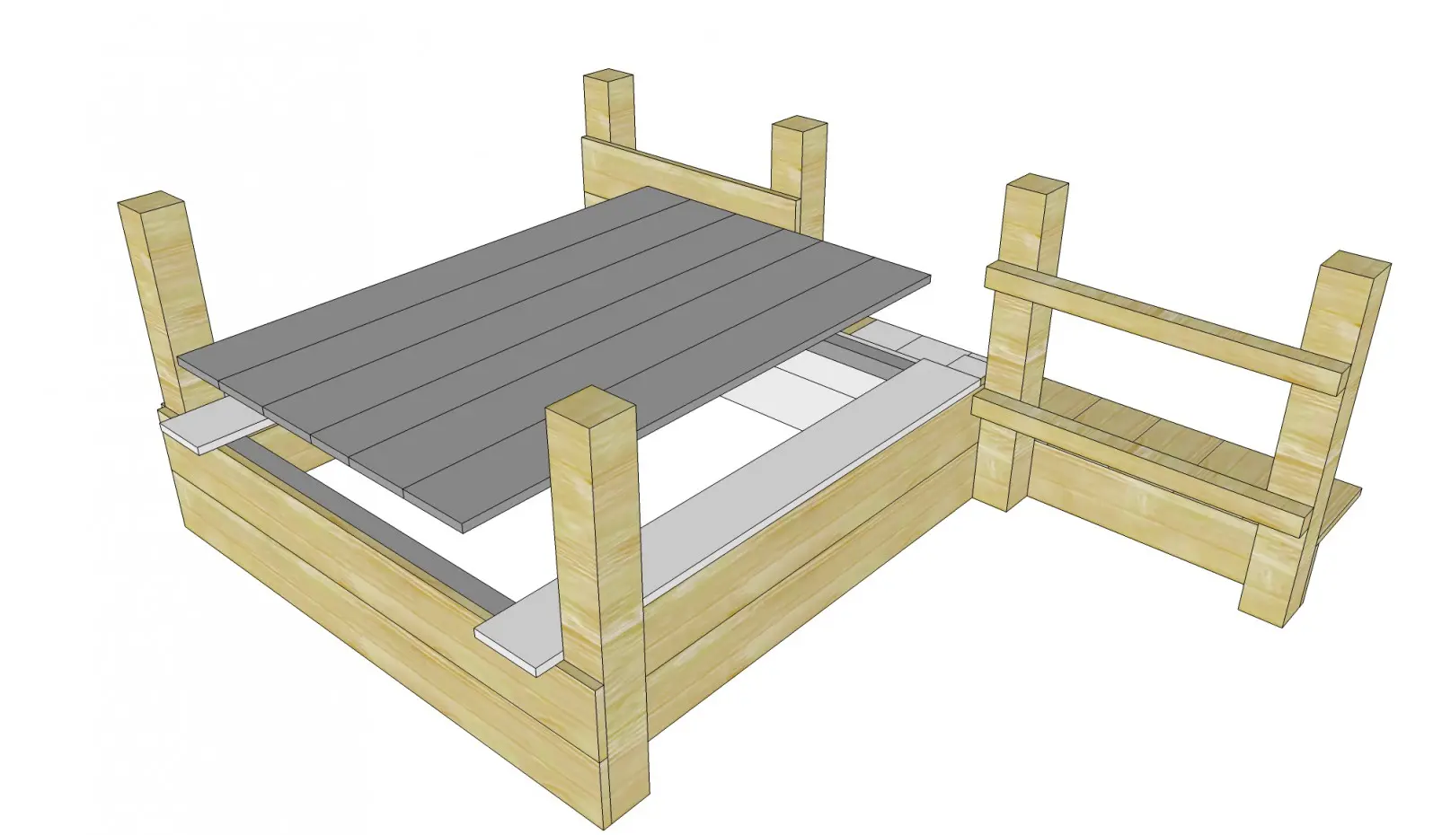 Couvercle de bac à sable pour la tour de jeu Blue Rabbit Palazzo. Protège le sable du bac à sable contre les nuisibles, les chats et la saleté. Les éléments livrés pour le bac à sable sont illustrés en blanc et gris.