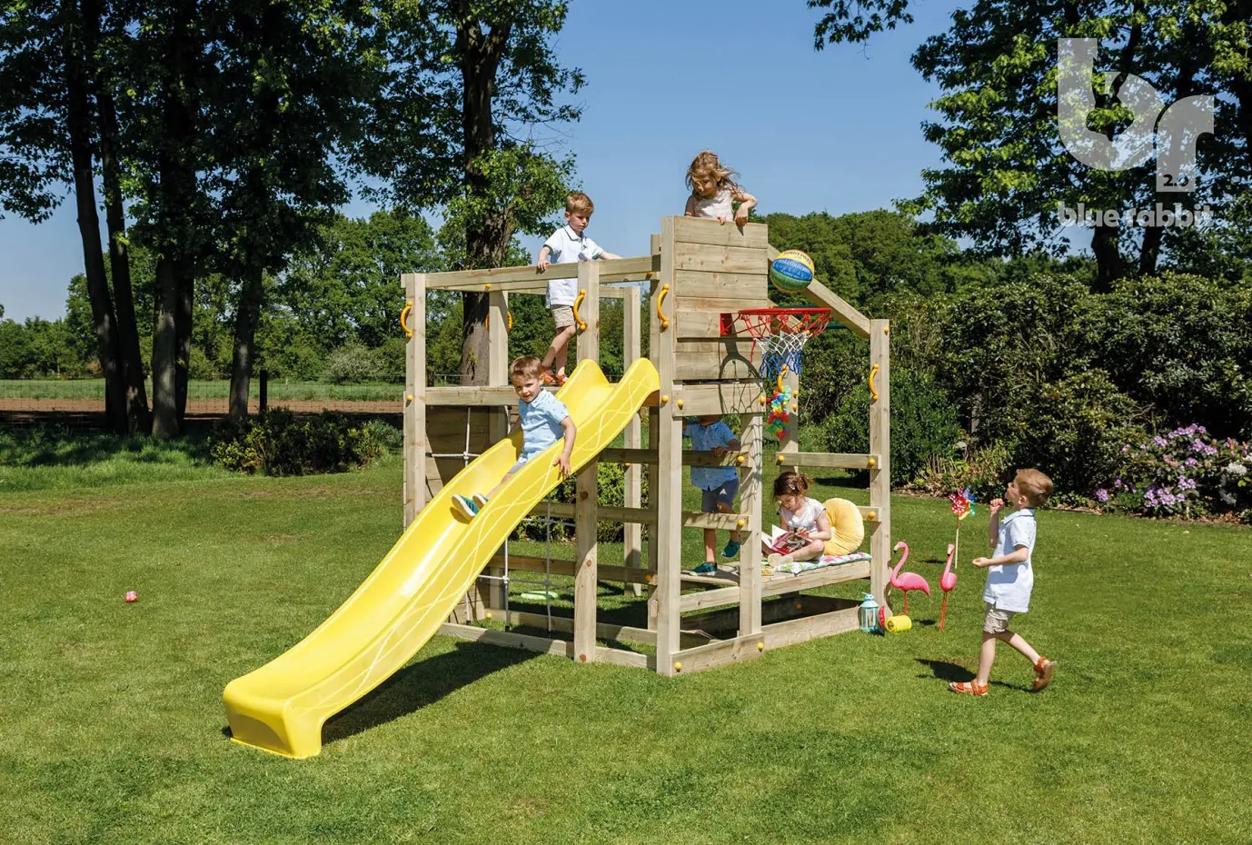 La plateforme supérieure est équipée d'un toboggan de série. Le toboggan se compose de 3 parties, faciles à assembler. La plateforme inférieure peut être utilisée comme marche vers les barres de singe, ou pour s'asseoir ou se coucher confortablement.