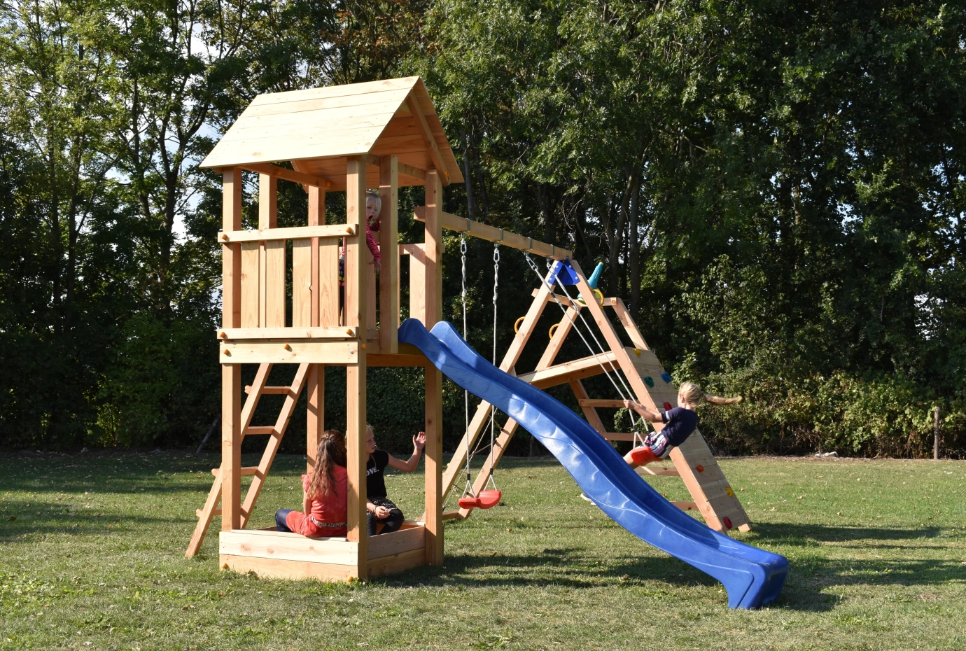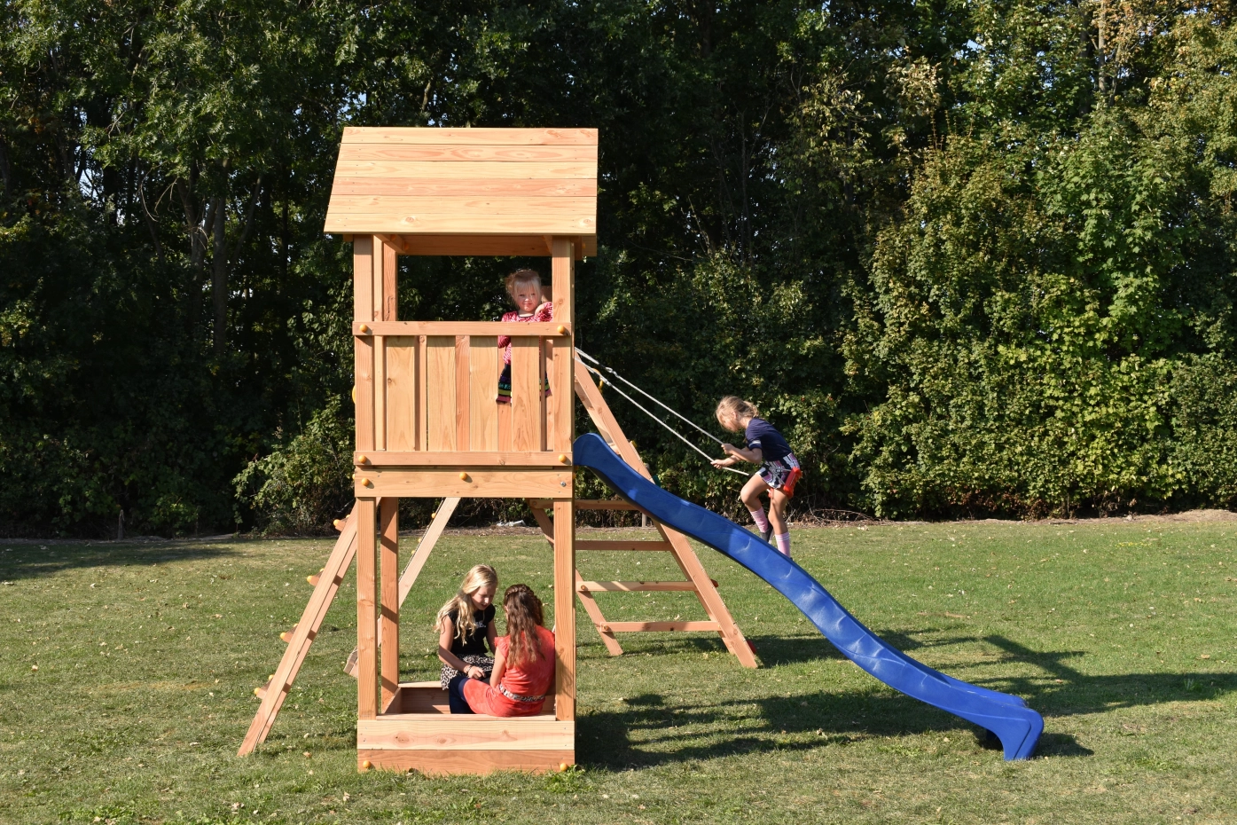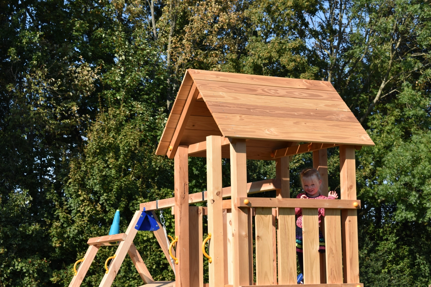 L’aire de jeux Kiosk en bois de Douglas avec toboggan et @Challenger est une magnifique tour de jeu durable, qui s’intègre facilement dans un jardin moderne ! Le @Challenger est entièrement équipé d’une balançoire, d’un mur d’escalade avec prises, d’un filet d’escalade et d’un petit escalier ! Le bois de Douglas, très résistant, est de plus en plus utilisé dans les jardins. Il possède de belles nervures flamboyantes et reste en bon état pendant 10 à 15 ans sans traitement. Cependant, il grise rapidement au soleil. Vous pouvez le protéger avec une lasure ou une huile pour Douglas.