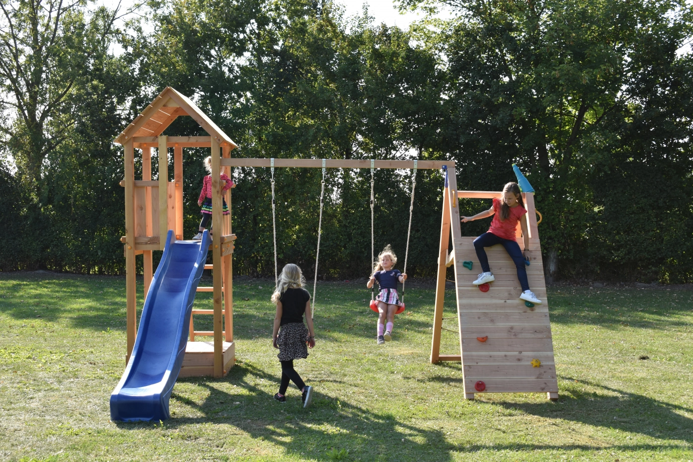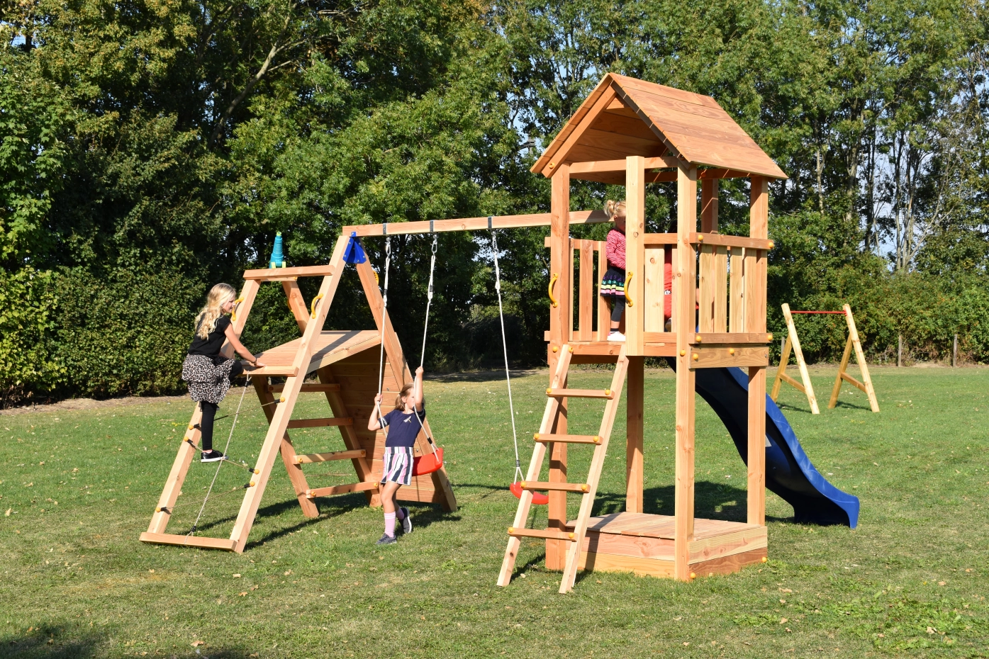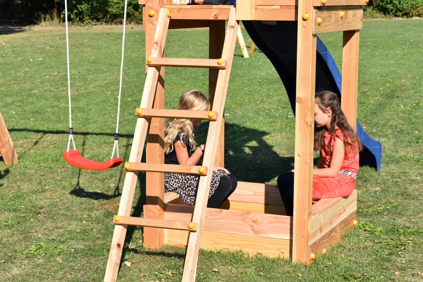L’aire de jeux Kiosk en bois de Douglas avec toboggan et @Challenger est une magnifique tour de jeu durable, qui s’intègre facilement dans un jardin moderne ! Le @Challenger est entièrement équipé d’une balançoire, d’un mur d’escalade avec prises, d’un filet d’escalade et d’un petit escalier ! Le bois de Douglas, très résistant, est de plus en plus utilisé dans les jardins. Il possède de belles nervures flamboyantes et reste en bon état pendant 10 à 15 ans sans traitement. Cependant, il grise rapidement au soleil. Vous pouvez le protéger avec une lasure ou une huile pour Douglas.
