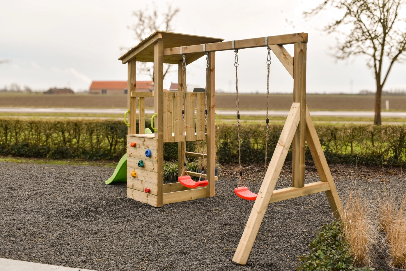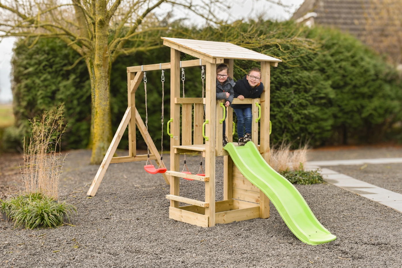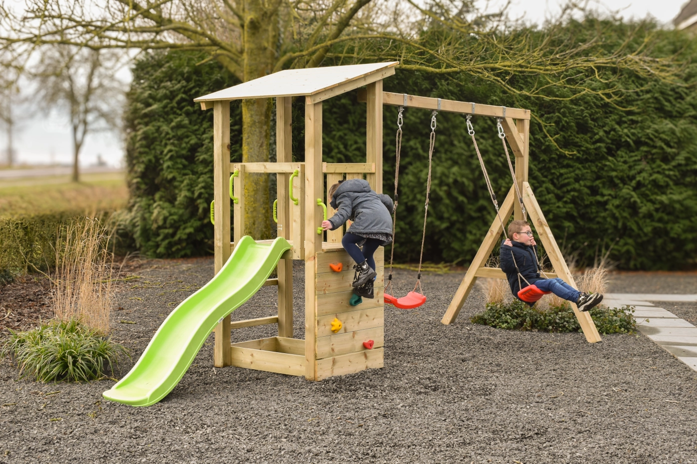 Le jeux Plan 90+ est une structure en bois robuste qui garantit des heures de jeu en plein air. Avec sa double balançoire, son toboggan en plastique et son mur d'escalade stimulant, il offre une grande diversité de jeux. La plateforme surélevée avec toit sert de cabane ou de poste d'observation. Le « + » dans Plan 90+ signifie une rambarde plus dense, assurant une sécurité renforcée. Jeux Plan 90+ est idéal pour les enfants aventureux dès 3 ans.