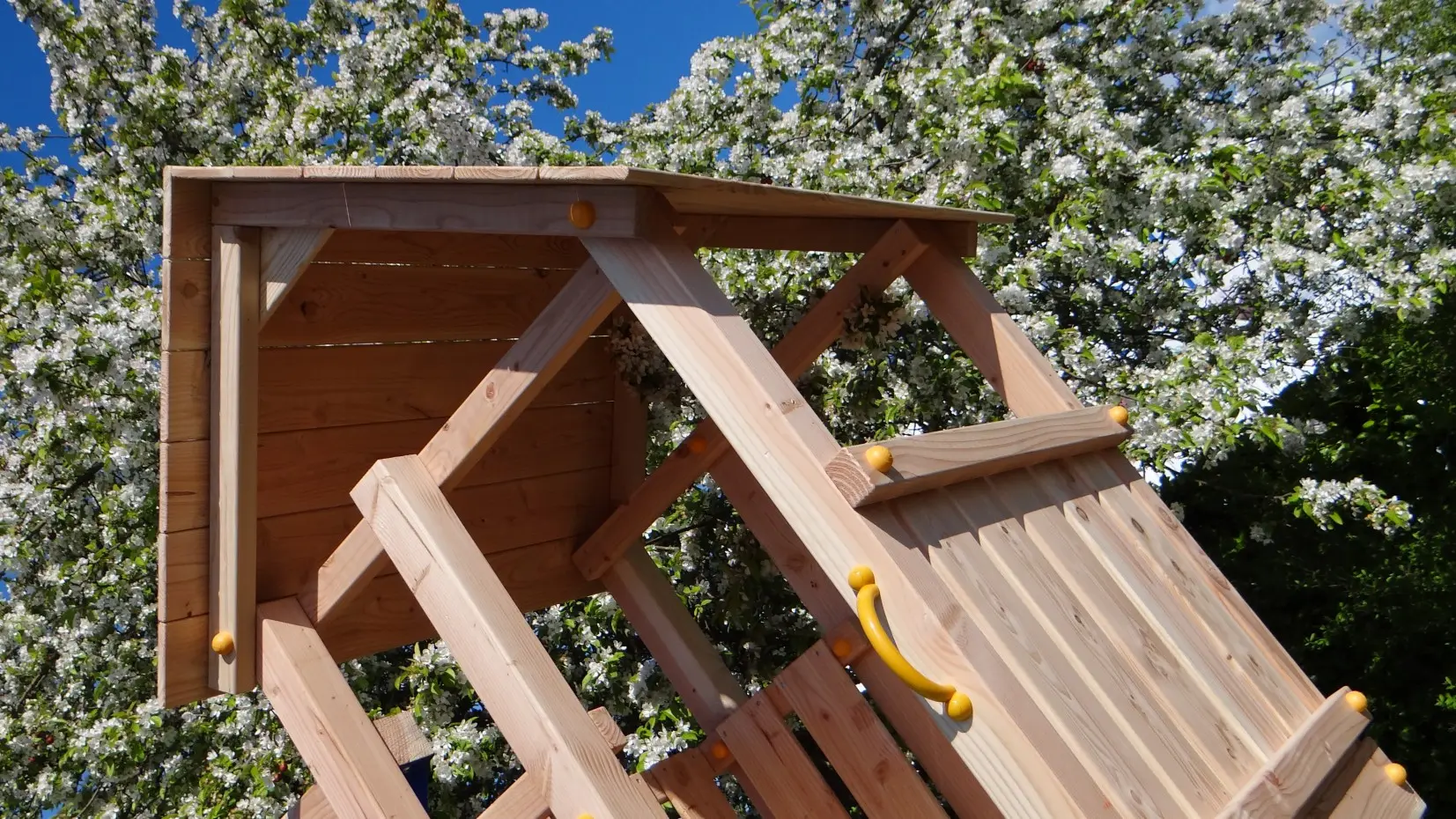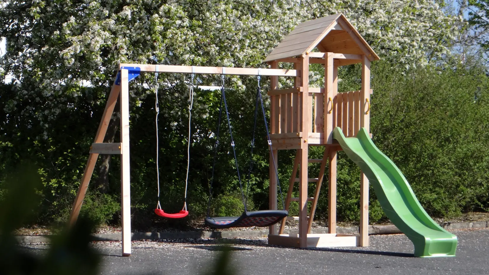 Tour de jeux Kiosk en bois de Douglas avec toboggan et balançoire est une belle et durable tour de jeux qui peut être installée de manière compacte et s'intègre parfaitement dans les jardins actuels ! Le bois de Douglas durable est de plus en plus utilisé dans le jardin. Il présente un beau veinage flamboyant et reste en bon état, non traité, pendant 10 à 15 ans. Cependant, il grisonne rapidement sous l'effet du soleil. Vous pouvez le protéger avec une lasure ou de l'huile de Douglas.