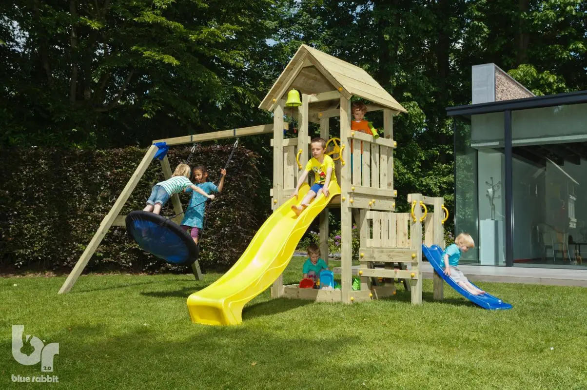 Tour de jeu Kiosk bas avec extension balançoire et toboggan, c'est tout ce qu'une tour de jeu doit être ! Une belle tour de jeu de Blue Rabbit avec un excellent rapport qualité-prix. La tour de jeu Kiosk a une hauteur de plateforme de 120 cm et est équipée d'une extension balançoire, d'un toboggan et d'une plateforme d'extension avec petit toboggan. La tour de jeu est facilement extensible avec divers éléments d'extension.