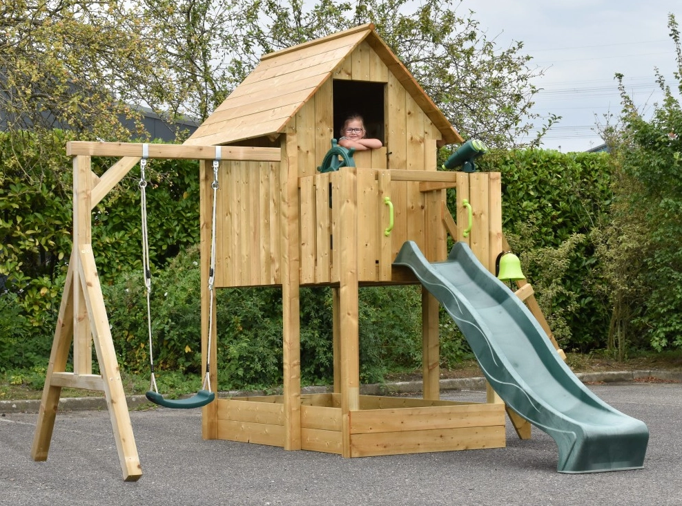 La cabane de jeux Dream 120 est le rêve de tous les enfants qui aiment jouer dehors. Cette cabane fermée dispose d’une plateforme à 120 cm de hauteur, ce qui permet d’être bien au sec et en hauteur. La cabane Dream est équipée d’un long toboggan de 230 cm. De plus, elle est pourvue d’une balançoire simple, adaptée pour une assise de balançoire ou une balançoire-nid. L’échelle, conçue pour les enfants, possède des marches plates et une rampe. Dans la partie inférieure de la structure, un grand espace peut accueillir un bac à sable ou servir de rangement pour d’autres jouets.