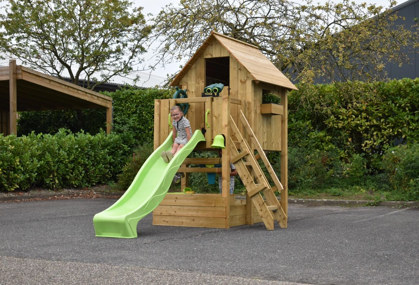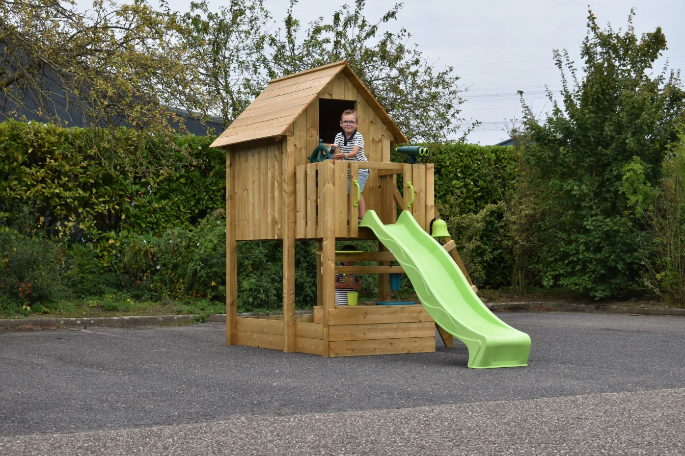 La cabane de jeu Dream 120 est le rêve de tous les enfants qui aiment jouer à l'extérieur. Cette maison fermée possède une plateforme à 120 cm de hauteur, ce qui permet de rester bien au sec et de profiter d'un long toboggan. L'escalier, conçu pour les enfants, dispose de marches plates et est équipé de deux rampes. Sous la structure, il y a un grand espace pour un bac à sable ou pour ranger proprement d'autres jouets en vrac.