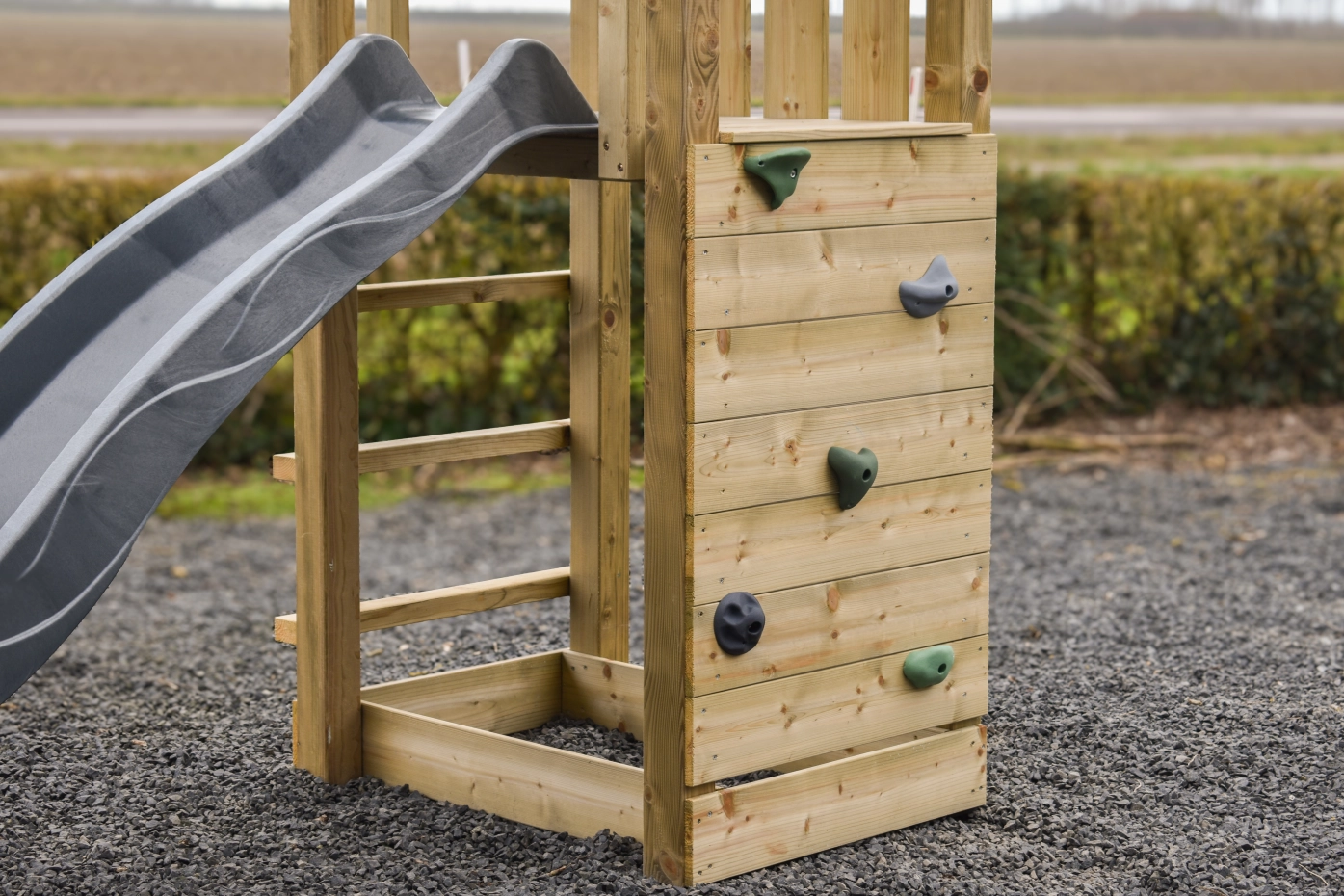 Cet ensemble de jeux en bois complet, Plan 120, offre aux enfants une expérience de jeu stimulante et variée. La maisonnette avec son toit solide et sa rambarde fermée assure un espace de jeu sécurisé et abrité, tandis que les poignées offrent un soutien supplémentaire lors de l'escalade. Le long toboggan permet une descente rapide, et le mur d'escalade avec prises encourage les enfants à développer leurs compétences de grimpe.