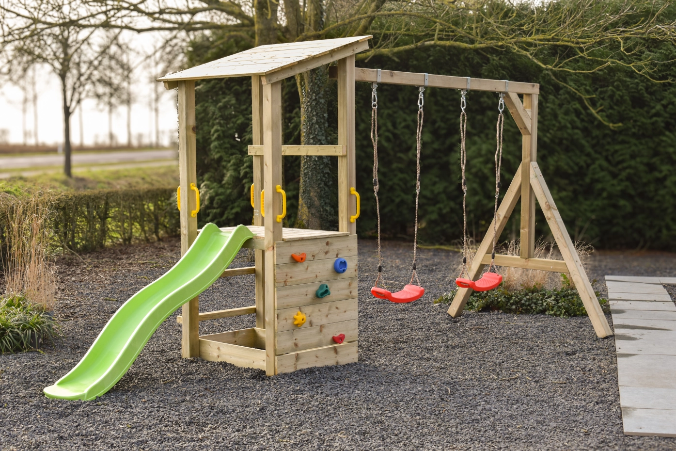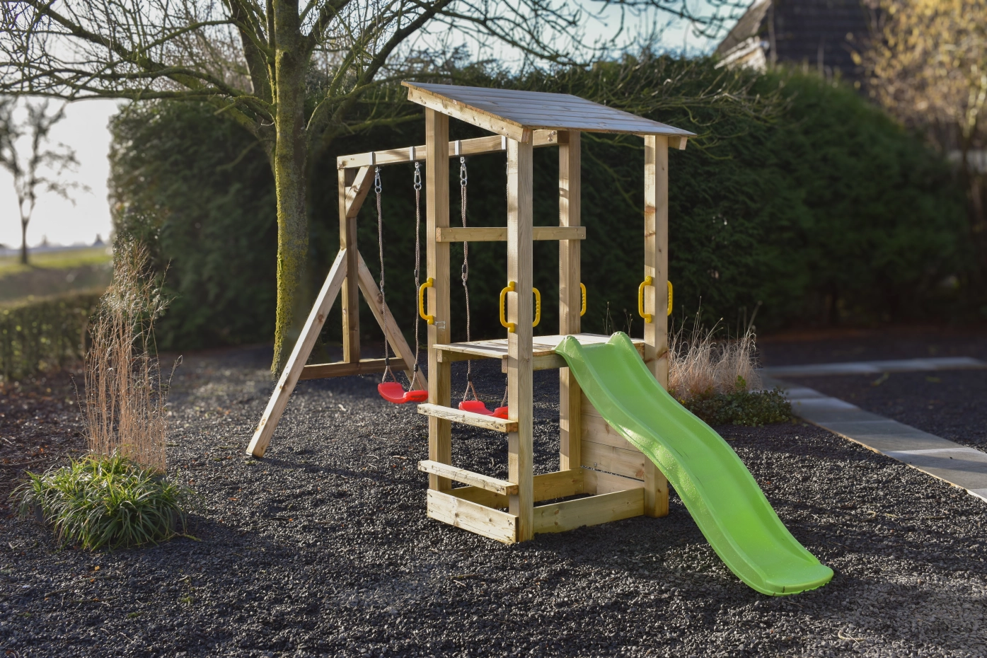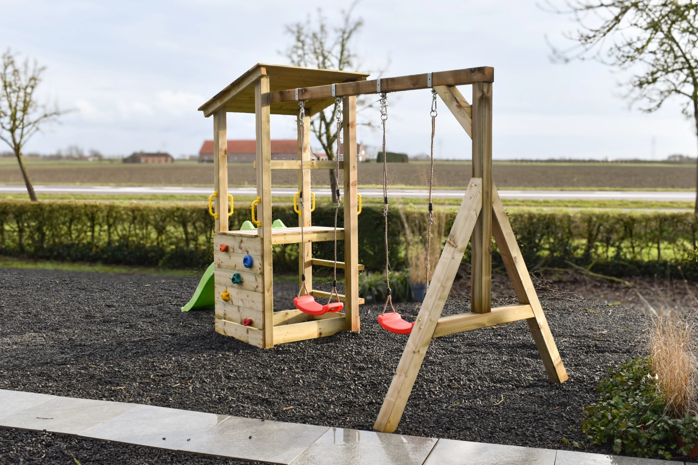 Structure de jeu Plan 90 combine escalade, glissade et balançoire dans un seul module d’aventure. La maisonnette en bois robuste de la structure de jeu Plan 90 avec rambarde offre un espace de jeu sûr et accueillant, tandis que le toboggan assure une descente rapide et en douceur.