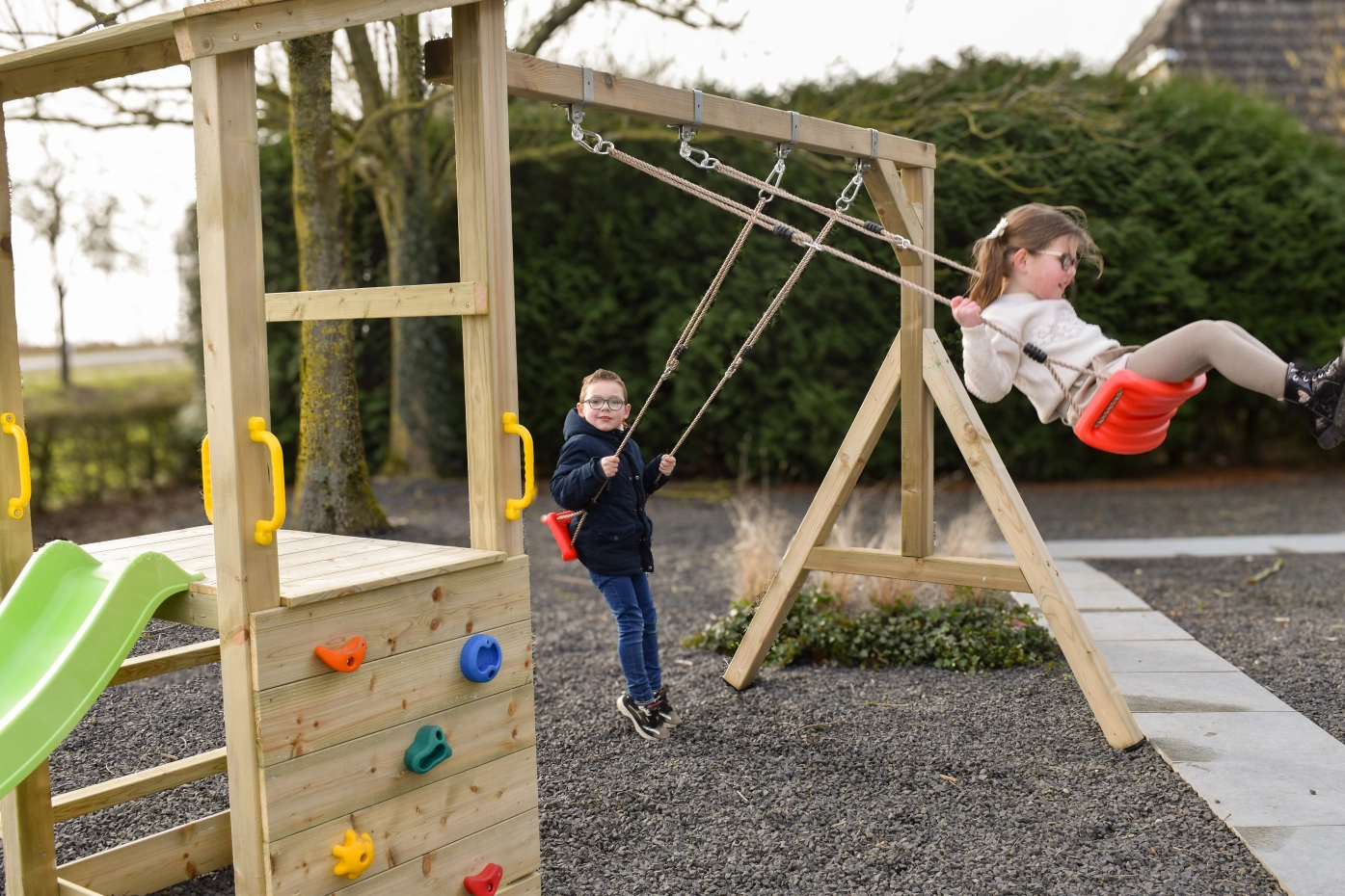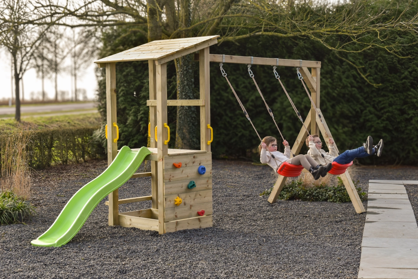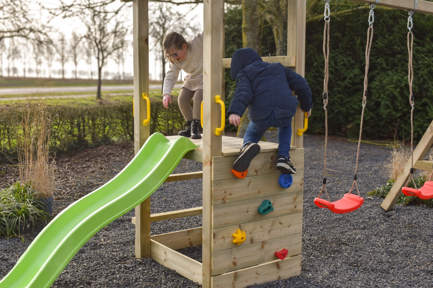 Structure de jeu Plan 90 combine escalade, glissade et balançoire dans un seul module d’aventure. La maisonnette en bois robuste de la structure de jeu Plan 90 avec rambarde offre un espace de jeu sûr et accueillant, tandis que le toboggan assure une descente rapide et en douceur.