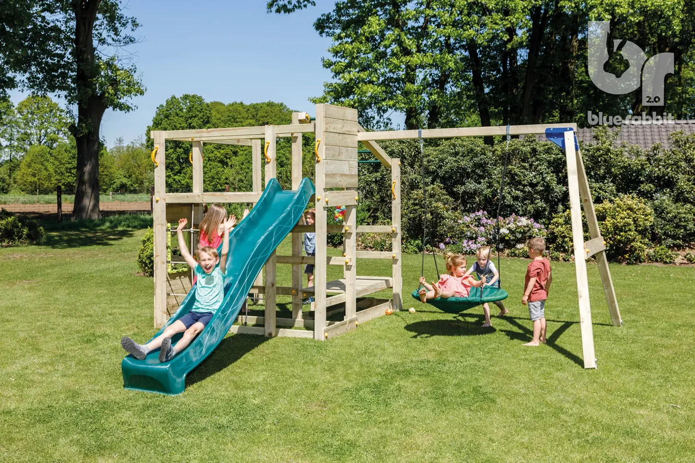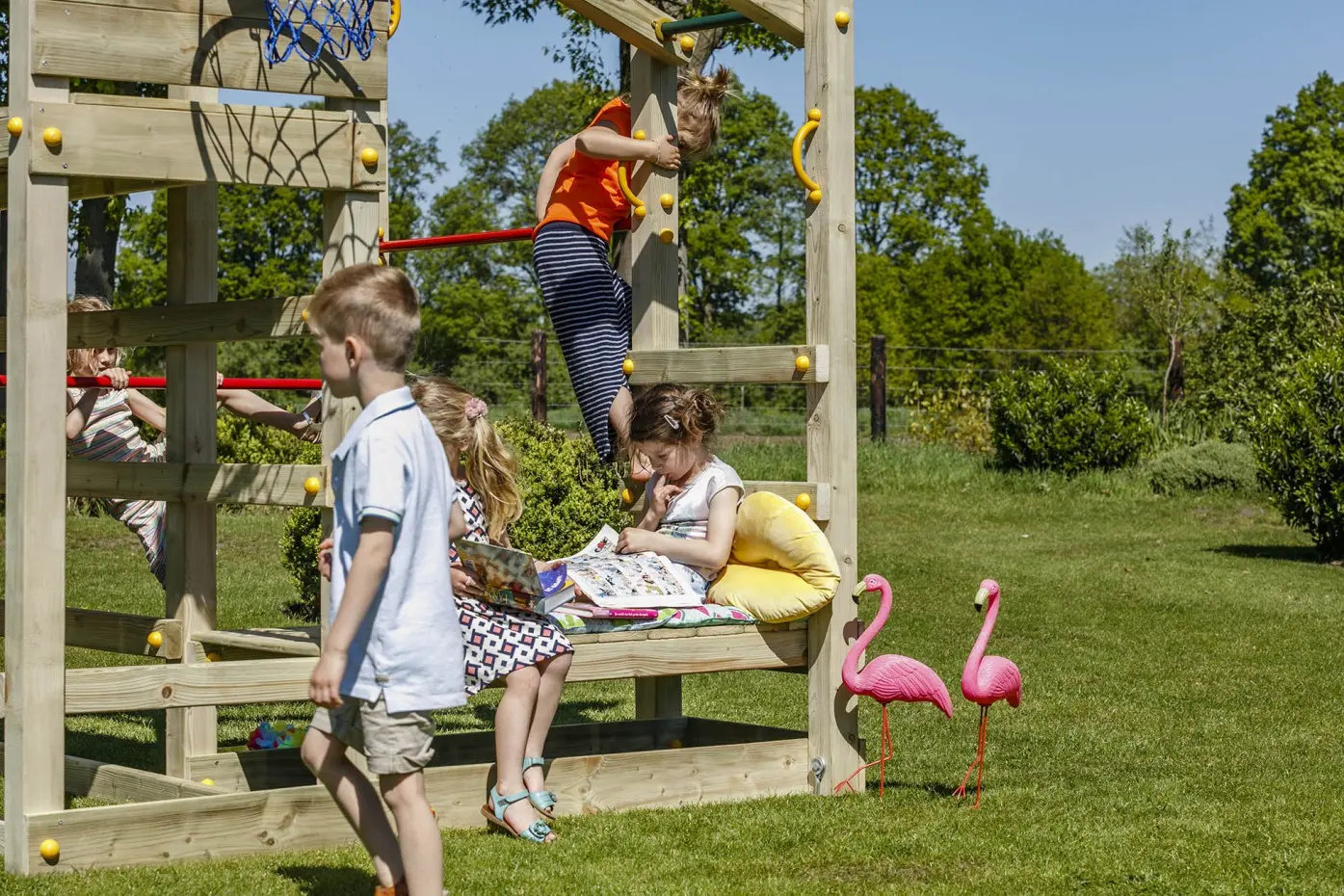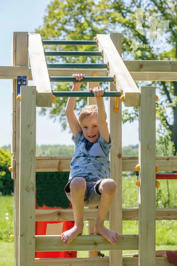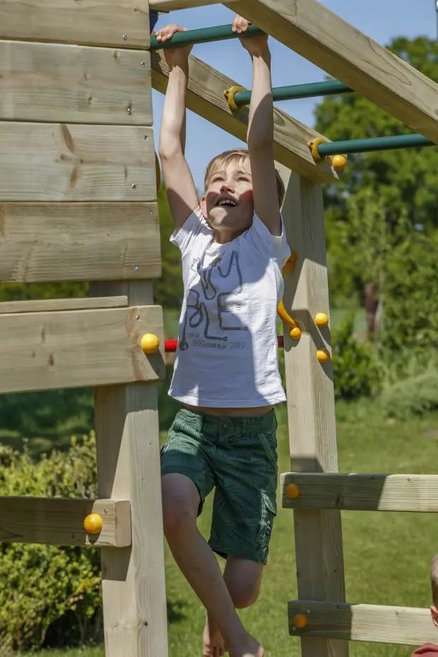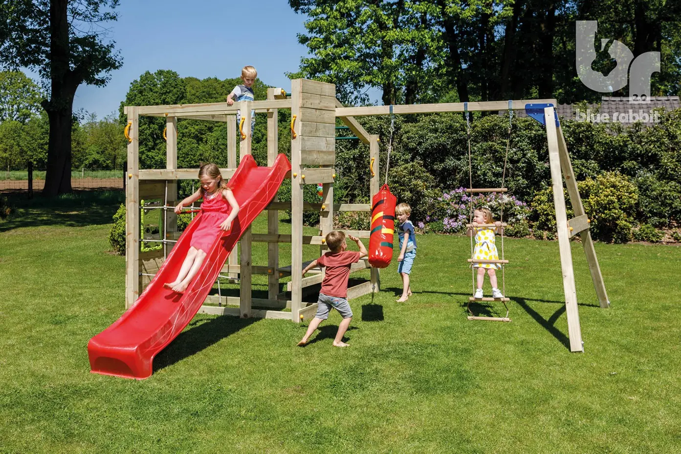 La balançoire @Swing complète l'ensemble. Des accessoires de jeu comme un sac de boxe, des anneaux de gymnastique, une échelle de corde et un siège de balançoire peuvent être facilement commandés en supplément!