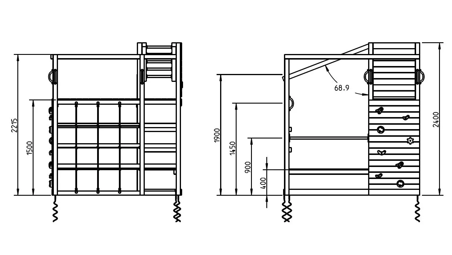 La belle structure d'escalade Crossfit dispose de deux plateformes de jeu reliées entre elles. La structure est équipée de murs d'escalade et de cadres: un mur d'escalade avec des pierres colorées, un mur d'escalade avec un filet d'escalade. Même une échelle de singe avec des barres de singe. De plus, la structure comprend deux barres de gymnastique et plusieurs marches d'escalade.