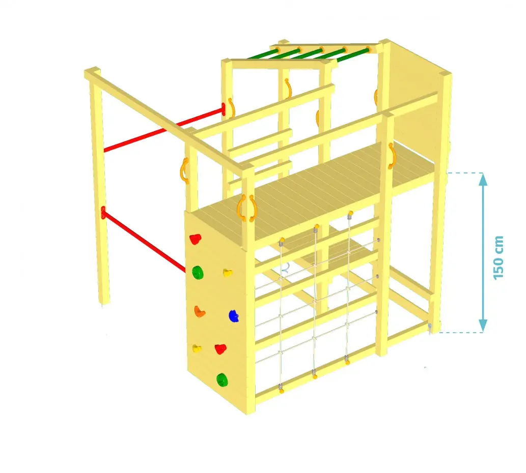 Voici l'une des plus belles versions de la tour d'escalade Crossfit. Une tour d'escalade stimulante en bois de Douglas. La grande tour d'escalade a 2 plateformes. La plate-forme de jeu supérieure est équipée d'un toboggan. Le toboggan est divisé en trois parties. La plate-forme inférieure sert d'espace pour s'asseoir ou pour s'allonger et rêver.