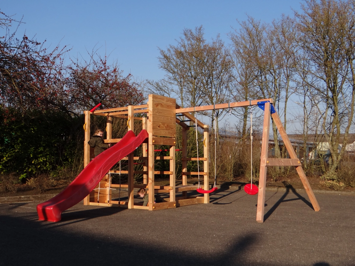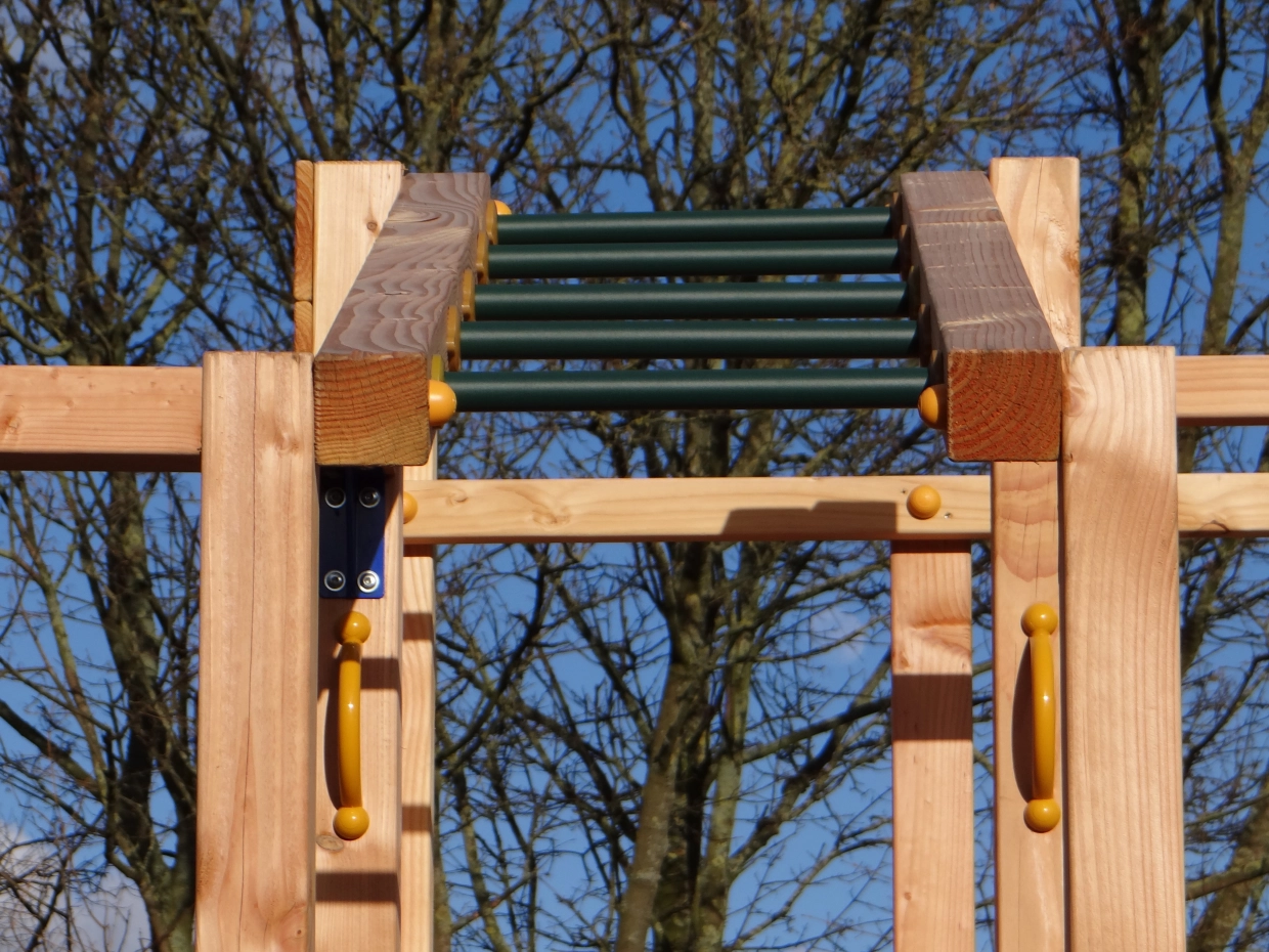Le cadre d'escalade est équipé d'un filet d'escalade, d'un pont de singe et d'un mur d'escalade avec des pierres d'escalade colorées, deux barres de culbute en métal et des cadres d'escalade. La balançoire @Swing jointe offre un défi supplémentaire aux enfants. Toutes sortes d'accessoires peuvent être fixés à la balançoire @Swing : punching ball, anneaux de gymnastique, échelle de corde ou siège de balançoire. Ces accessoires peuvent être facilement commandés.