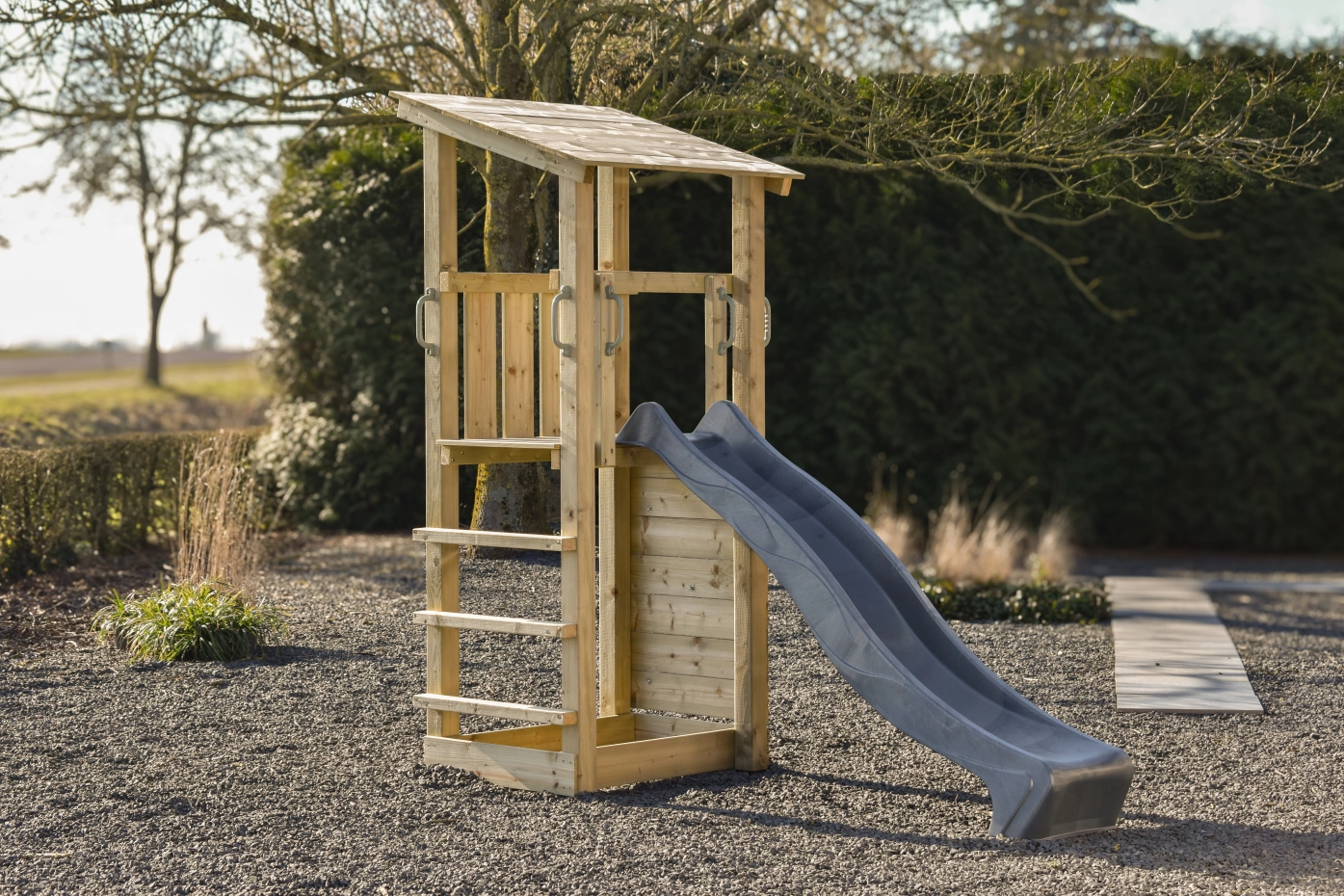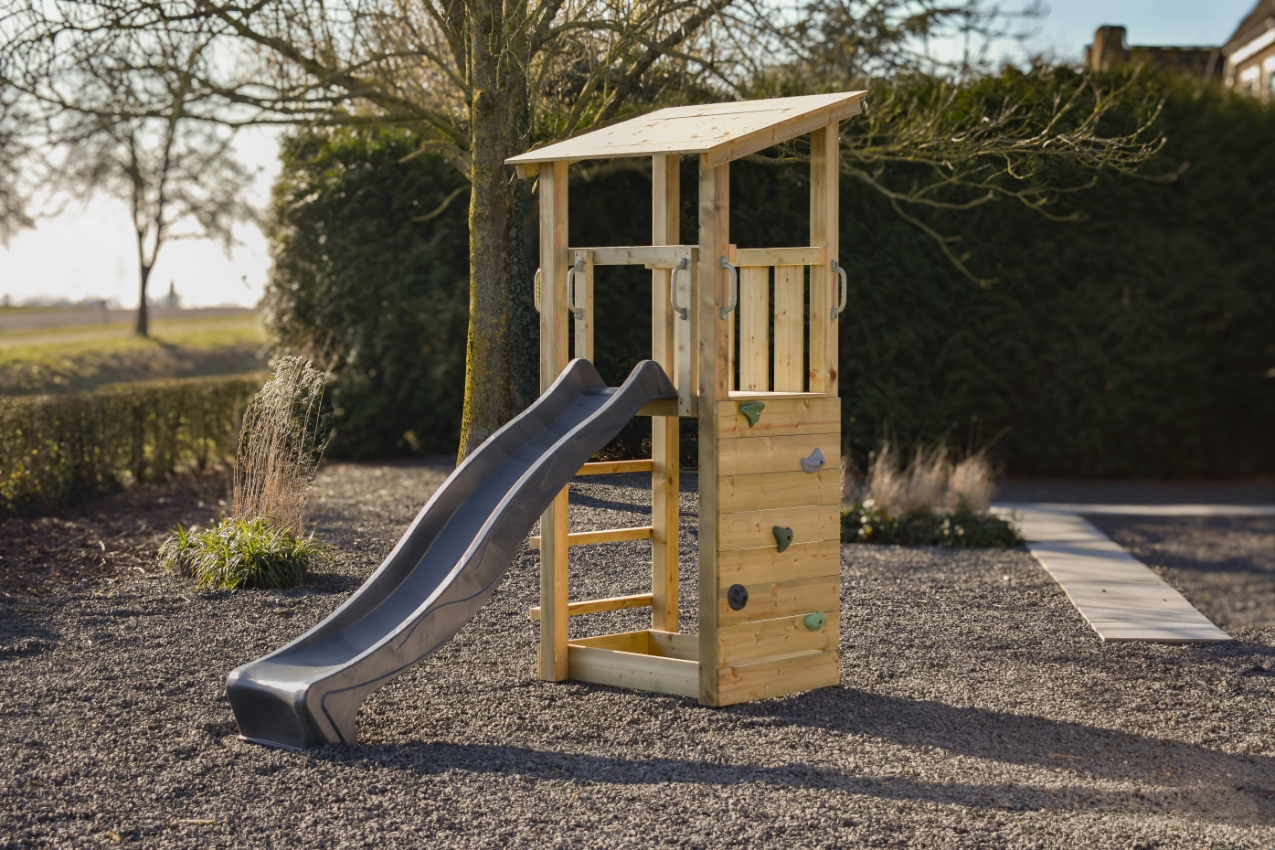 Les enfants peuvent accéder à la plateforme située à 120 cm de hauteur grâce à l’échelle avec des marches solides. La rambarde fermée garantit une sécurité accrue et crée un coin cosy pour jouer, rêver ou imaginer des missions secrètes. Le toboggan permet une descente rapide et amusante, tandis que les poignées facilitent et sécurisent l'escalade.