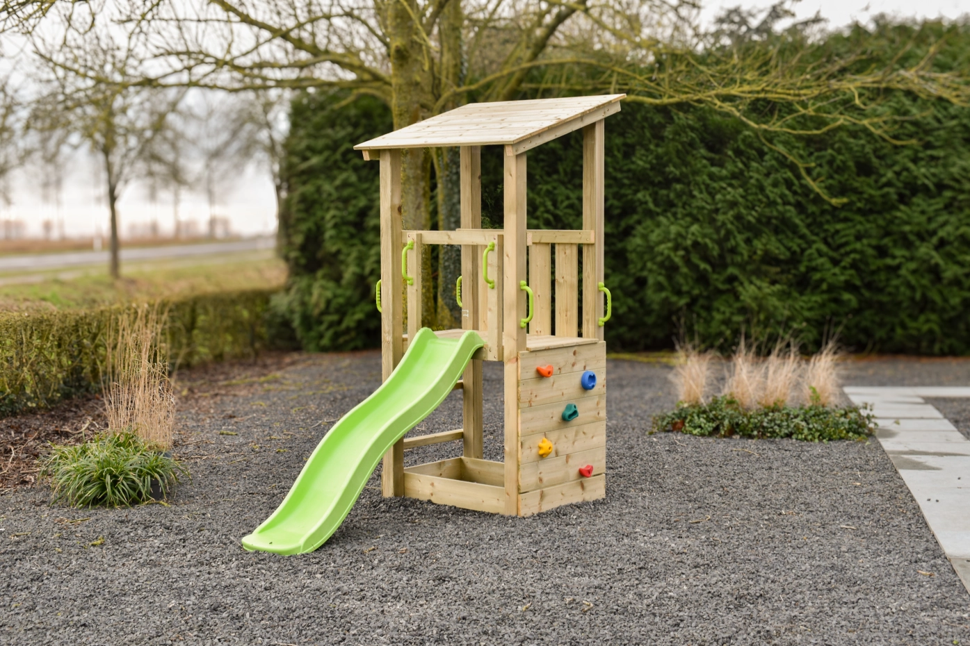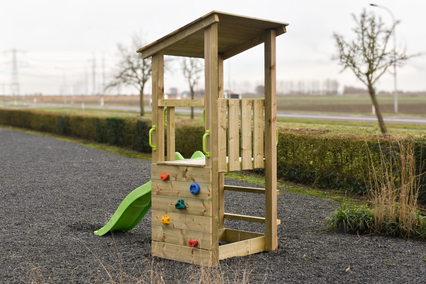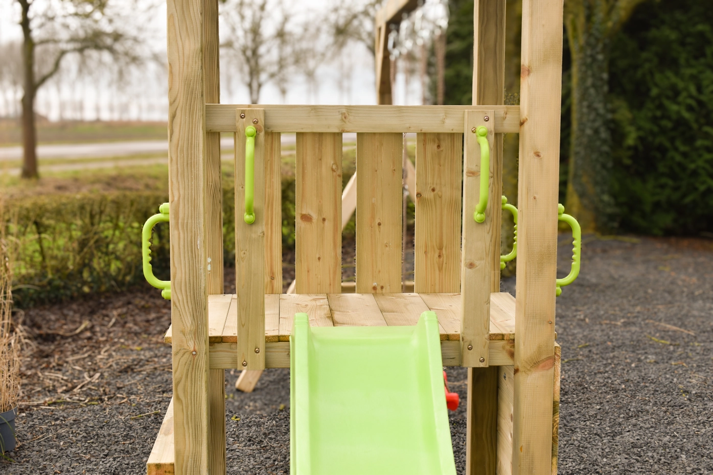 Avec une rambarde fermée autour de la plateforme, la maisonnette Plan 90+ assure une sécurité supplémentaire pendant le jeu. Les poignées colorées offrent une meilleure prise, permettant aux enfants de grimper facilement à l’échelle solide. Un toboggan amusant vient compléter l’ensemble pour une descente rapide et ludique.