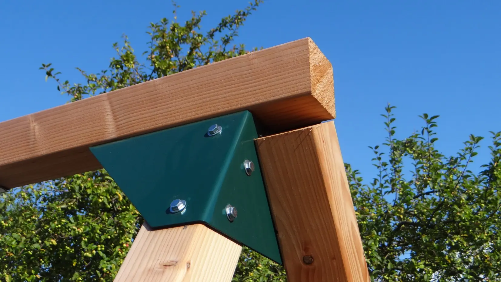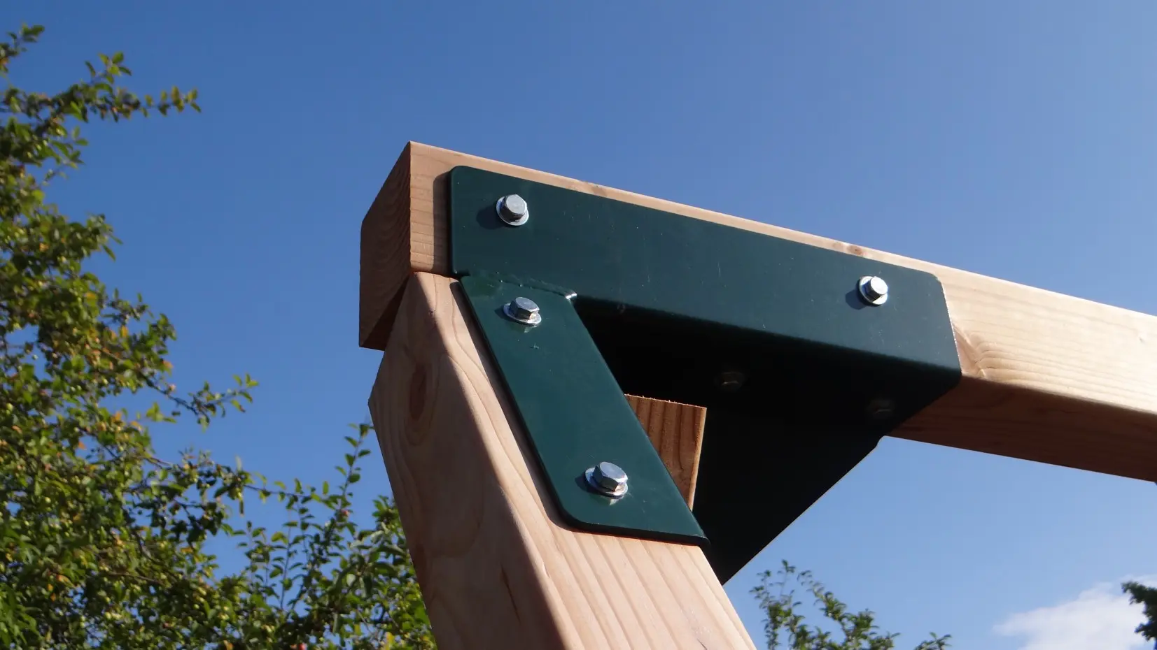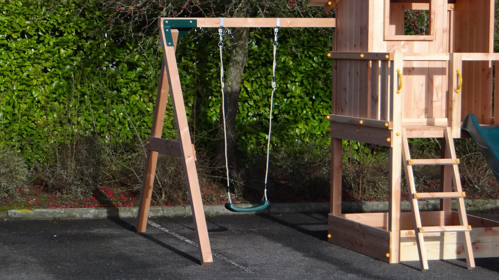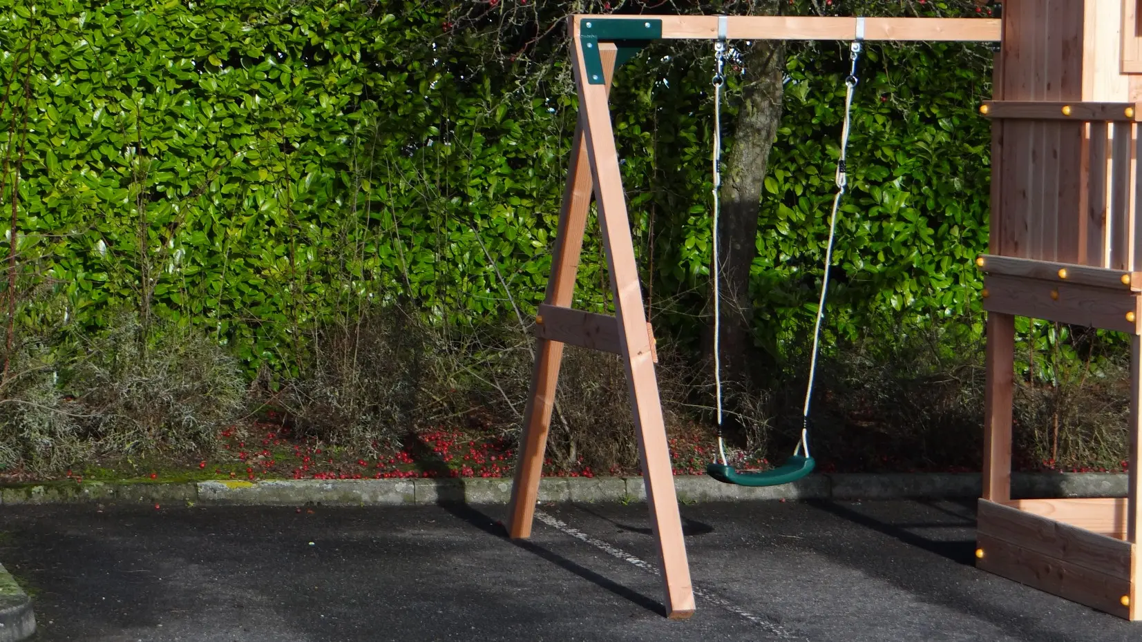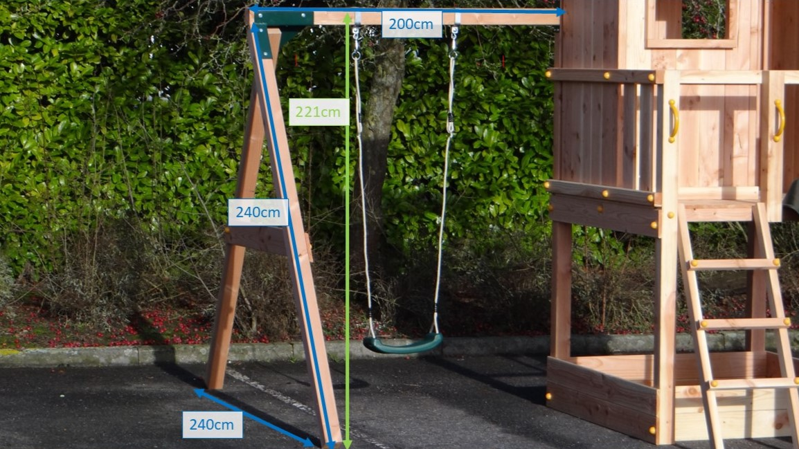 - L'angle entre les pieds et la poutre est droit, ce qui permet à la balançoire de prendre peu de place tout en restant stable.