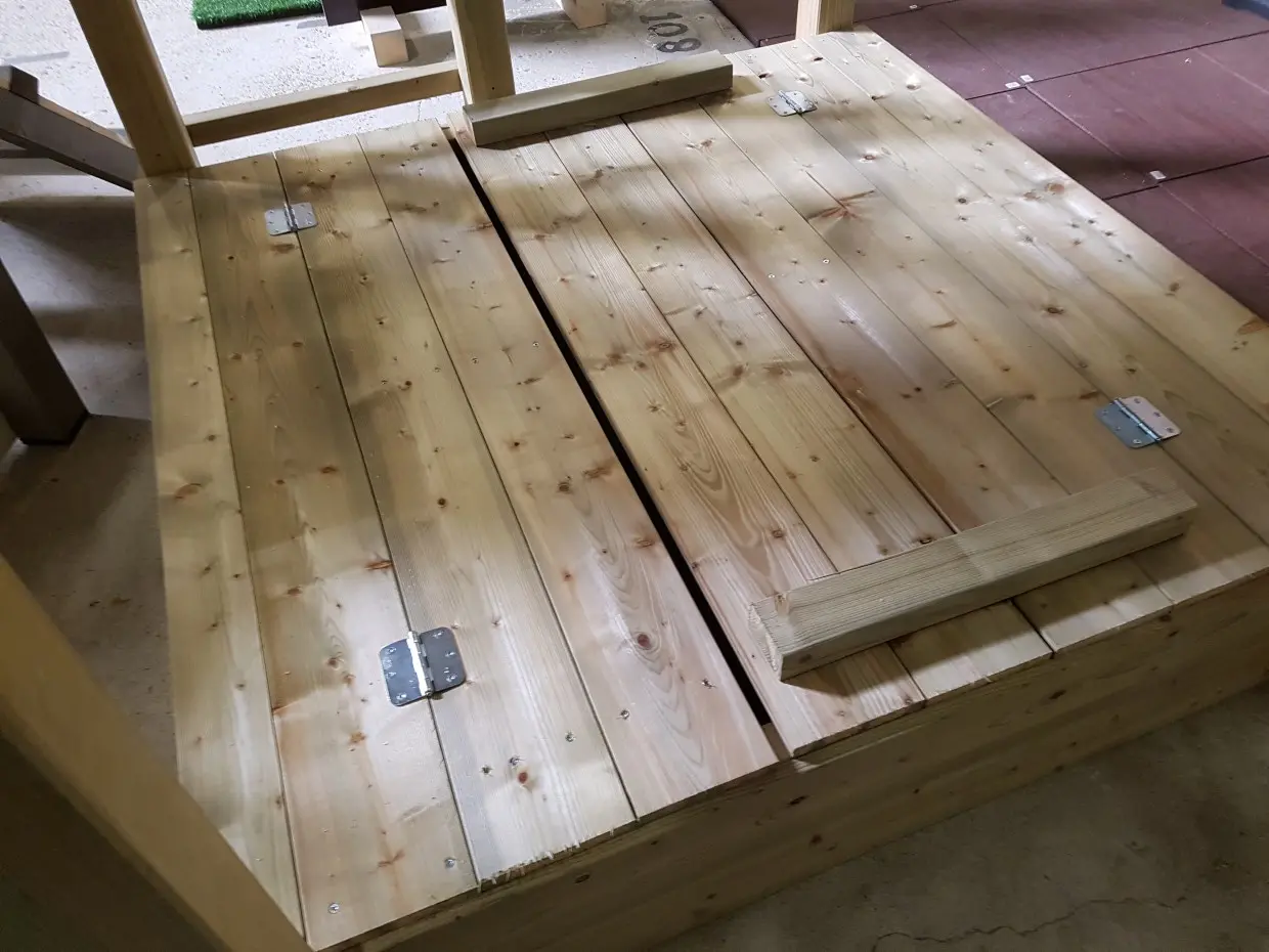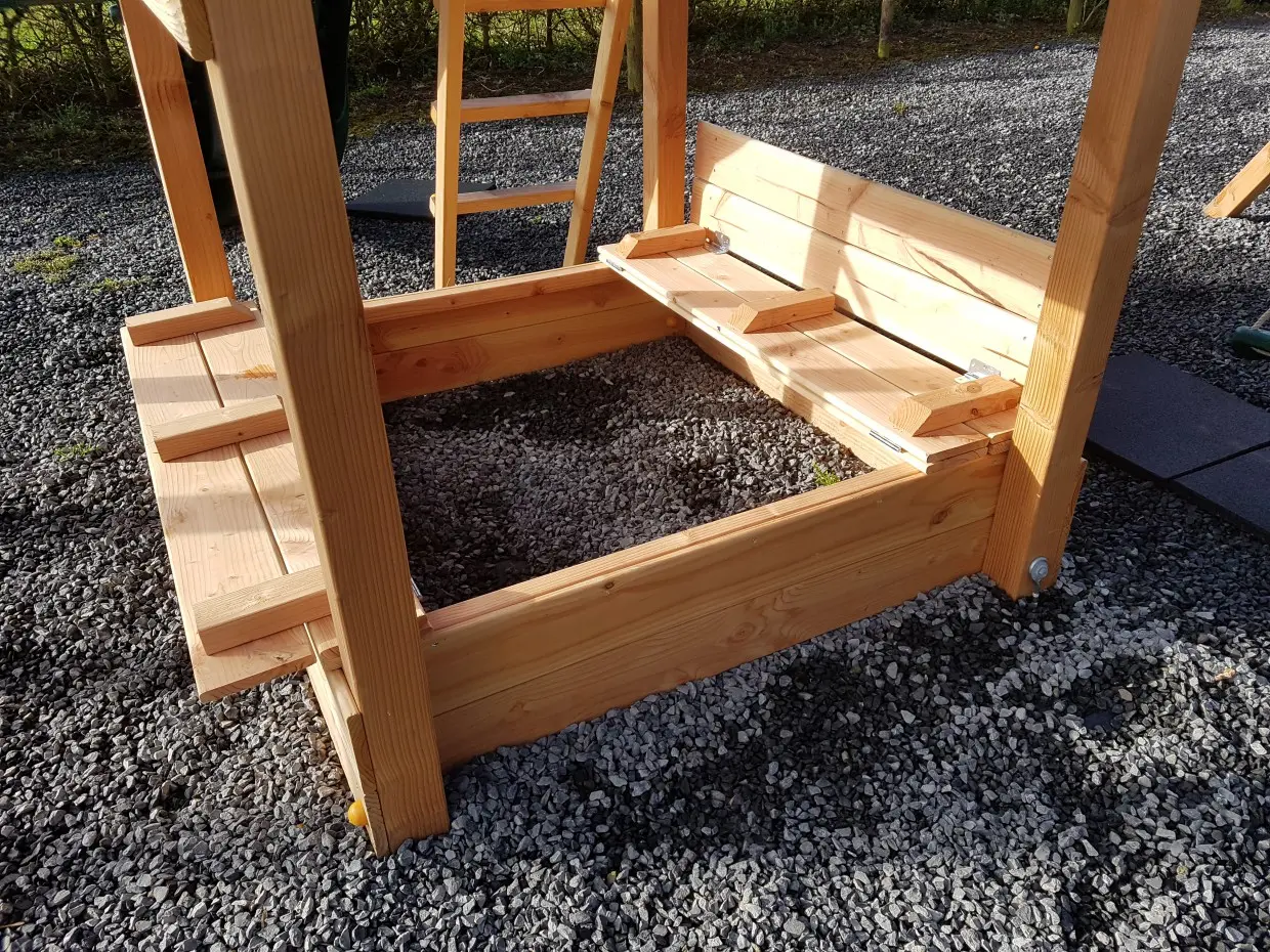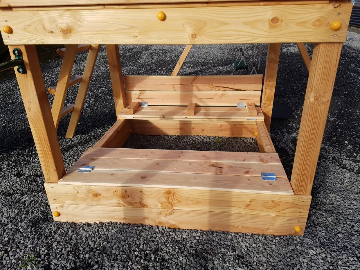 Couvercle de bac à sable pour la tour de jeu Blue Rabbit Pagoda. Il protège le sable, par exemple, des chats. Le couvercle du bac à sable se déplie facilement en un banc avec dossier d'un côté et un banc sans dossier de l'autre côté du bac à sable.