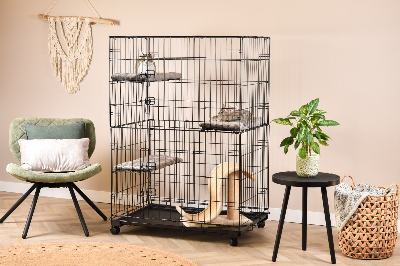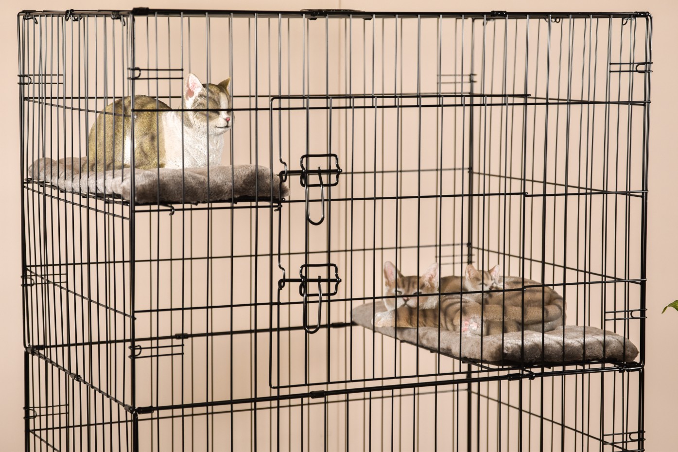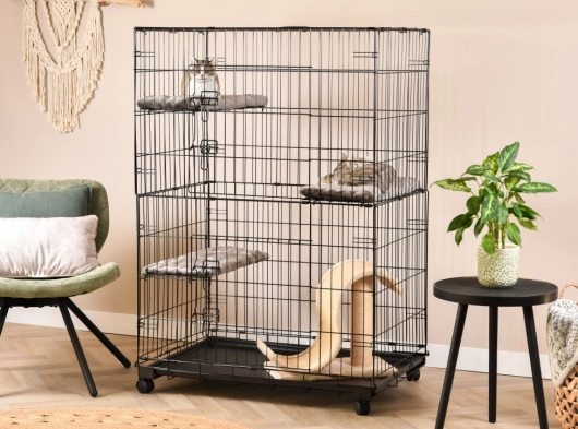 - La cage pour chat est équipée de 3 étagères dans les coins, dont la hauteur est facilement réglable