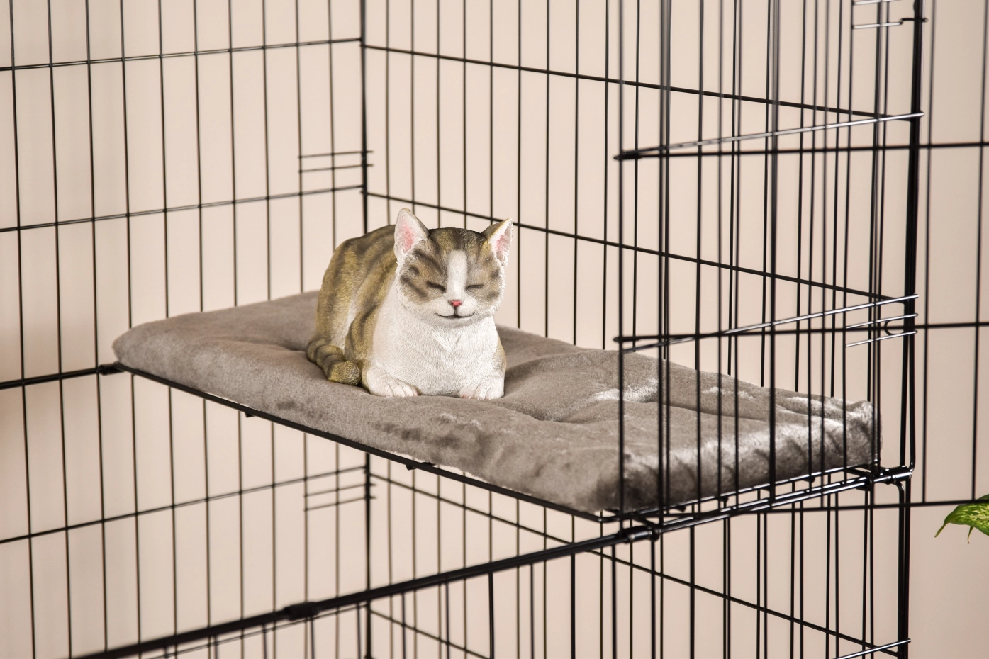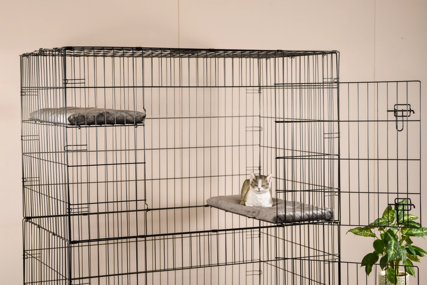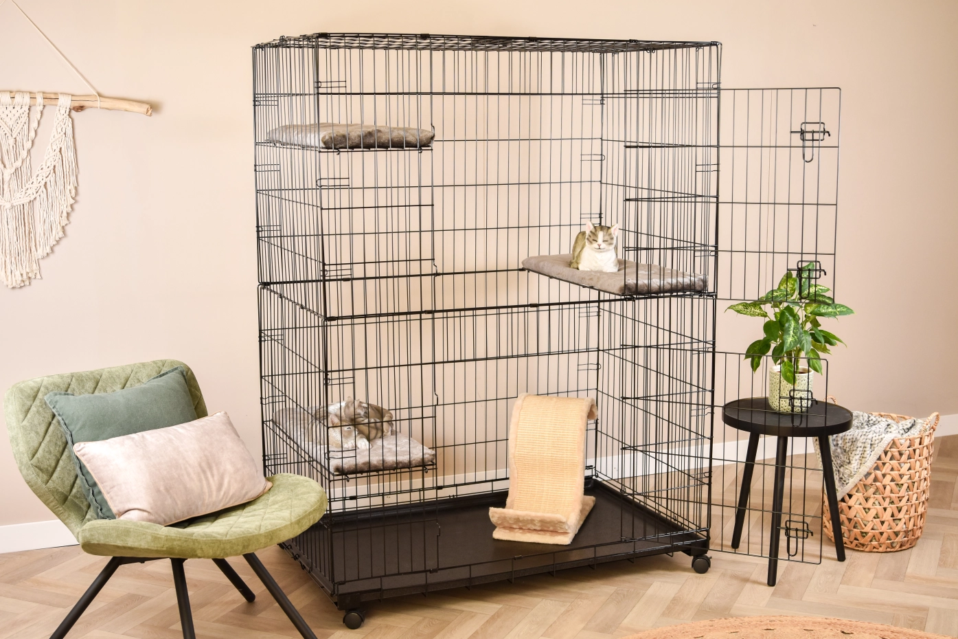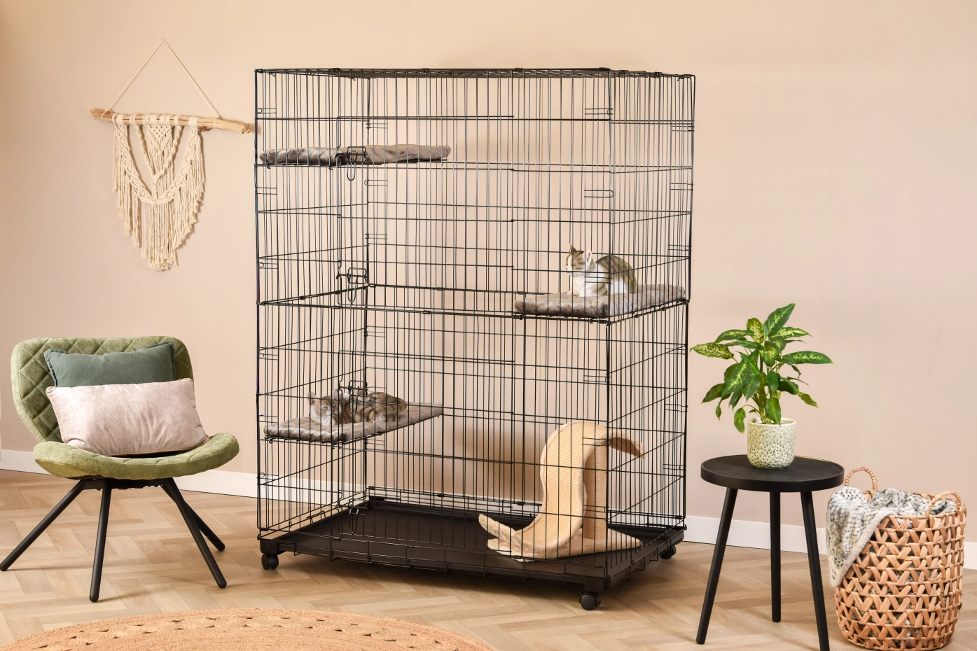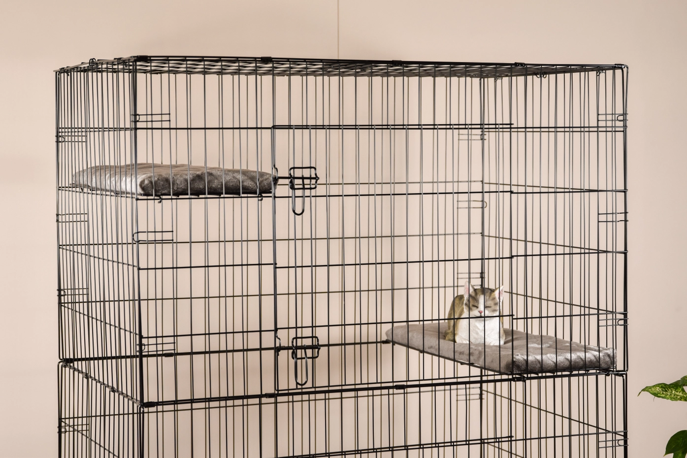 Cette grande cage pour chats dispose de trois plateformes différentes avec coussins inclus. Les plateformes de repos sont réglables individuellement en hauteur, ce qui permet d’adapter facilement l’aménagement aux besoins de votre chat.