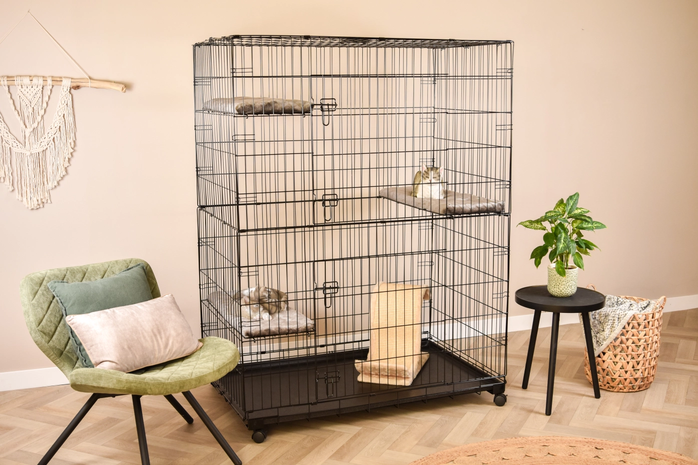 - La cage pour chat est équipée de 3 étagères dans les coins, dont la hauteur est facilement réglable