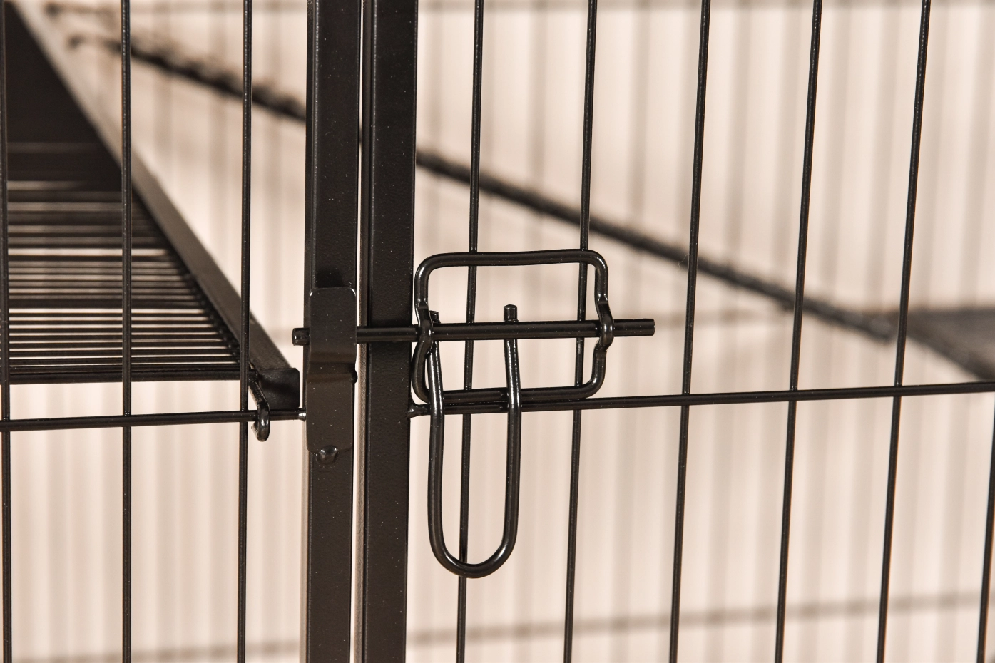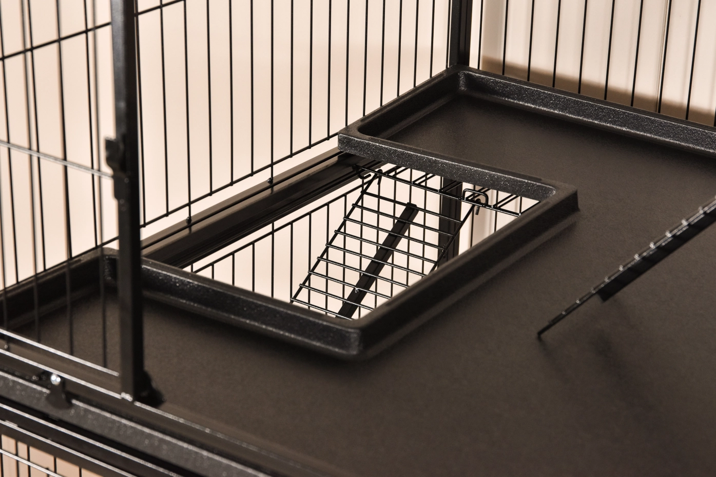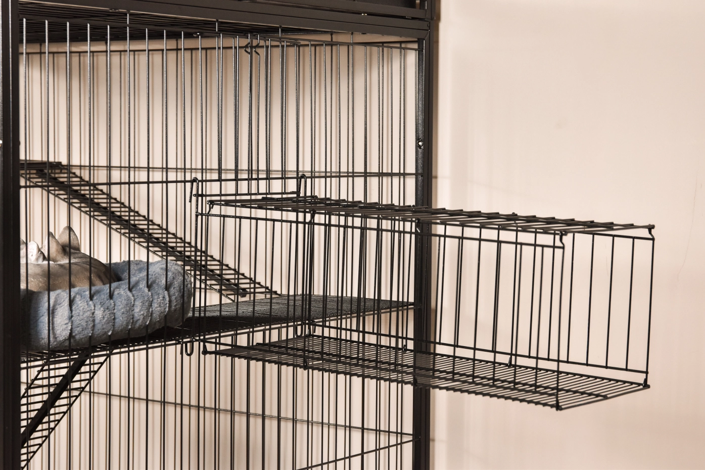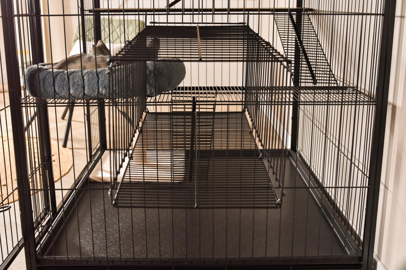 - Cage à chat robuste avec des barreaux revêtus d'une finition martelée noire.