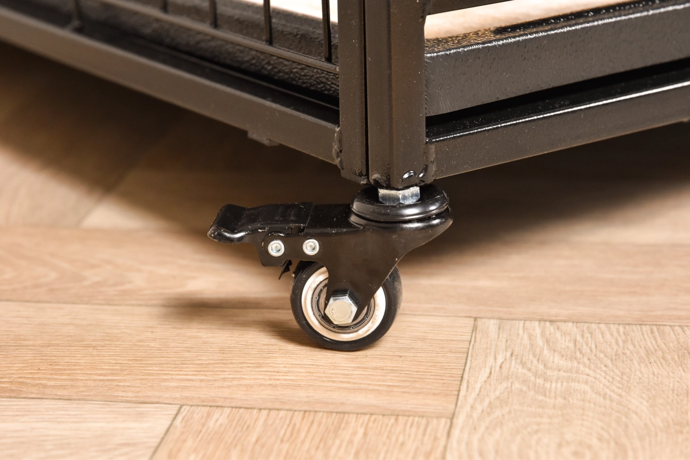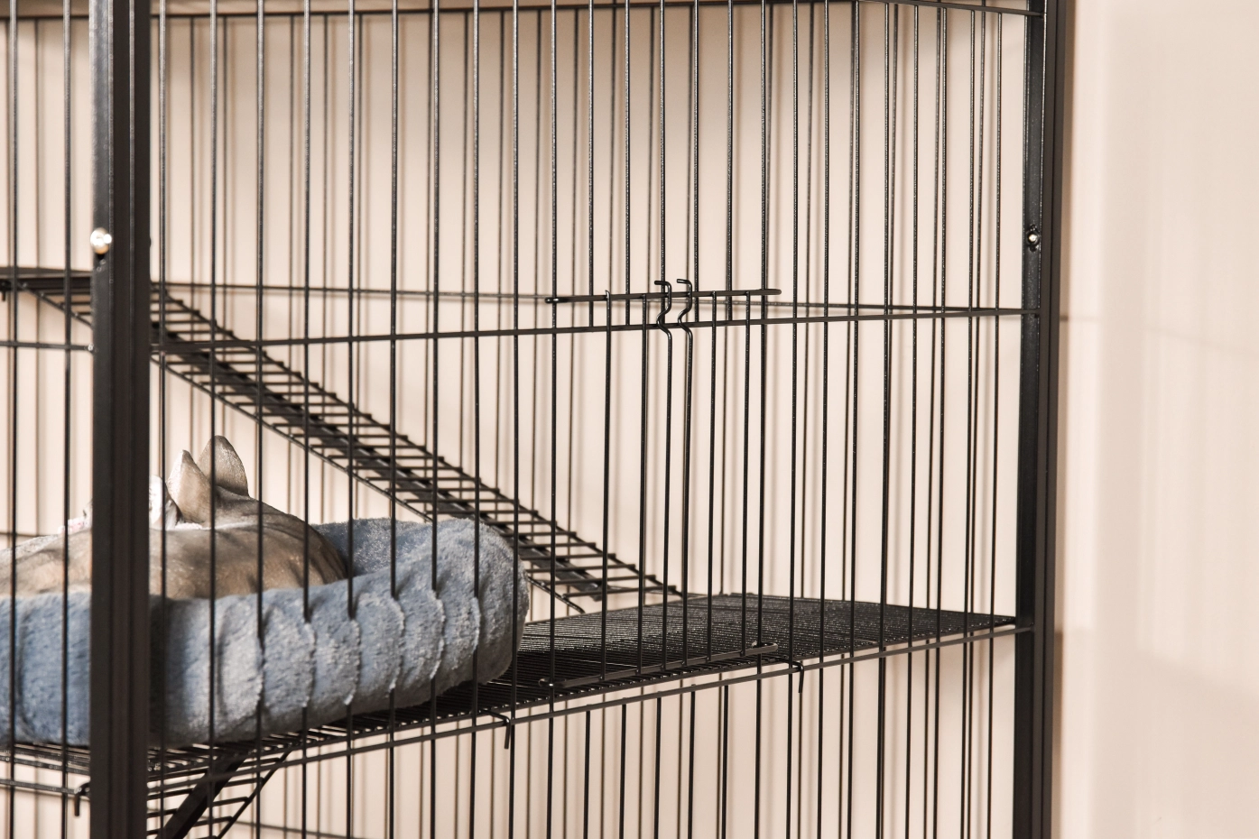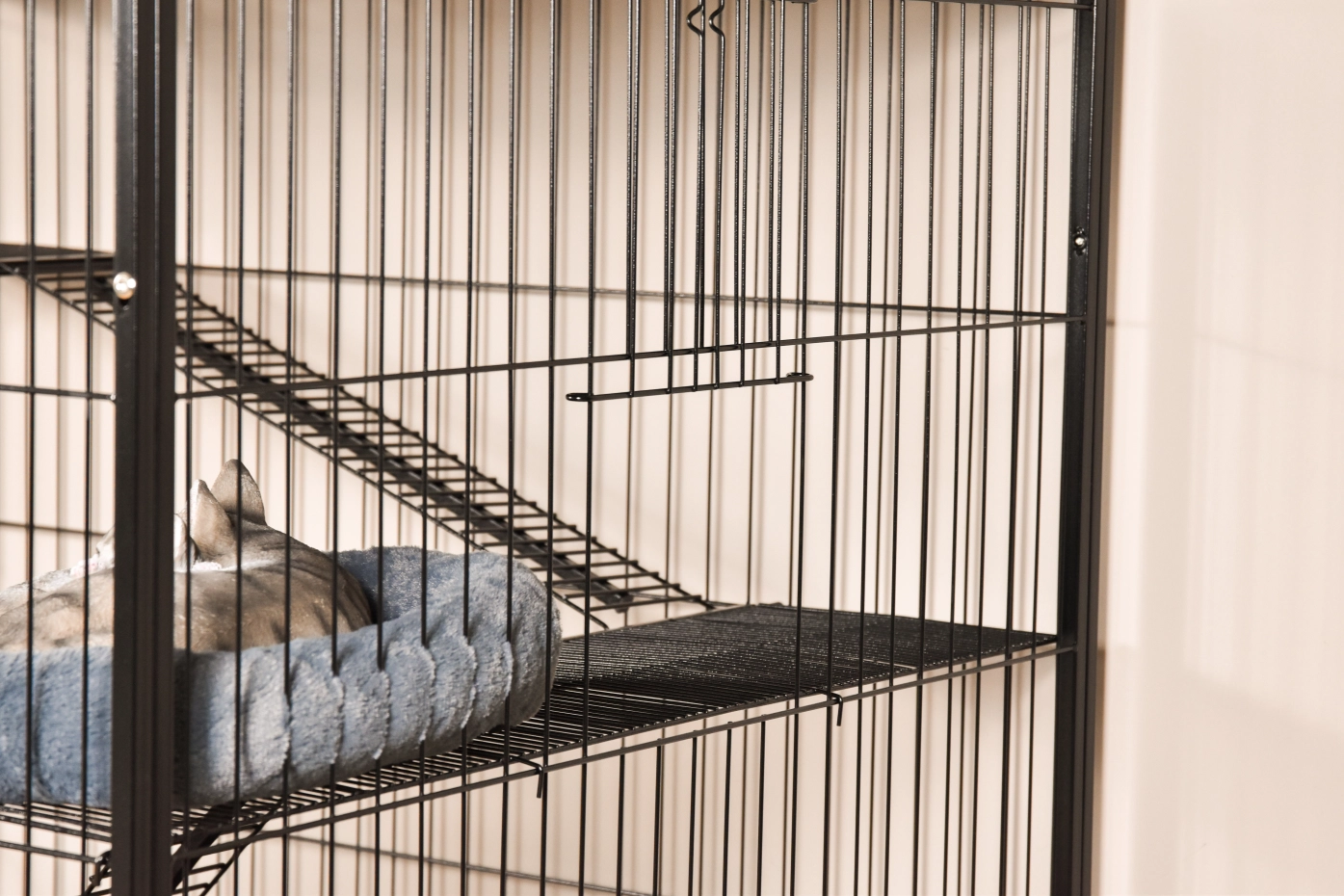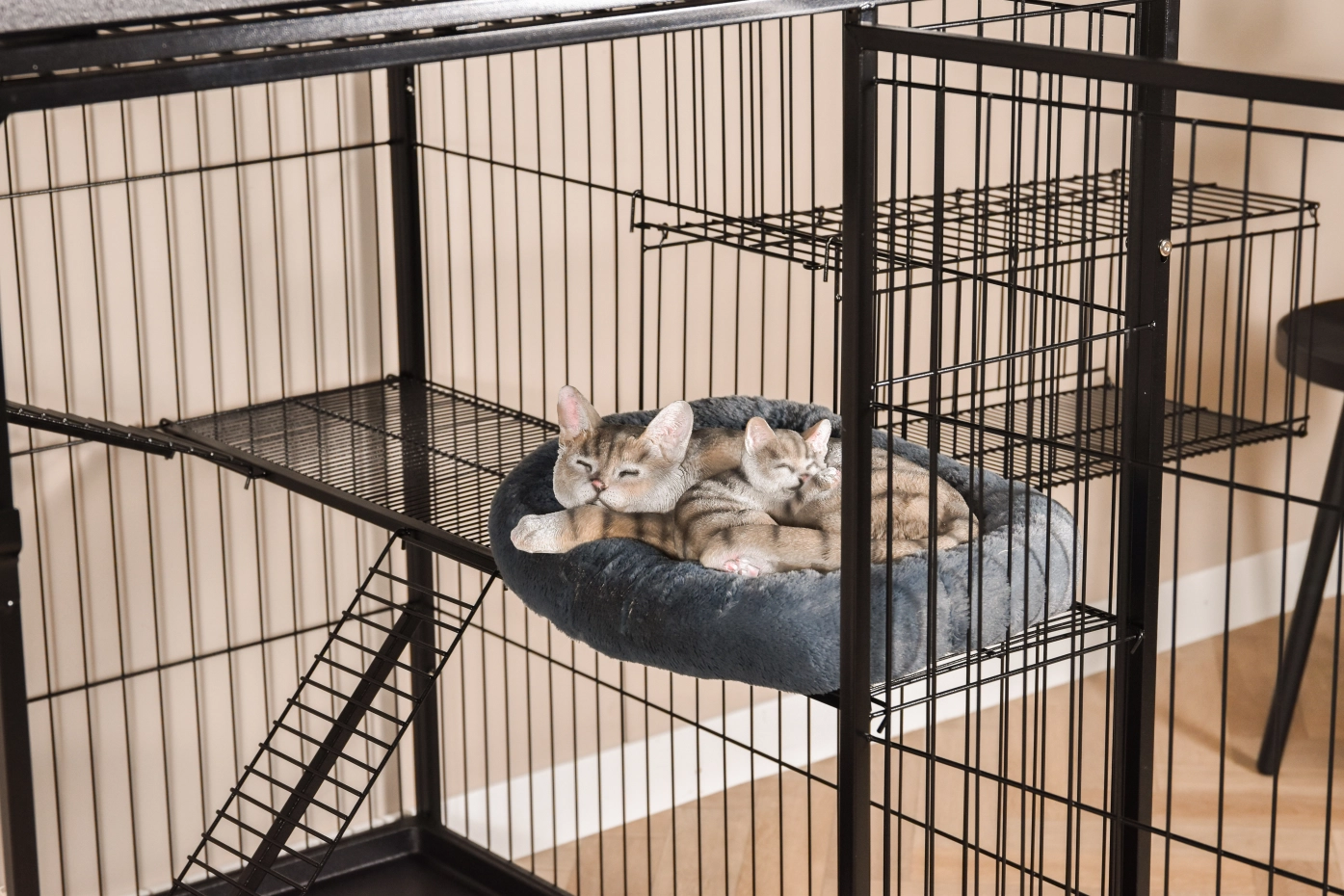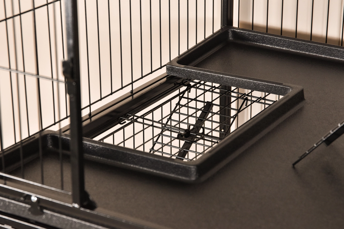 - Cage à chat robuste avec des barreaux revêtus d'une finition martelée noire.