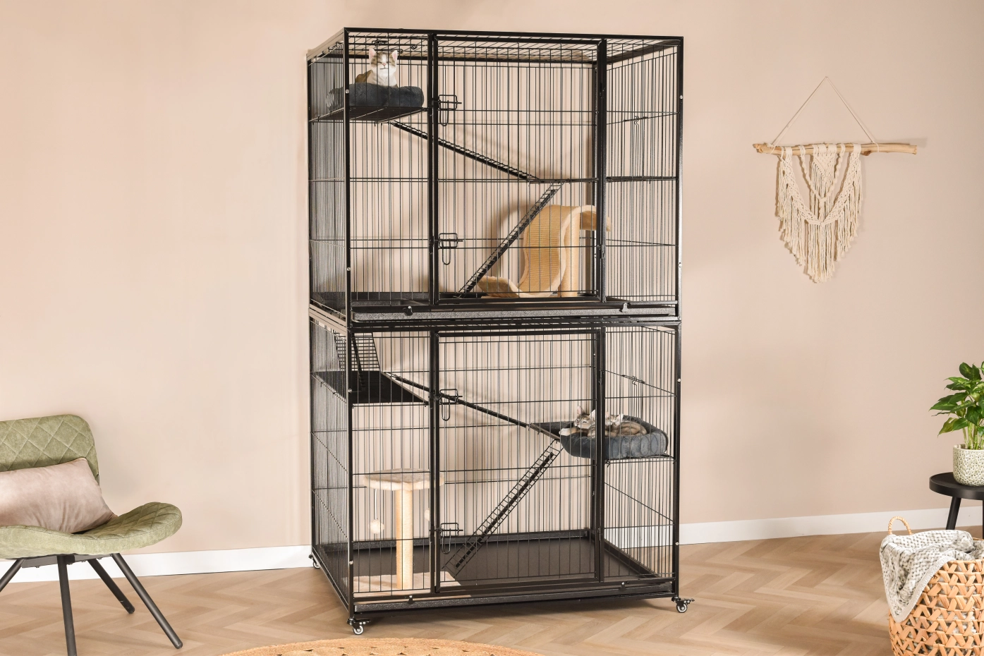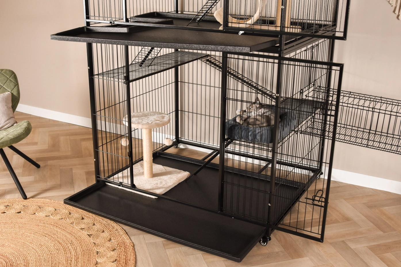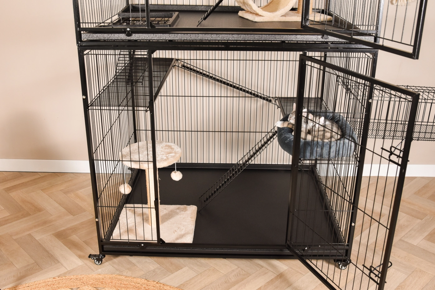Cage chat Nivo est une grande cage pour l'intérieur ou pour sous la veranda. Cette cage a deux étages connectés par plateaux ou rampes. Vous pouvez fermer et verrouiller les étages ainsi que vous pouvez utiliser les étgages séparés.