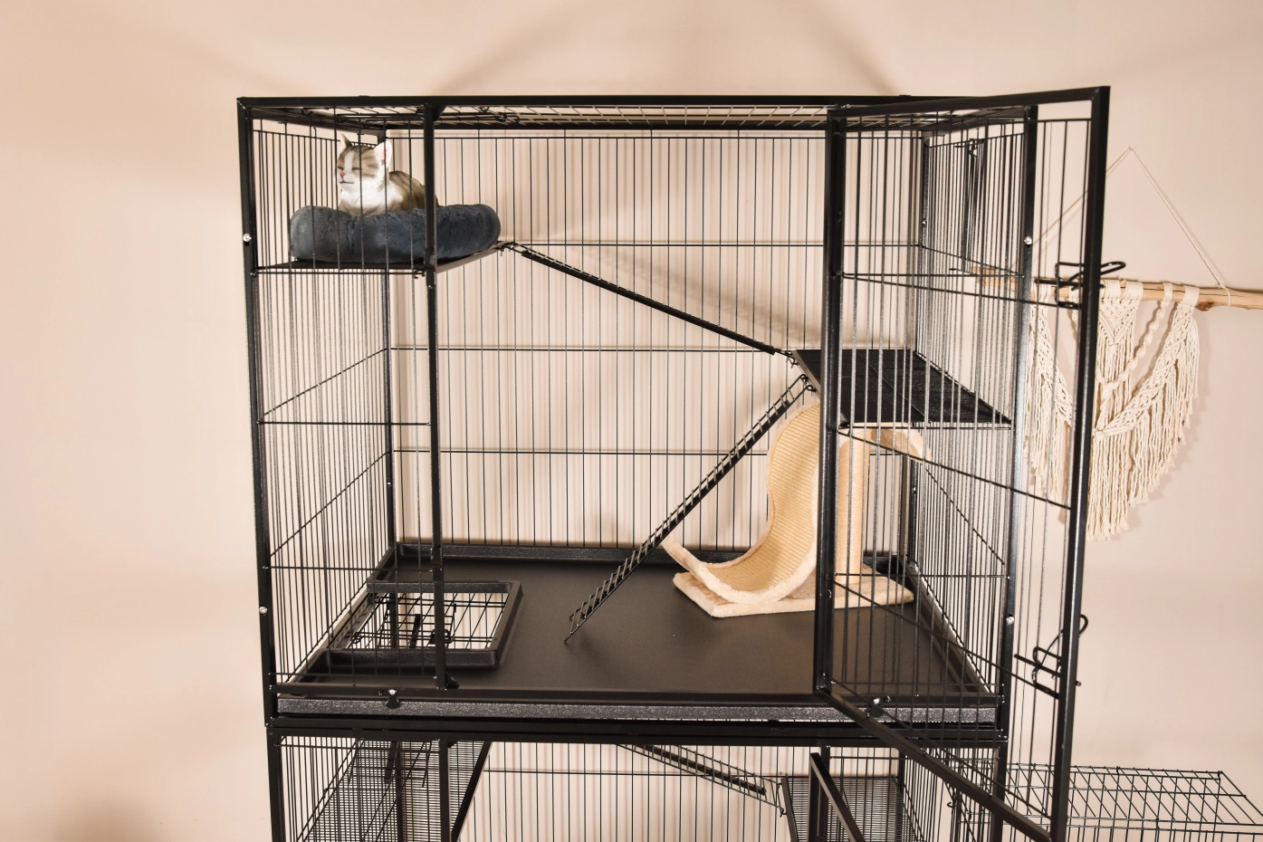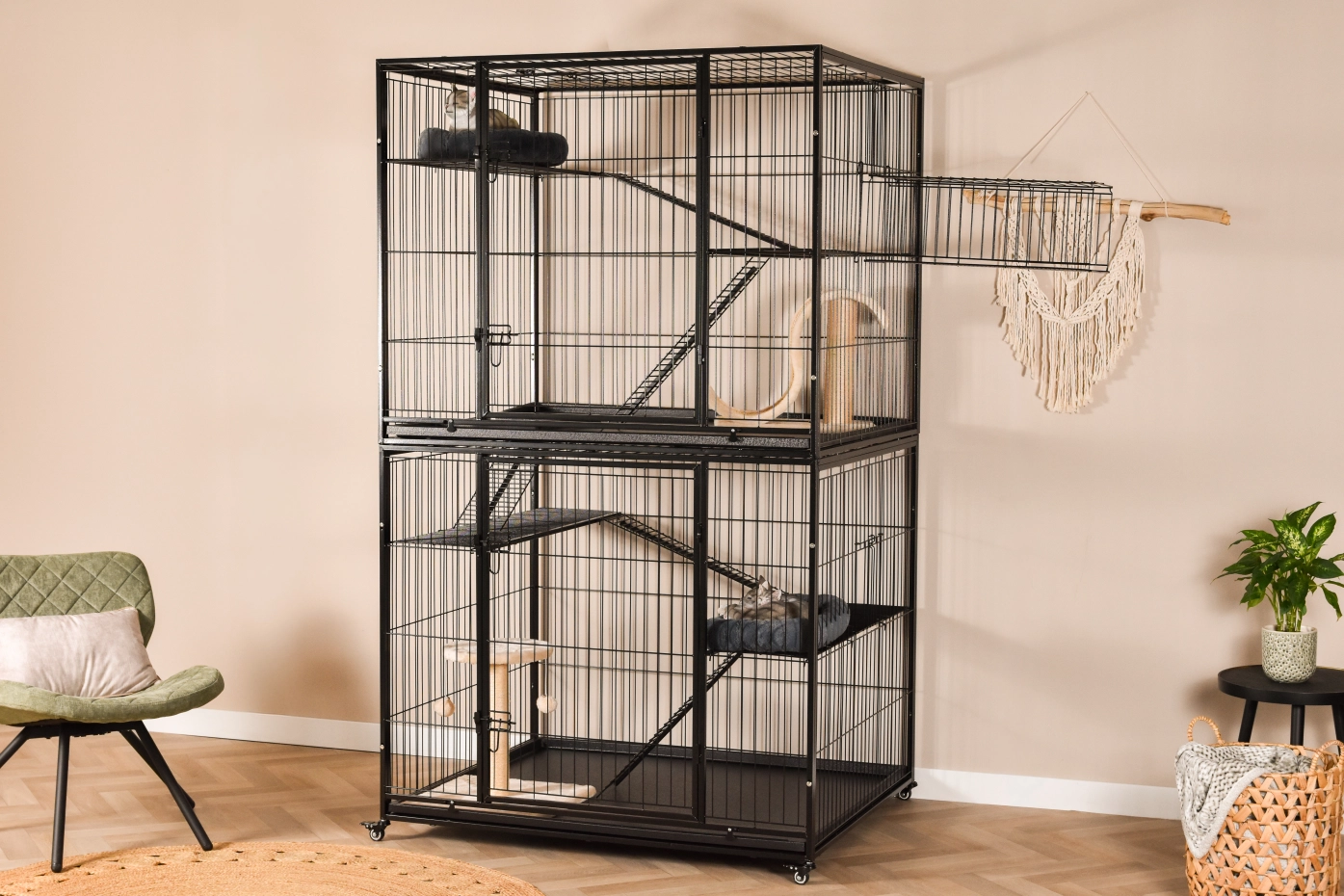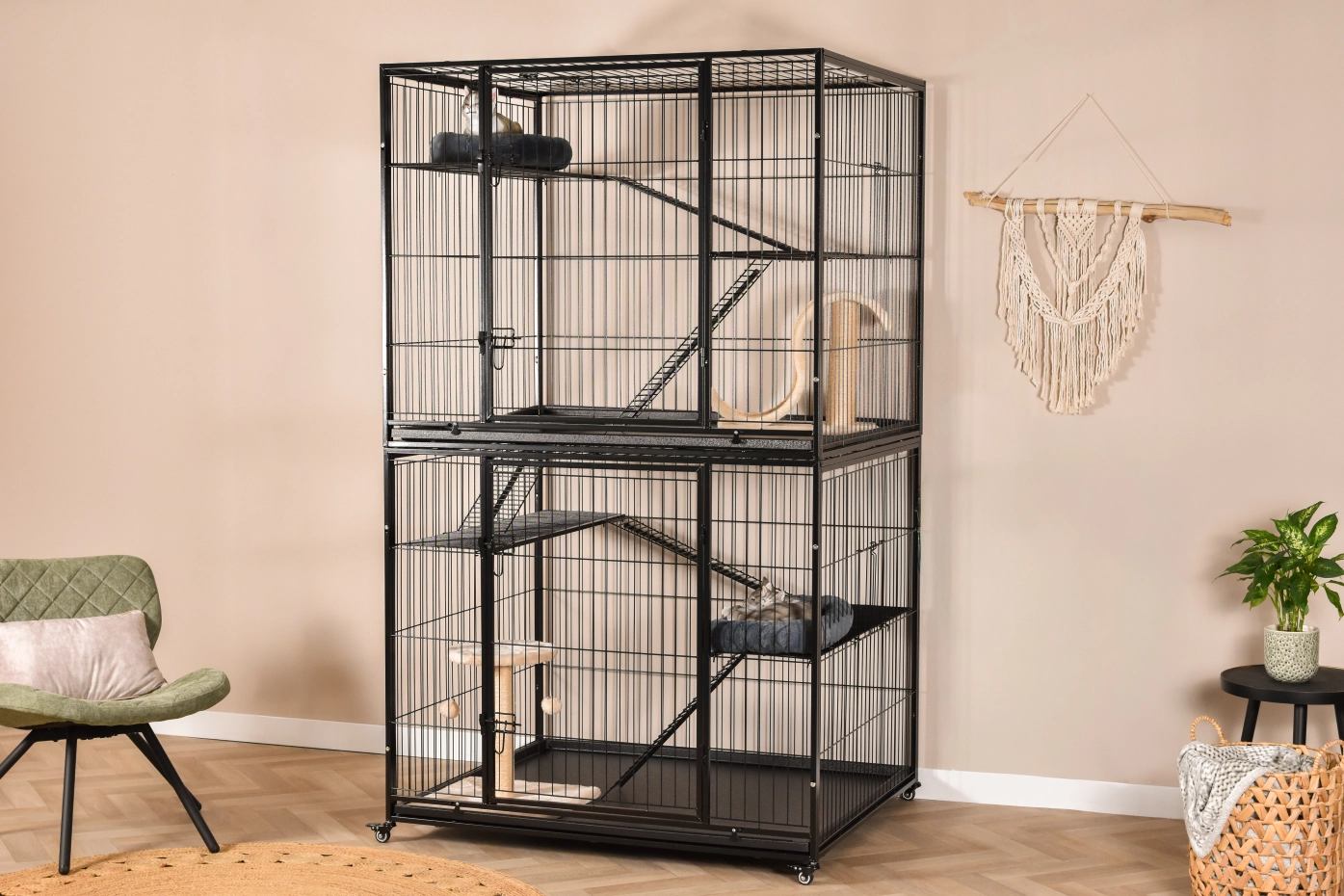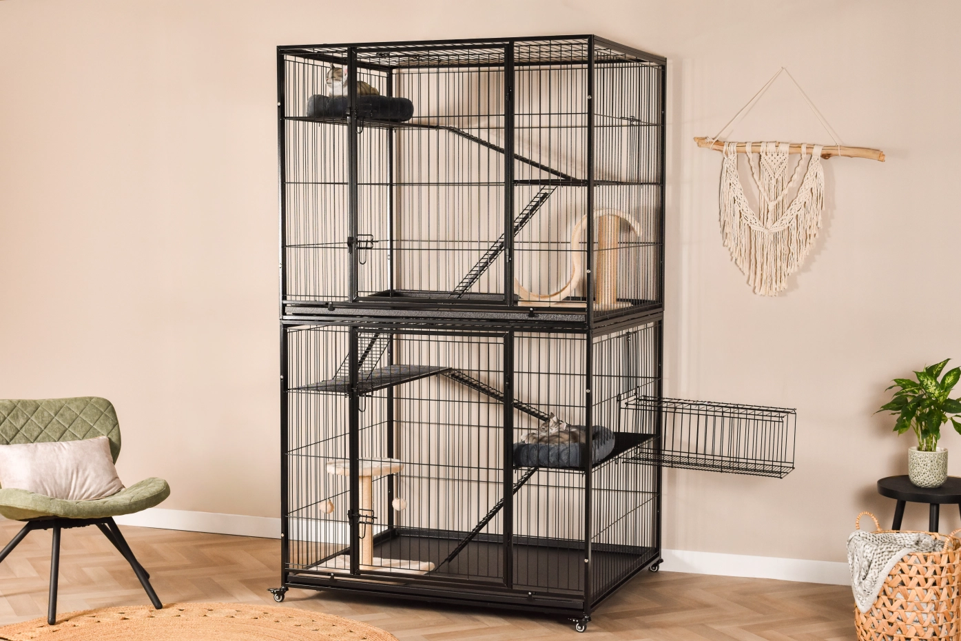 Cage chat Nivo est une grande cage pour l'intérieur ou pour sous la veranda. Cette cage a deux étages connectés par plateaux ou rampes. Vous pouvez fermer et verrouiller les étages ainsi que vous pouvez utiliser les étgages séparés.