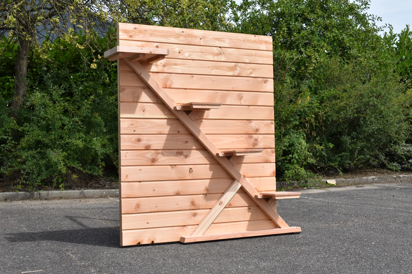 - En bois de Douglas, avec des cadres de 68x44mm, des planches avec un épaisseur de 18mm. Même sans traitement du bois, le bois est durable pour 15 ans, mais le bois se devient gris vite si vous n'utilisez pas des huile pour le Douglas.