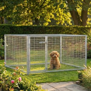L'enclos pour chiot galvanisée de 2x1,5m est un bel espace extérieur! L'enclos consiste en 2 panneaux de 1,5m et 2 panneaux de 2m.