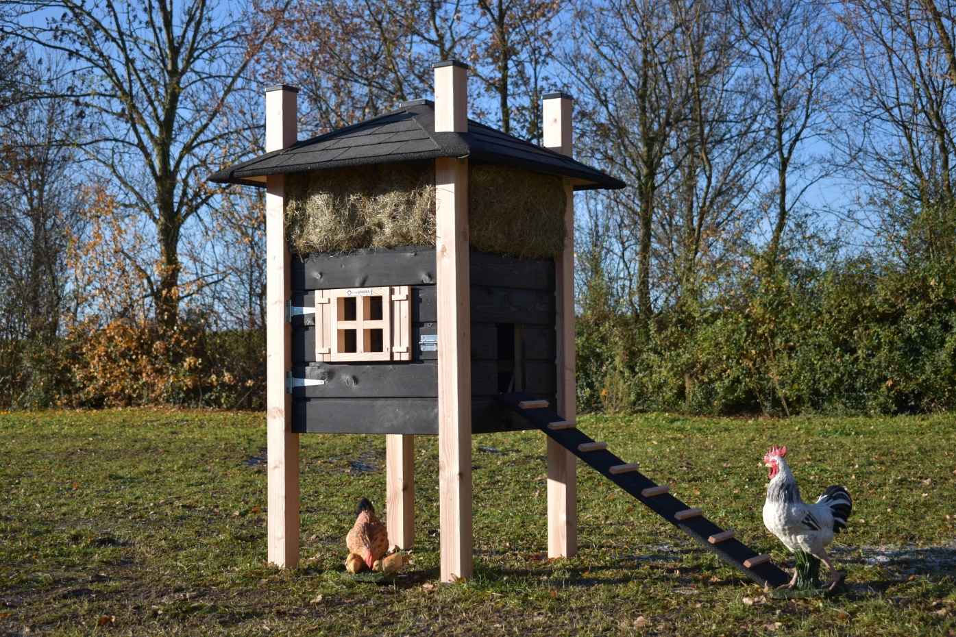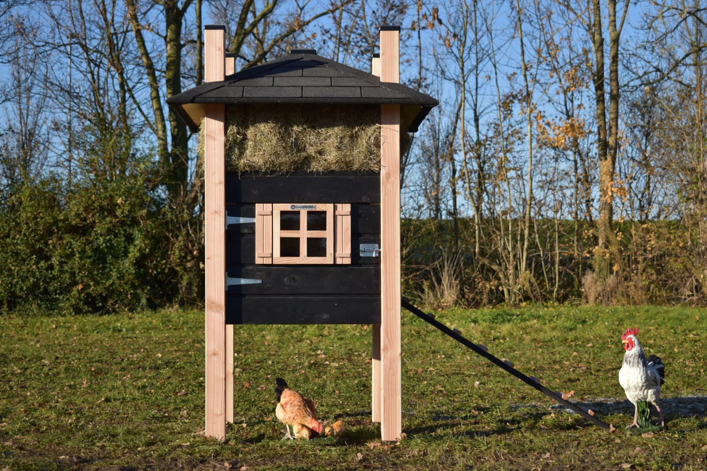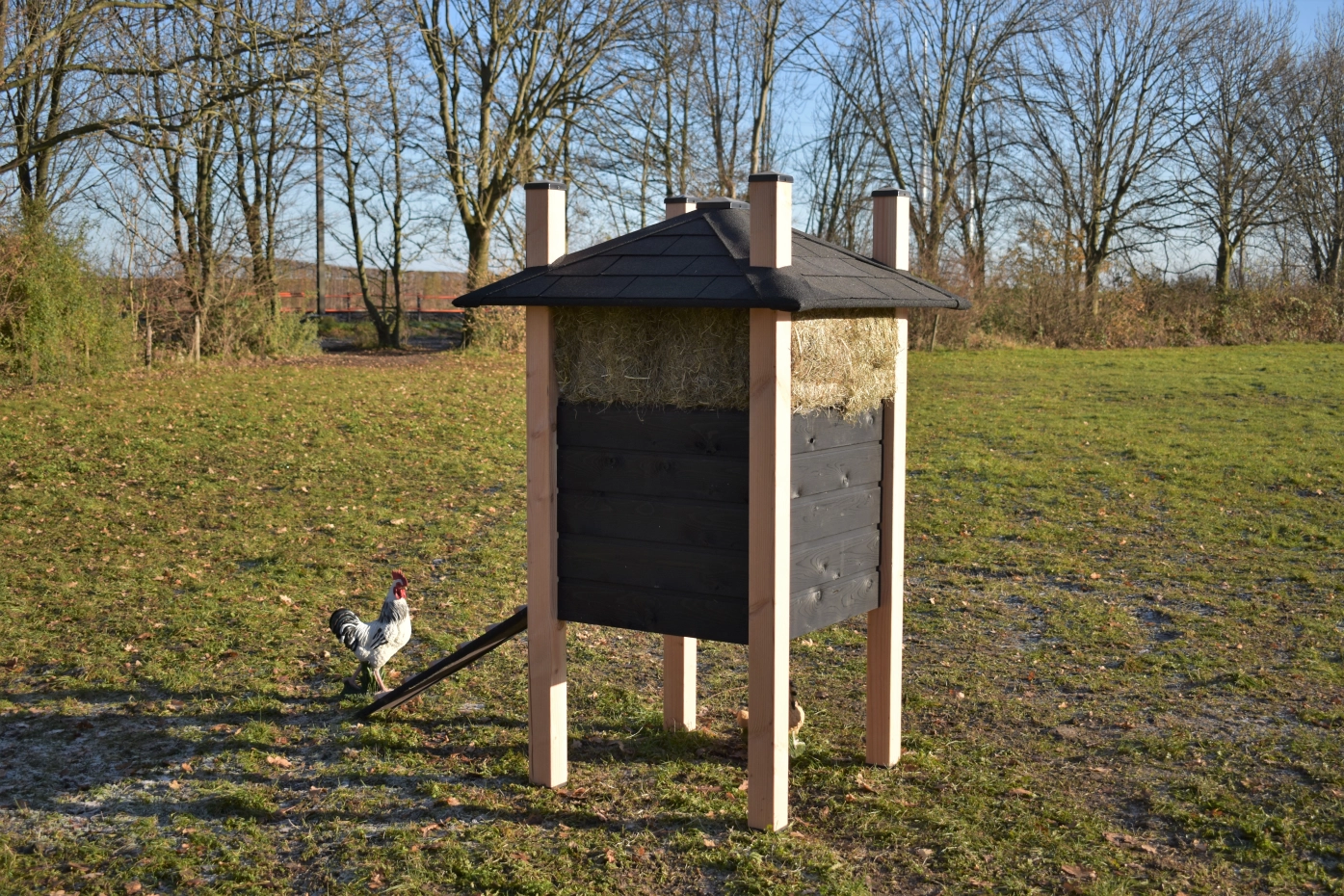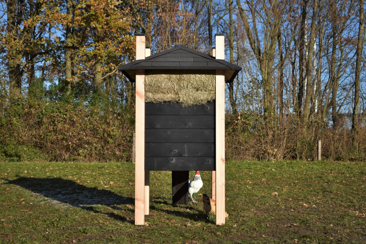 Poulailler botte de foin Rosa est équipée avec poteaux en bois de Douglas. Les panneaux ont la couleur noir. Le clapier est un achat pour votre jardin! Le clapier st, en standard, livré avec foin. A cause des grandes portes vous pouvez nettoyer le clapier facilement. Pour préserver la couleur du bois, vous pouvez le traiter avec de l'huile Douglas. Sans traitement supplémentaire, le bois deviendra rapidement gris.