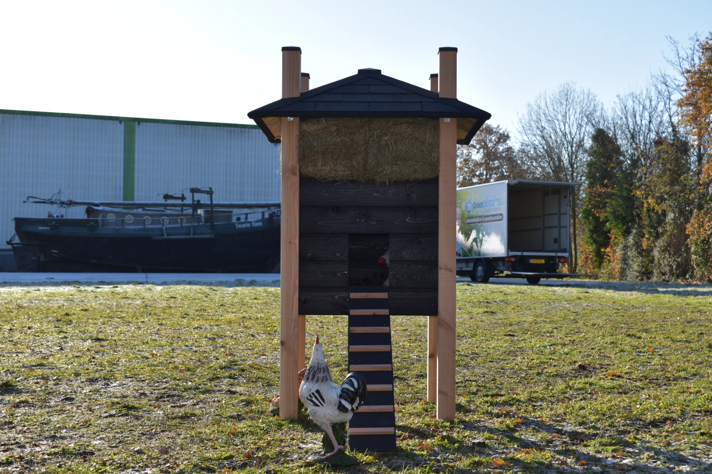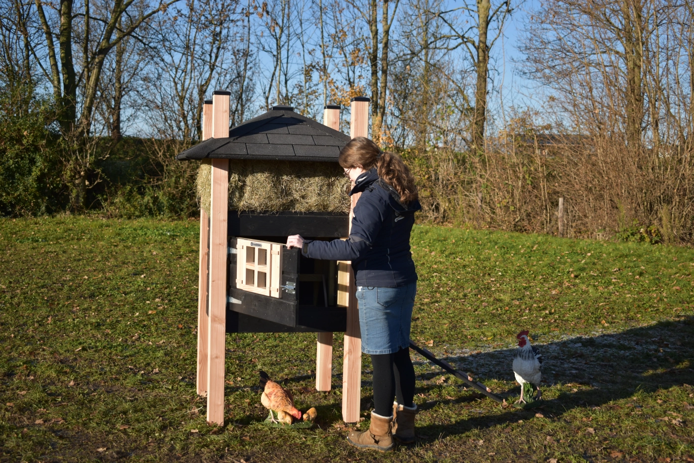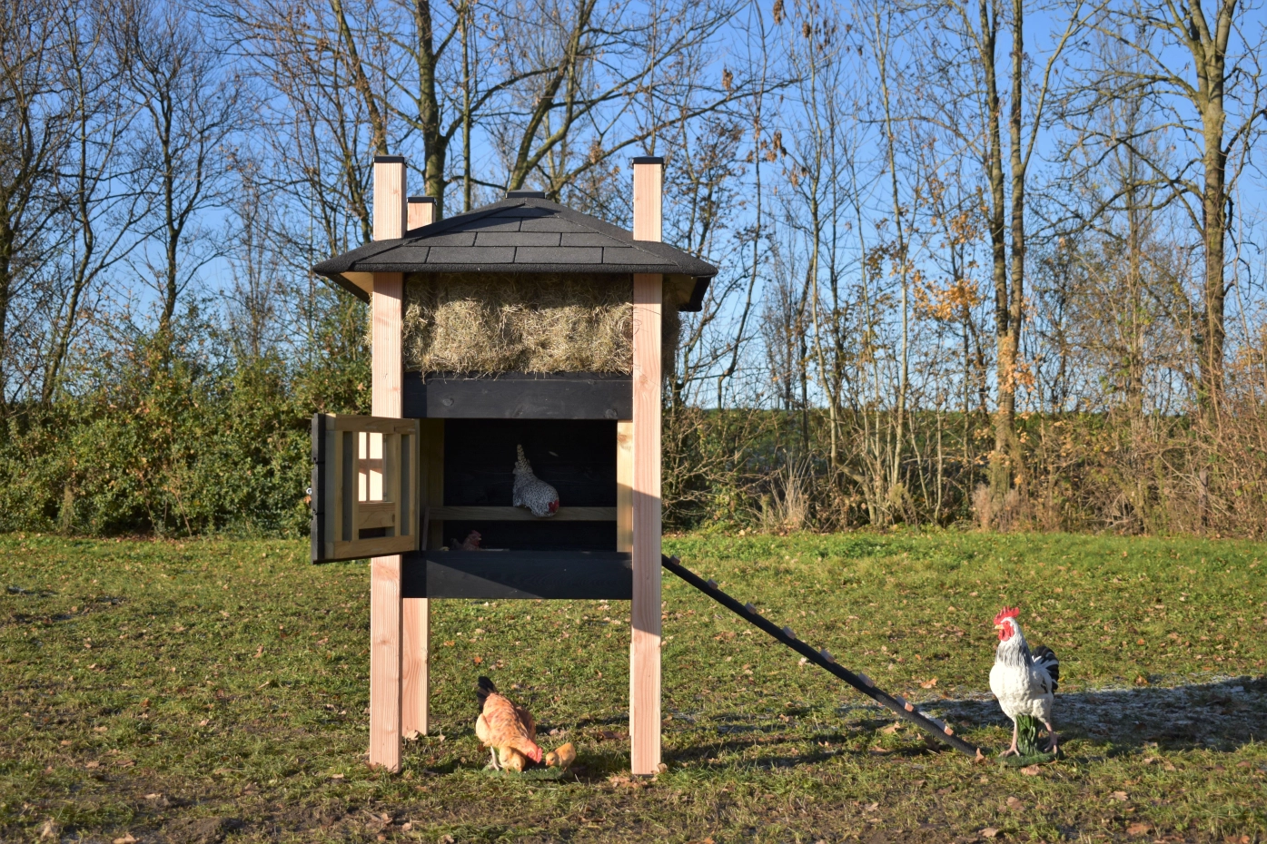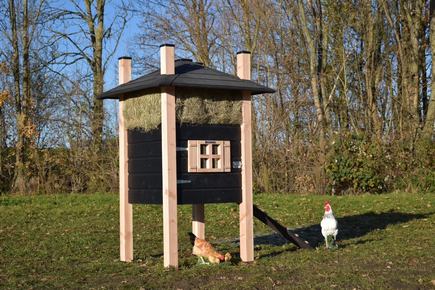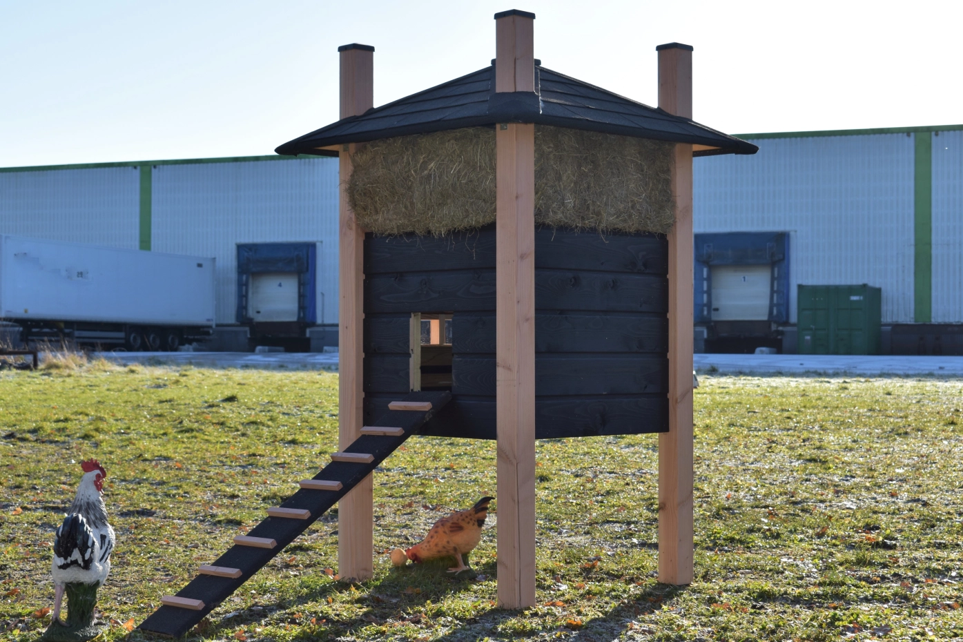 Poulailler botte de foin Rosa est équipée avec poteaux en bois de Douglas. Les panneaux ont la couleur noir. Le clapier est un achat pour votre jardin! Le clapier st, en standard, livré avec foin. A cause des grandes portes vous pouvez nettoyer le clapier facilement. Pour préserver la couleur du bois, vous pouvez le traiter avec de l'huile Douglas. Sans traitement supplémentaire, le bois deviendra rapidement gris.