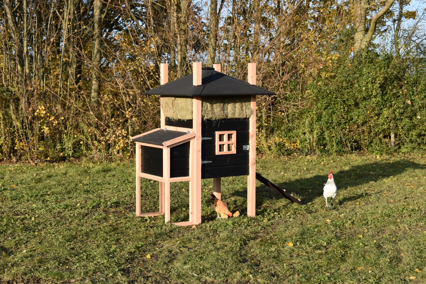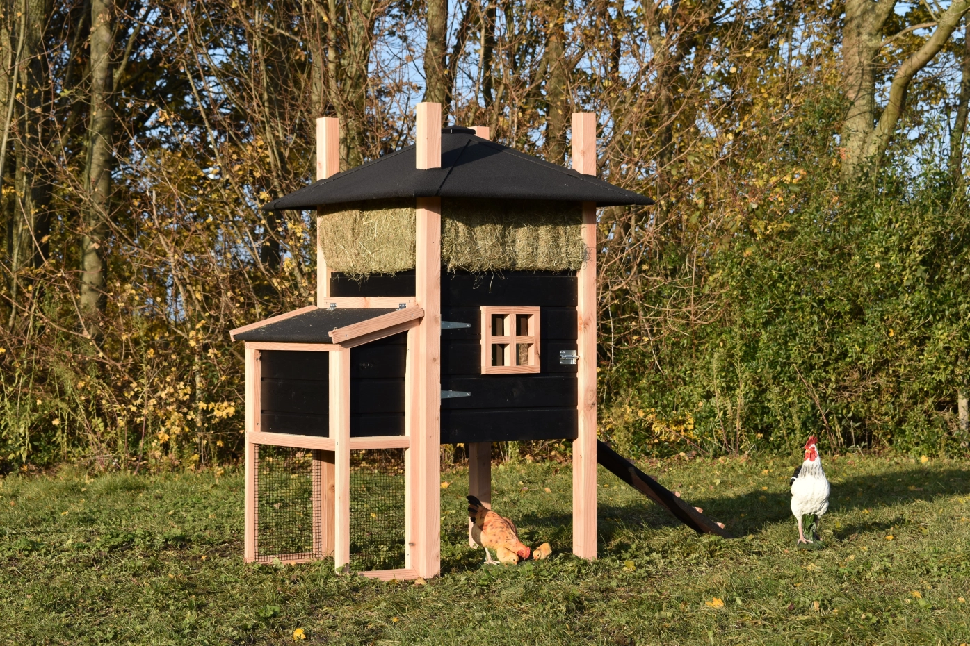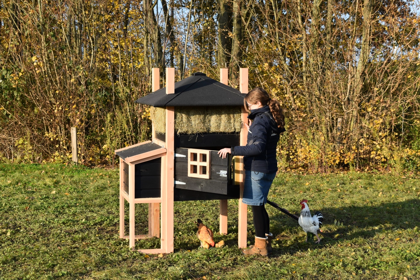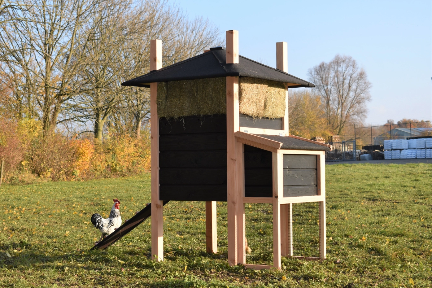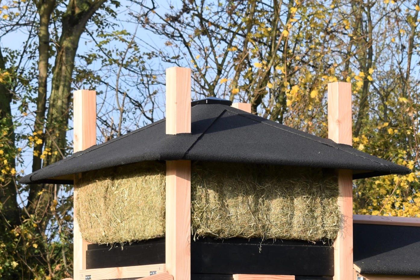 Poulailler botte de foin Rosalynn est étendue avec une pondoir. Le botte de foin est un clapier pratique. A cause du toit articulé vous pouvez ramasser les oeufs facilement. La porte avec le fenêtre a les dimensions 58x40cm. Le poulailler est approprié pour 3 à 5 poules. Le clapier est un achat pour votre jardin!