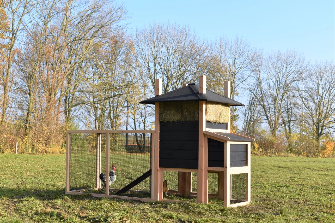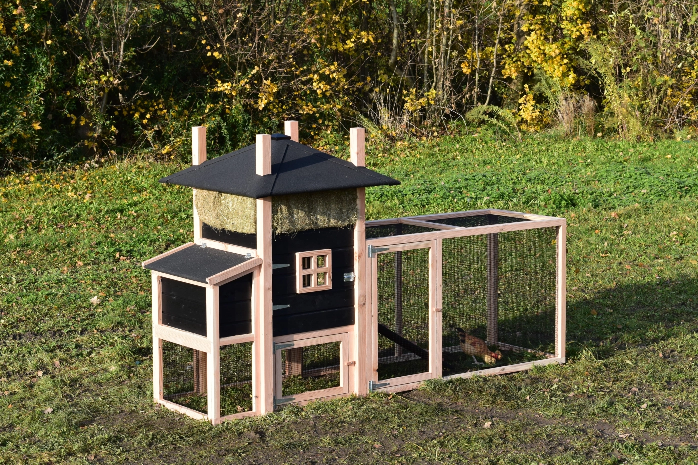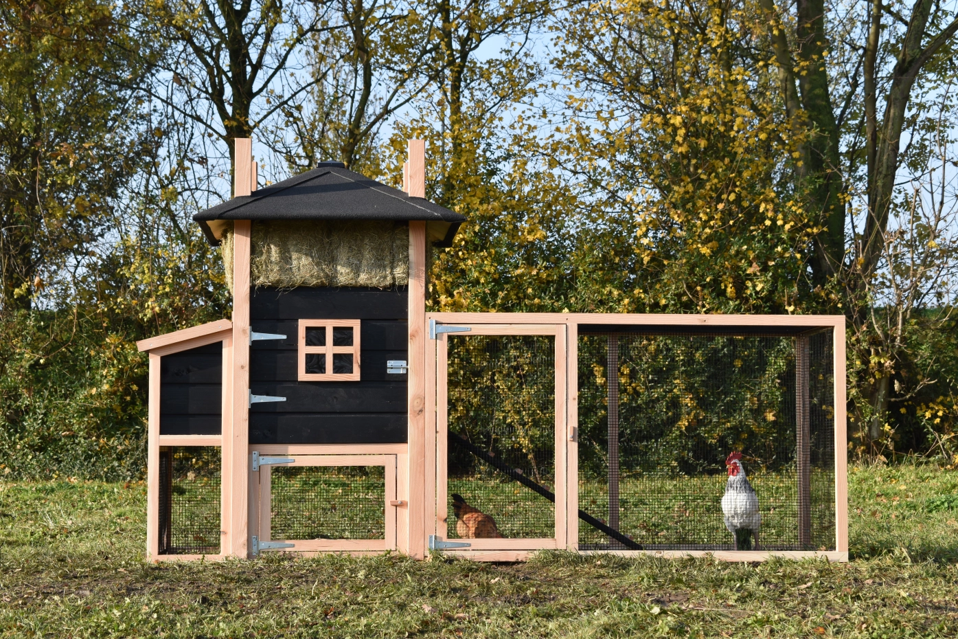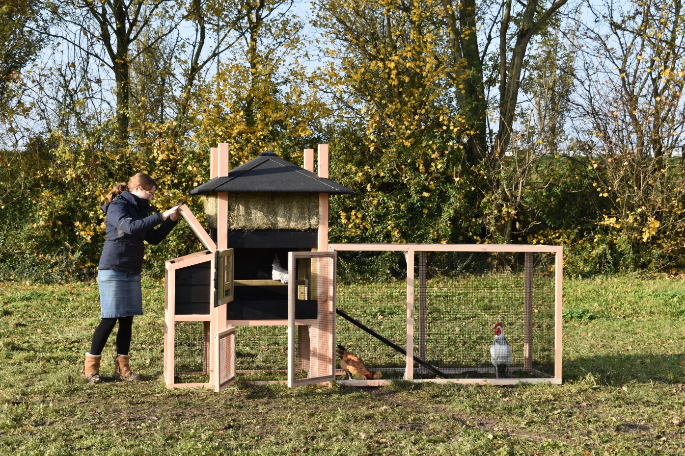 Poulailler botte de foin Rosalynn est étendue avec une pondoir et un enclos additive. L'enclos est équipée avec toit de maille. Le clapier est fabriquée en bois de Douglas et bois d'épicéa impregné noir. La pondoir a un toit articulé, pour rammasser les oeufs facilement. L'enclos spacieux se poursuit sous la cage de nuit et la pondoir, ce qui permet aux poules de s'abriter en cas de pluie. La nichoir est approprié pour 3 à 5 poules.
