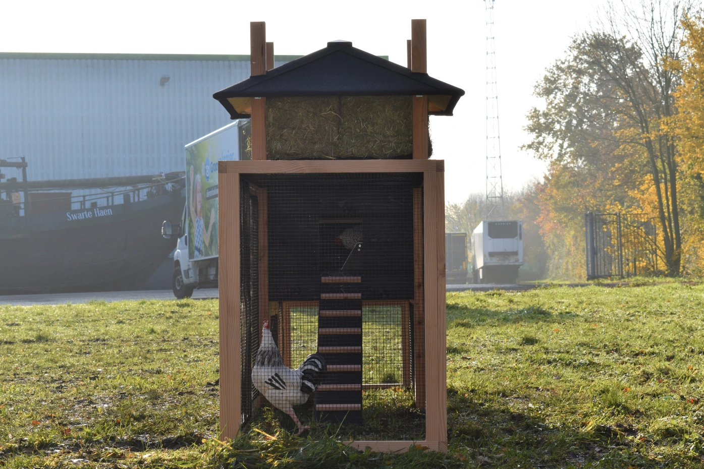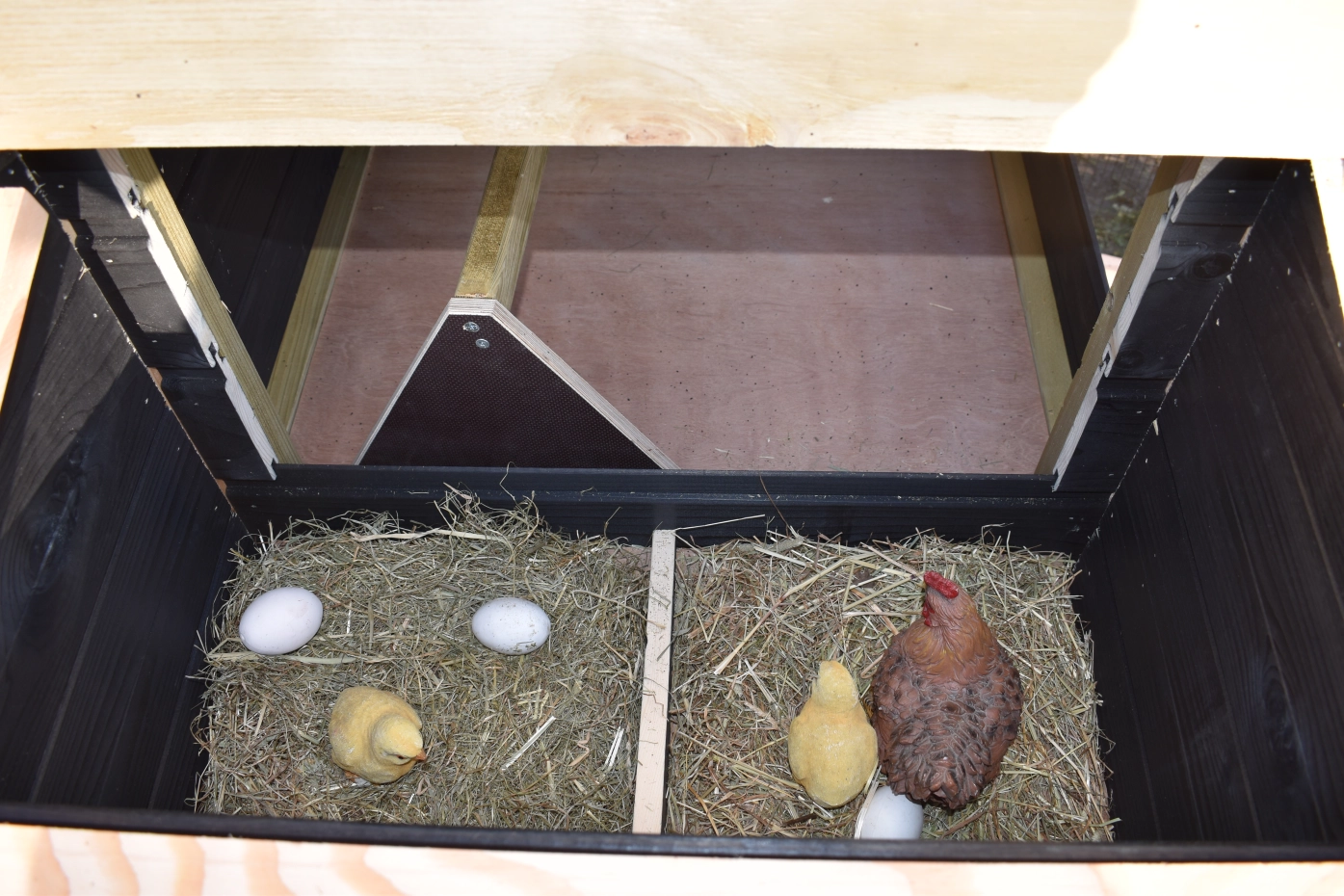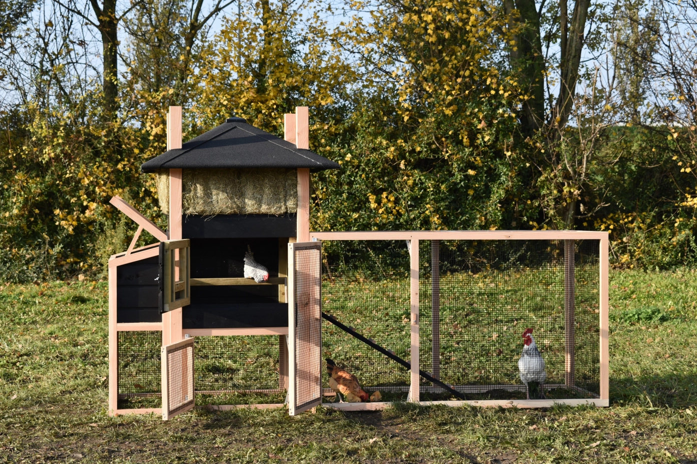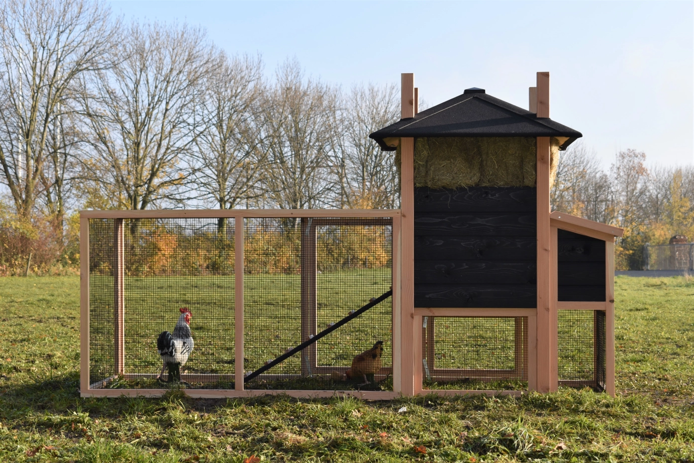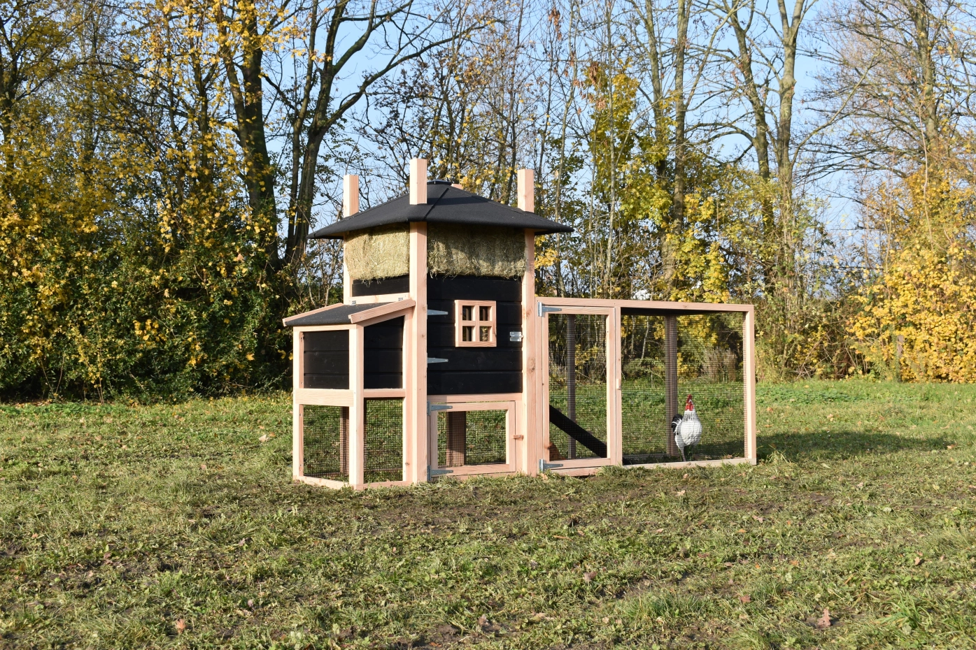 Poulailler botte de foin Rosalynn est étendue avec une pondoir et un enclos additive. L'enclos est équipée avec toit de maille. Le clapier est fabriquée en bois de Douglas et bois d'épicéa impregné noir. La pondoir a un toit articulé, pour rammasser les oeufs facilement. L'enclos spacieux se poursuit sous la cage de nuit et la pondoir, ce qui permet aux poules de s'abriter en cas de pluie. La nichoir est approprié pour 3 à 5 poules.
