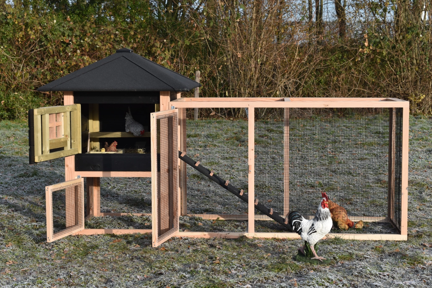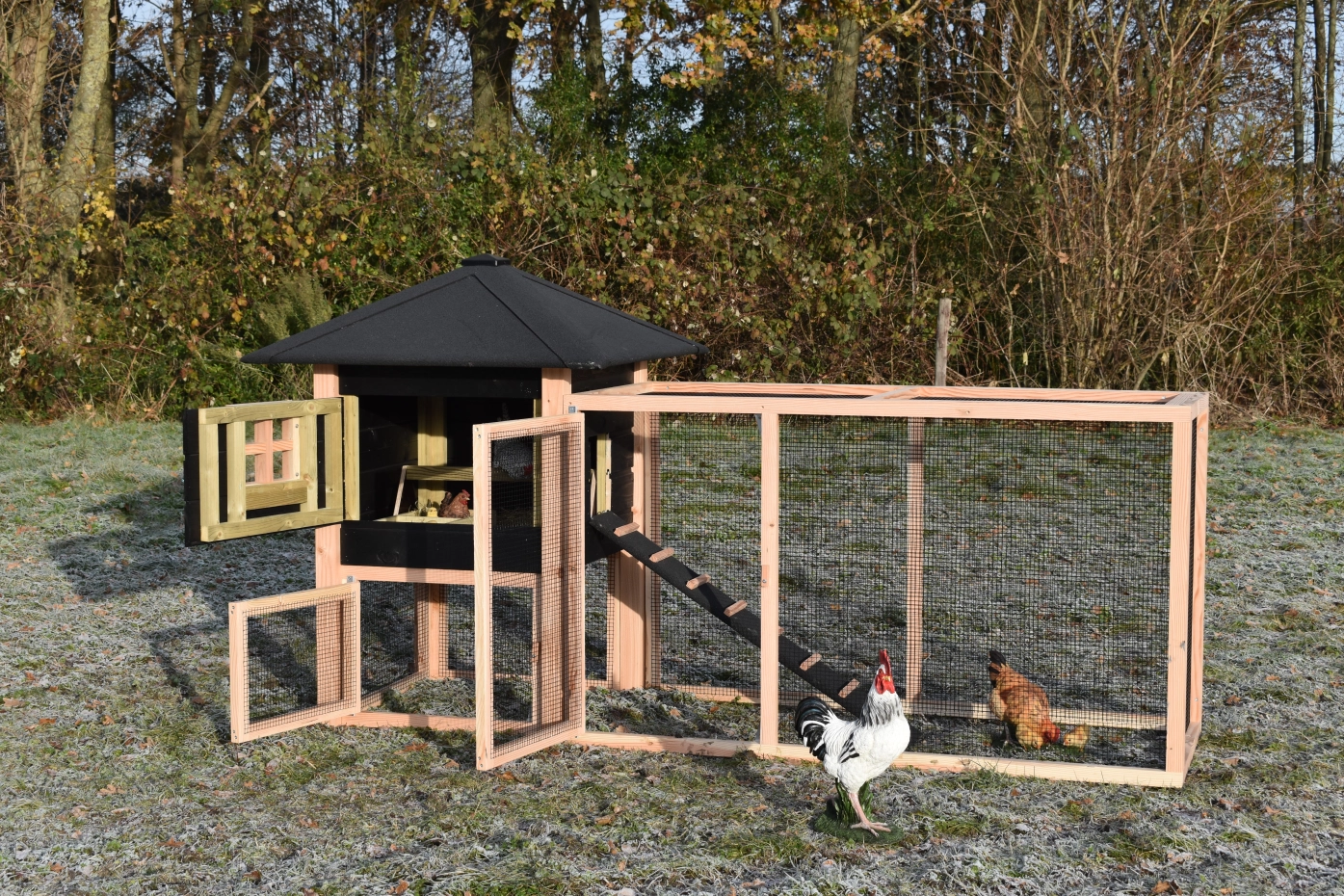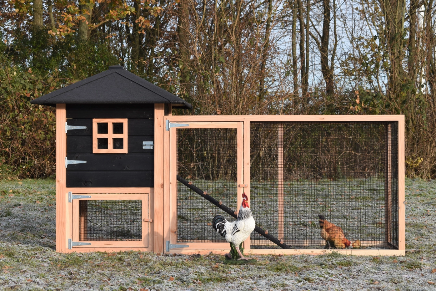 Le poulailler Rosy est étendue avec un enclos additive. Le grand enclos offre une belle vue sur vos poules. A cause de la grande porte vous pouvez nettoyer le clapier facilement. Un bel clapier pour un bon prix!