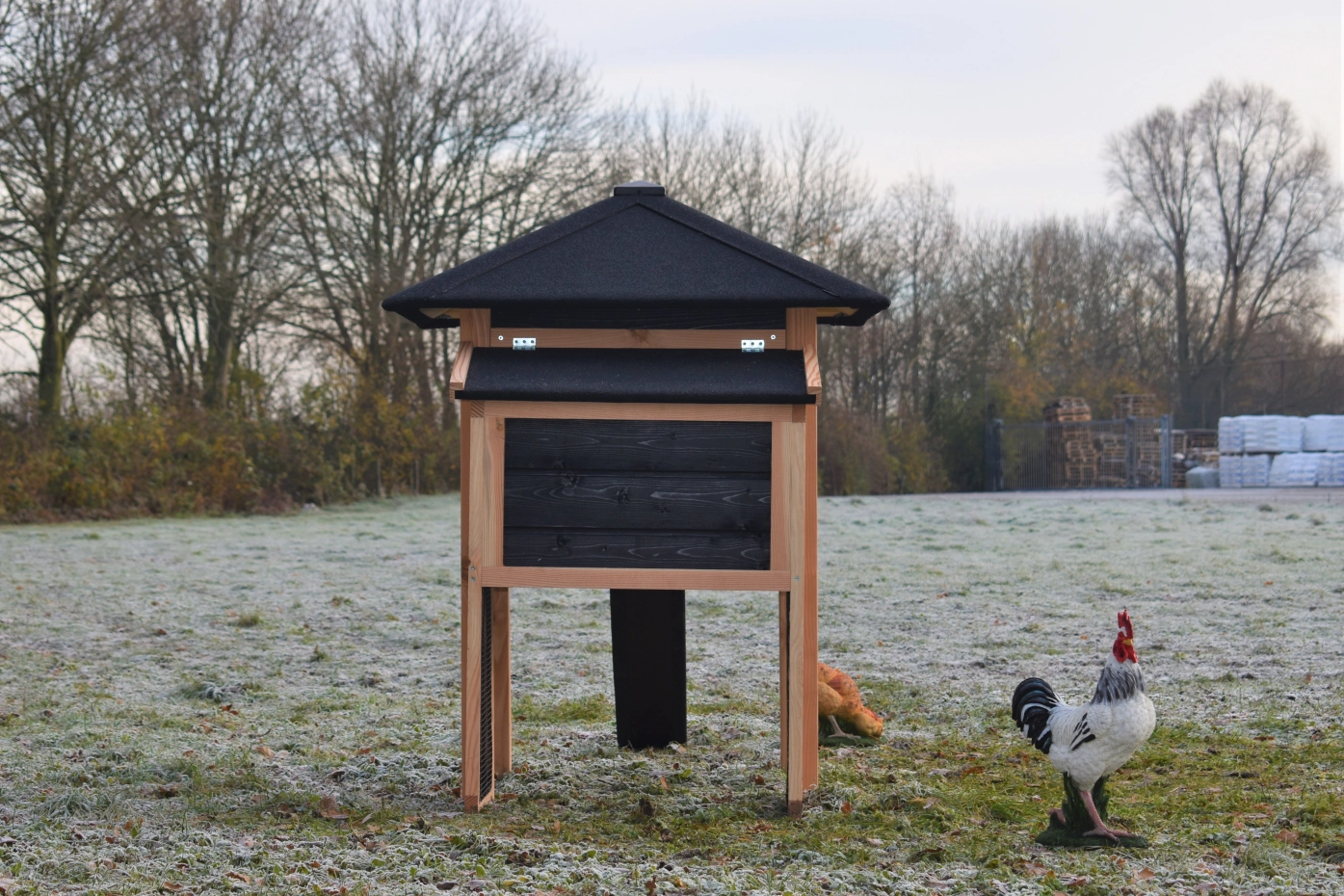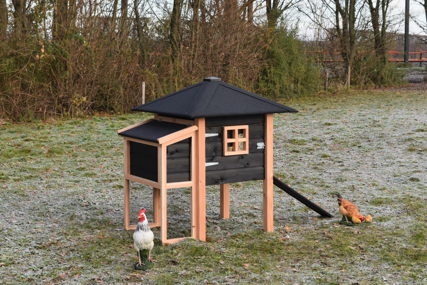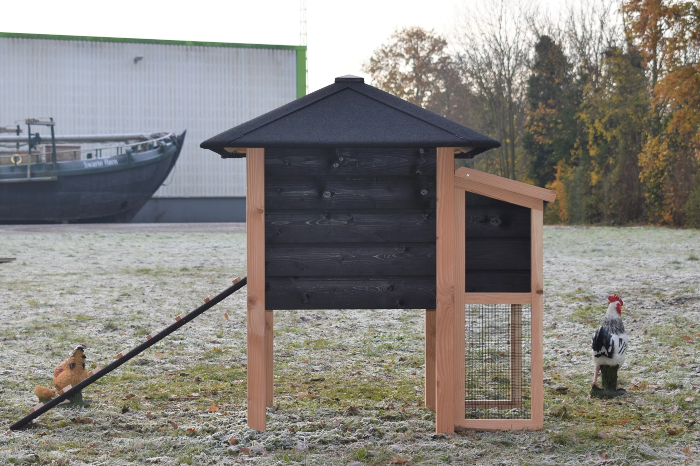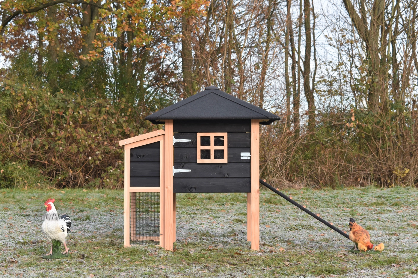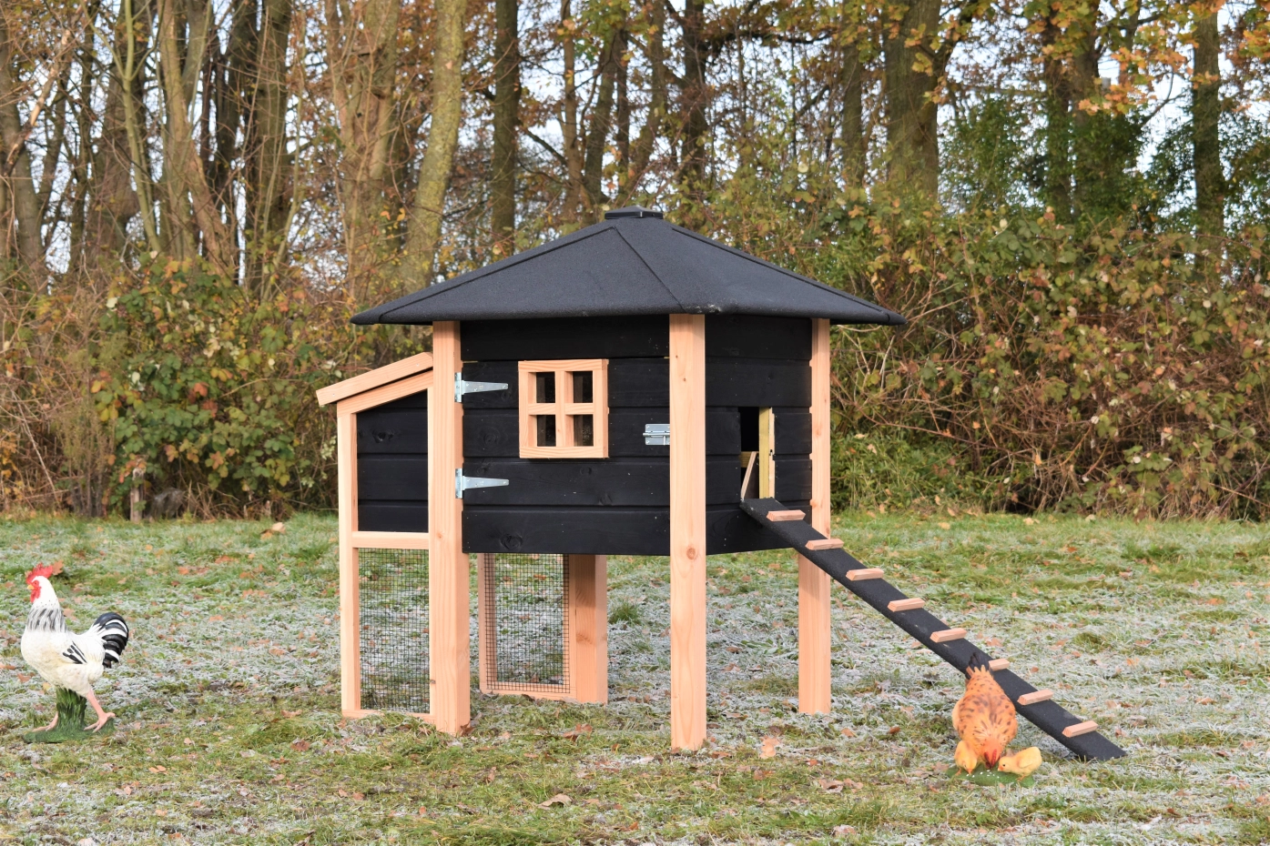 Poulailler Rosy est étendue avec une pondoir. Le clapier a une grande nichoir avec une grande porte, pour que vous pouvez nettoyer le poulailler fermé facilement. La pondoir a un toit articulé, pour que vous pouvez ramasser les oeufs facilement. Lorsqu'il pleut, les poules peuvent trouver un abri sous le poulailler fermé et la pondoir. Le clapier est fabriquée en bois de Douglas et bois d'épicéa impregné noir. Un bel clapier pour un bon prix!