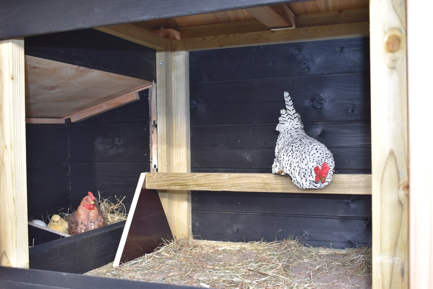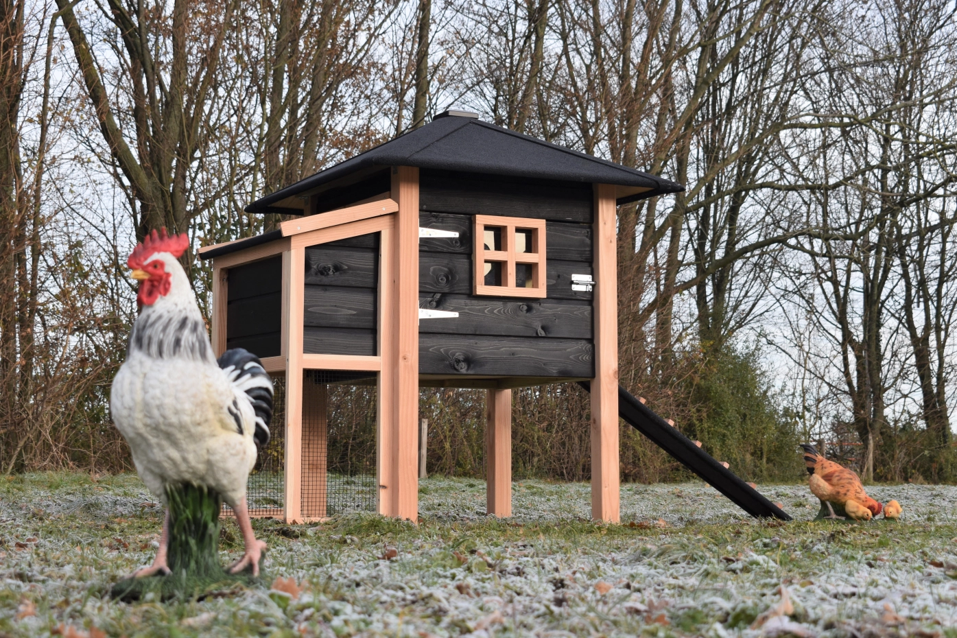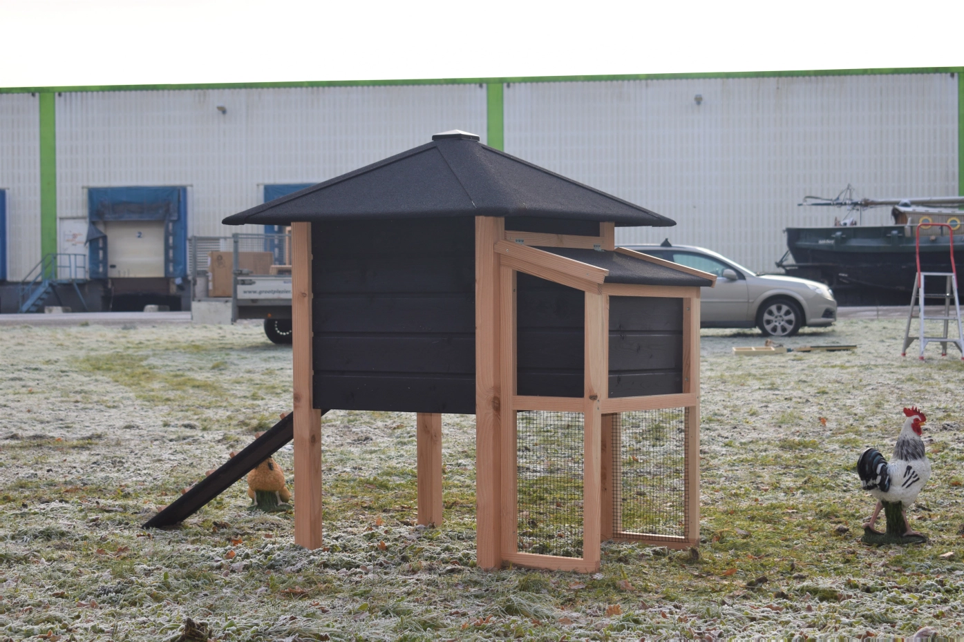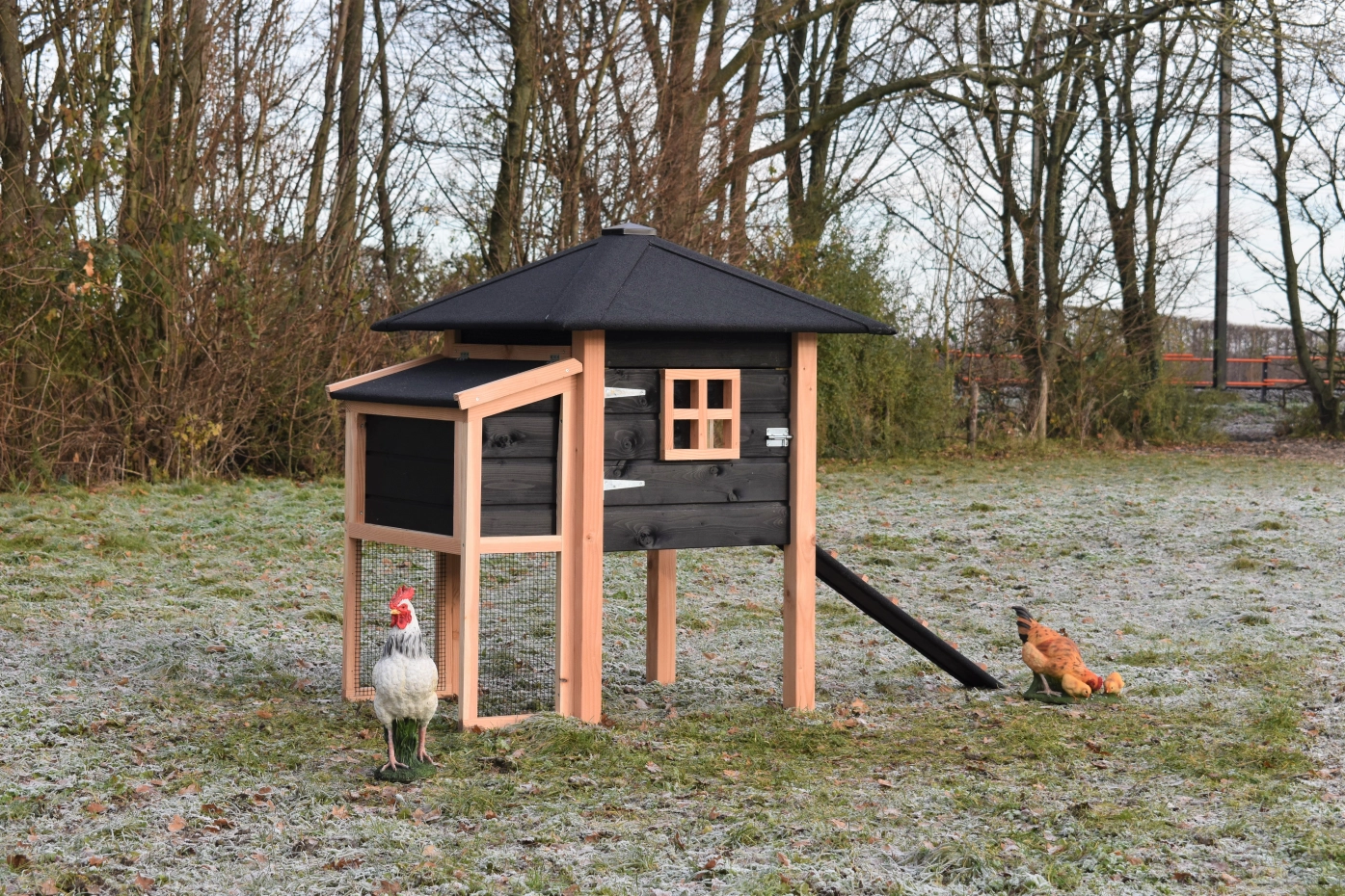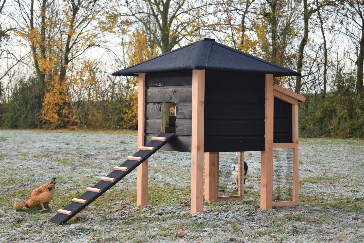 Poulailler Rosy est étendue avec une pondoir. Le clapier a une grande nichoir avec une grande porte, pour que vous pouvez nettoyer le poulailler fermé facilement. La pondoir a un toit articulé, pour que vous pouvez ramasser les oeufs facilement. Lorsqu'il pleut, les poules peuvent trouver un abri sous le poulailler fermé et la pondoir. Le clapier est fabriquée en bois de Douglas et bois d'épicéa impregné noir. Un bel clapier pour un bon prix!