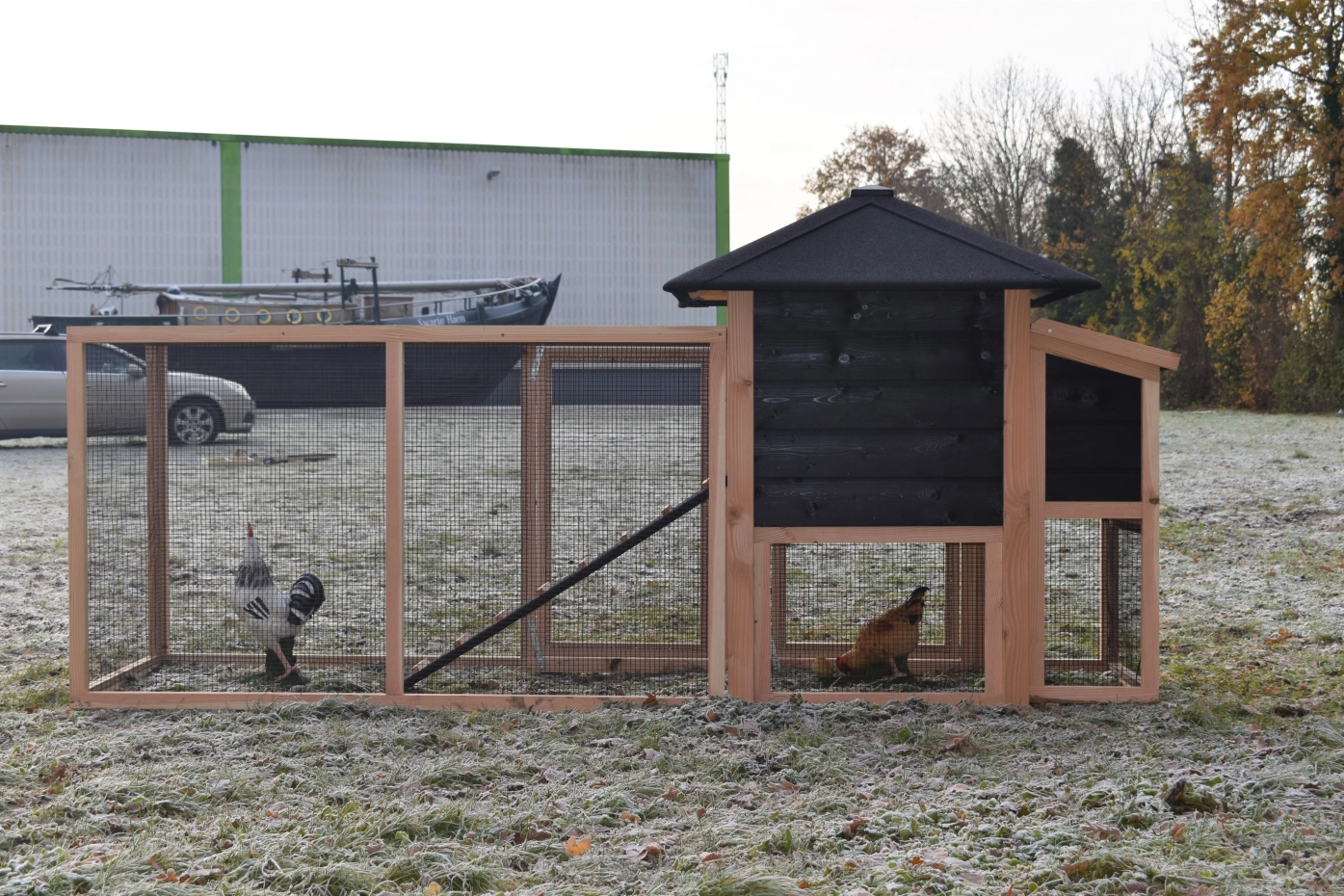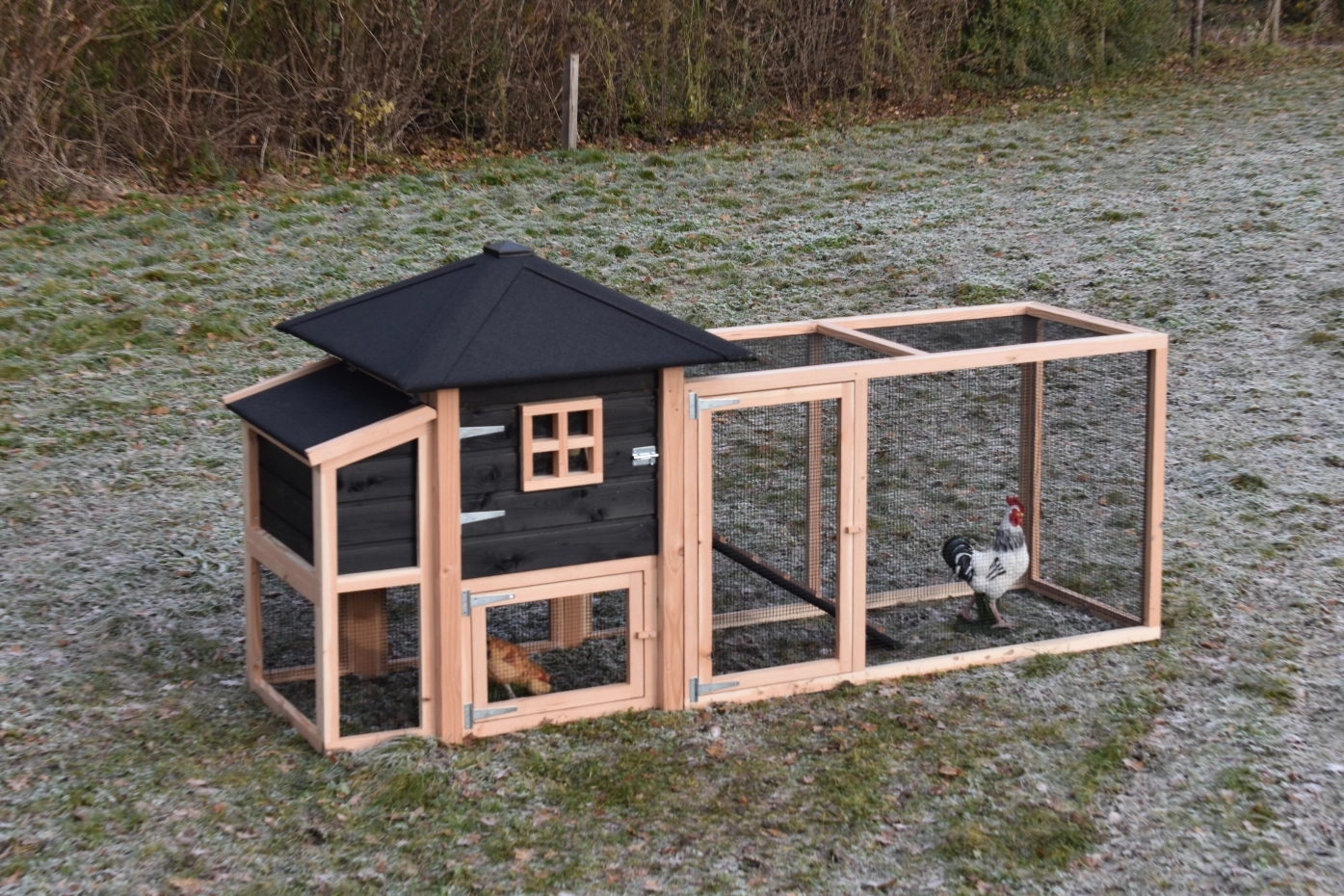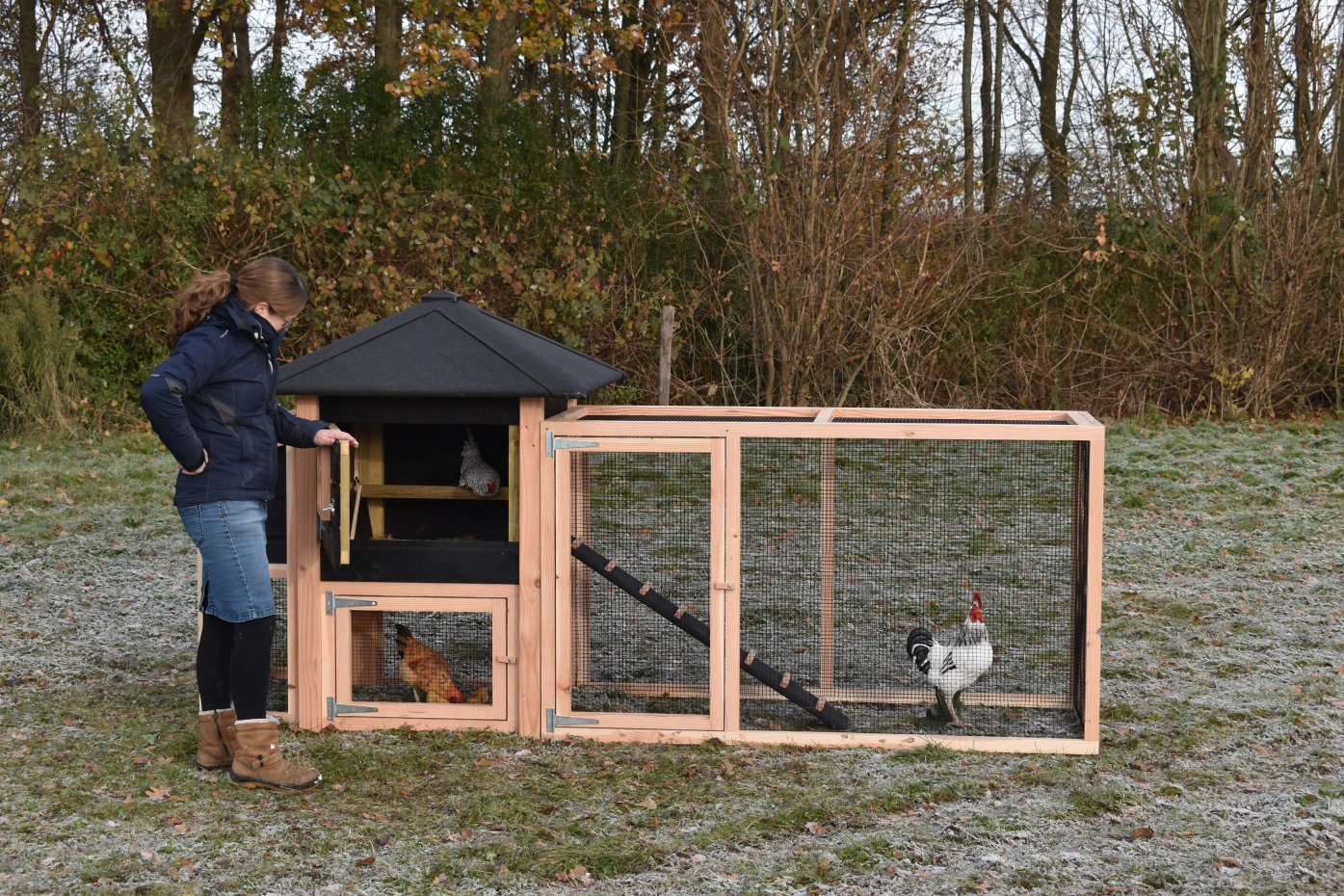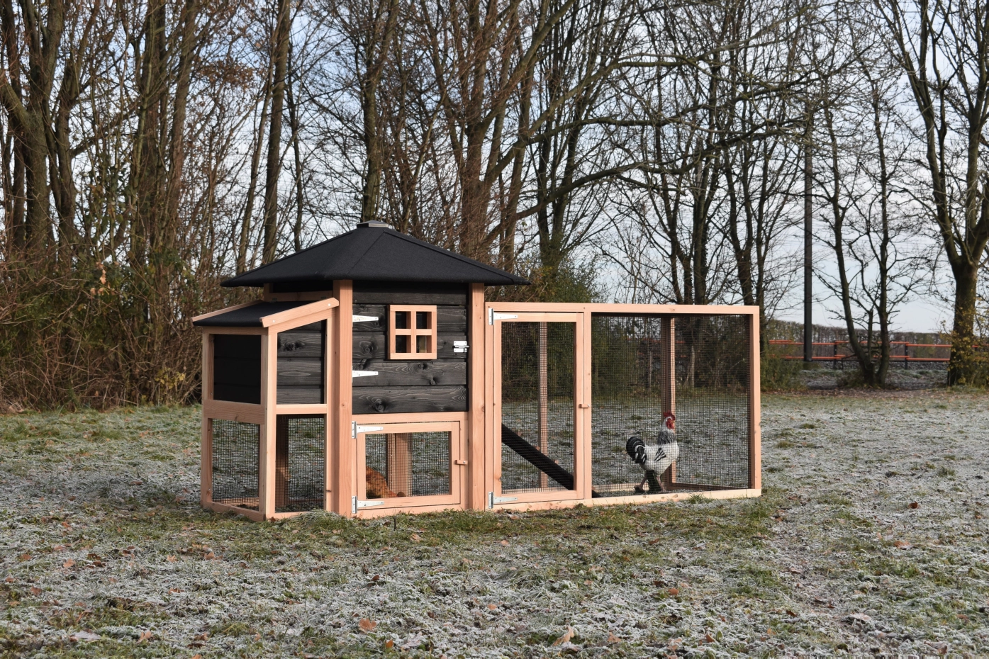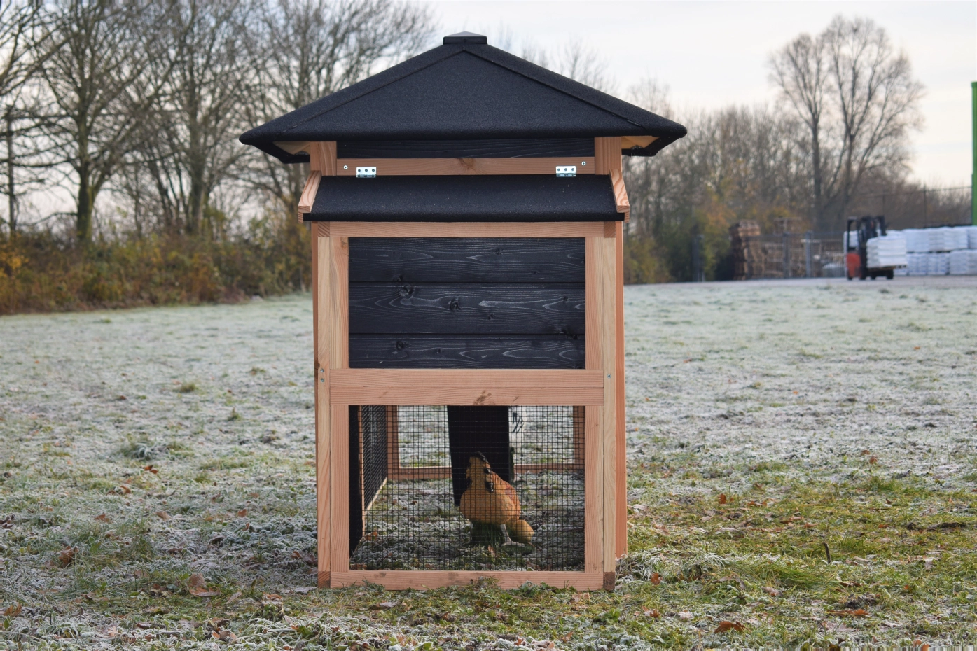 Poulailler Rosy est étendue avec une pondoir et un enclos. Le clapier a un grand poulailler fermé avec une grande porte, pour que vous pouvez nettoyer le poulailler fermé facilement. La pondoir a un toit articulé, pour que vous pouvez ramasser les oeufs facilement. Lorsqu'il pleut, les poules peuvent trouver un abri sous la nichoir et la pondoir. Le clapier est fabriquée en bois de Douglas et bois d'épicéa impregné, et necessité un peu d'entretien. Un bel clapier pour un bon prix!
