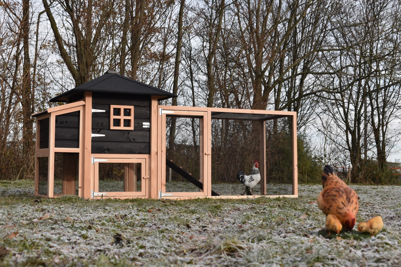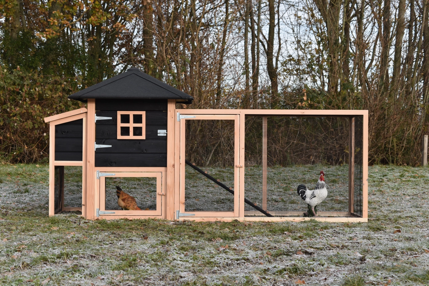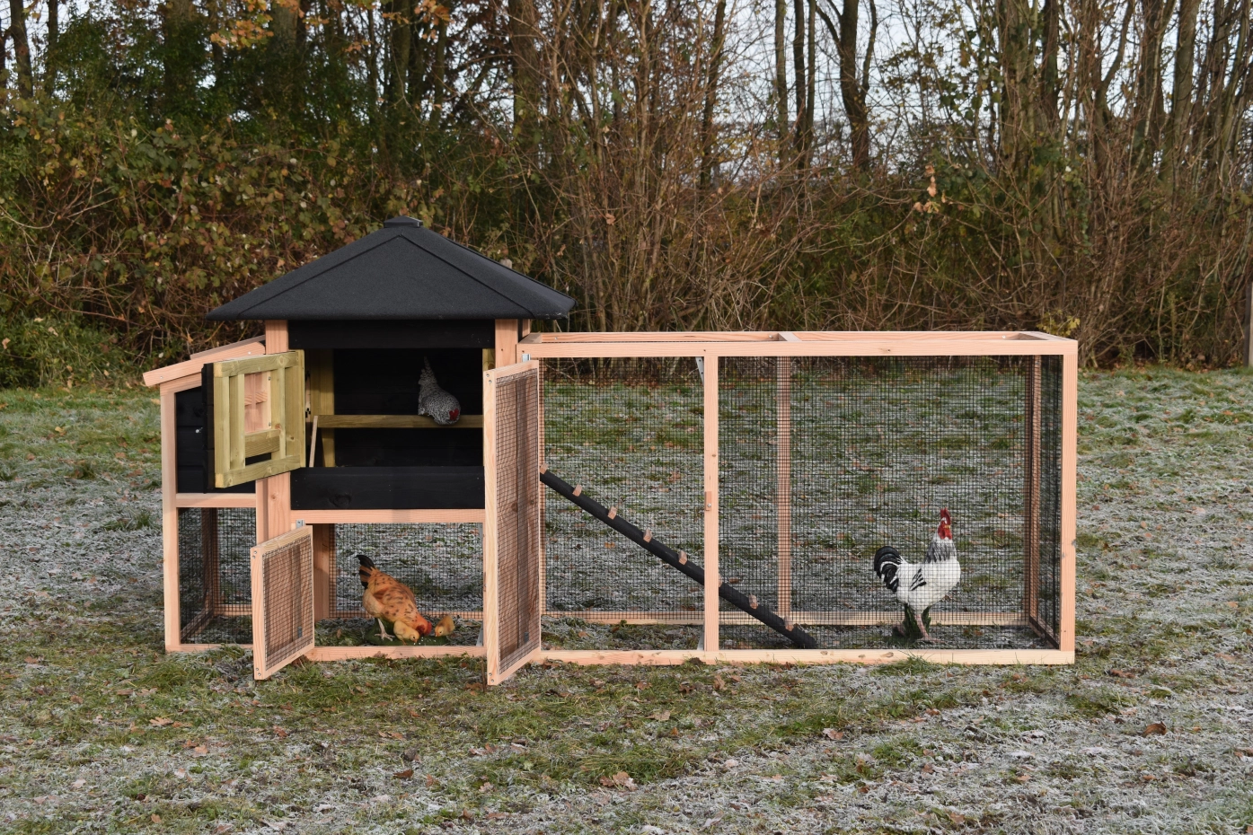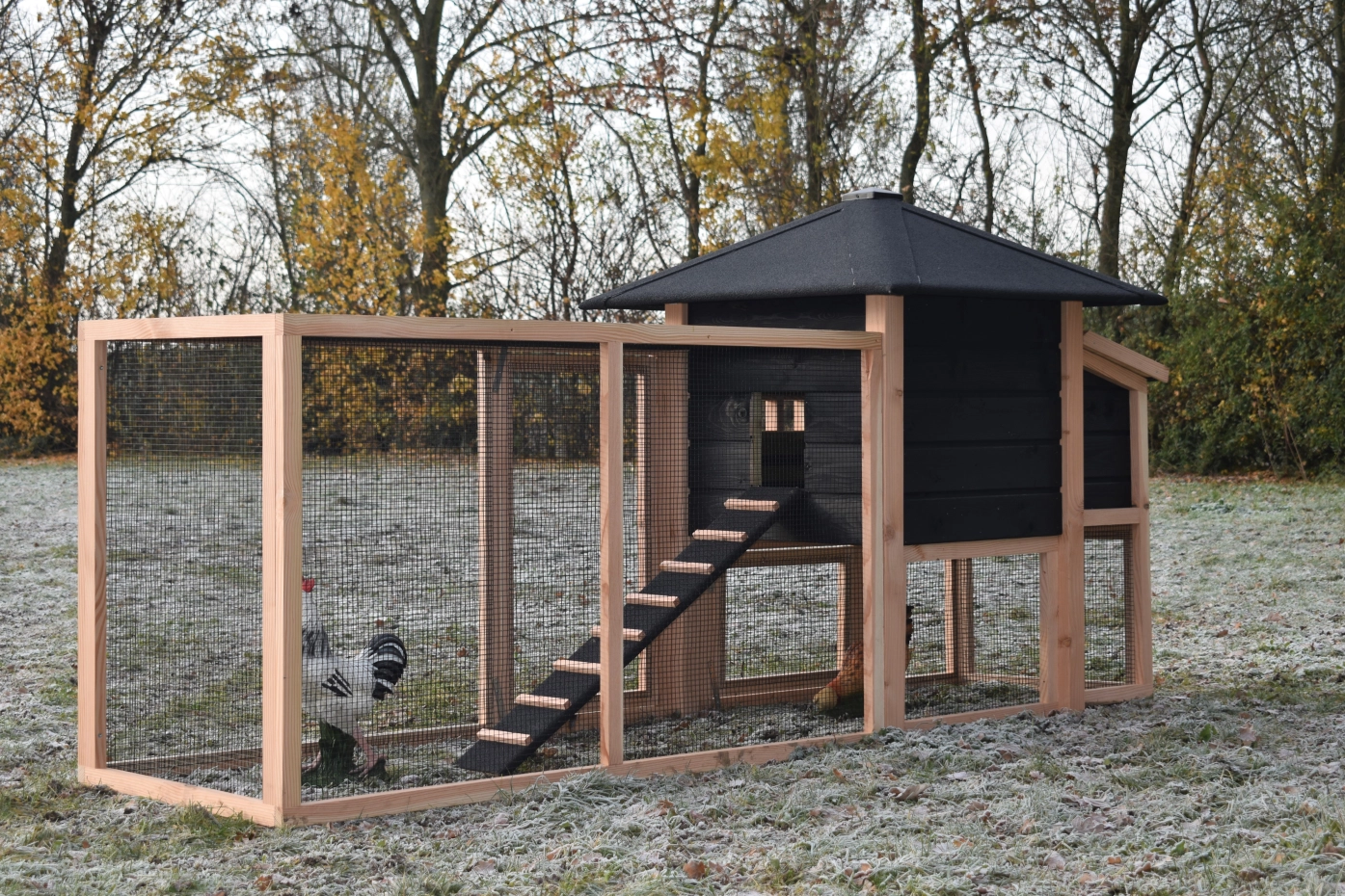 enclos avec toit grillagé · pondoir · douglas/noir