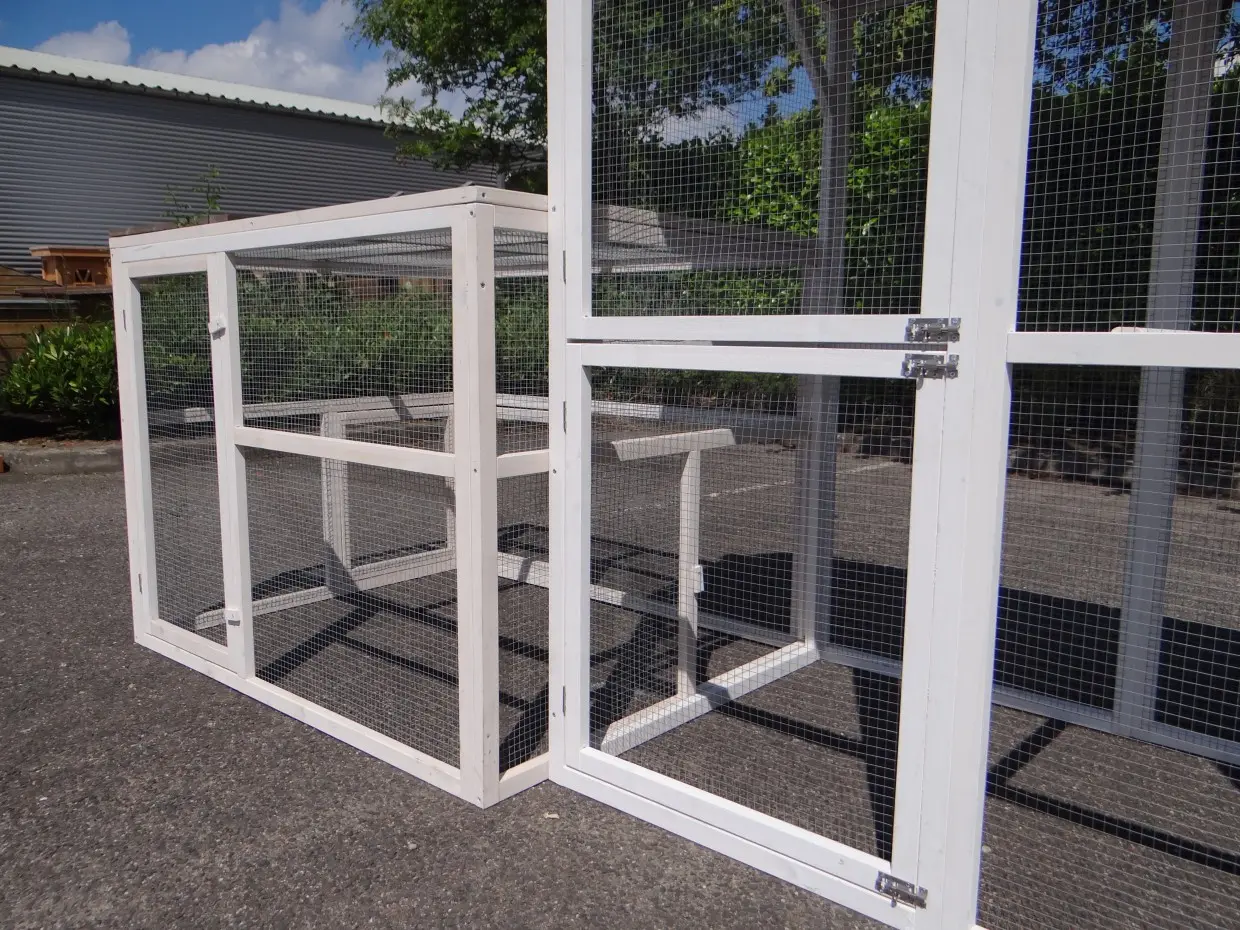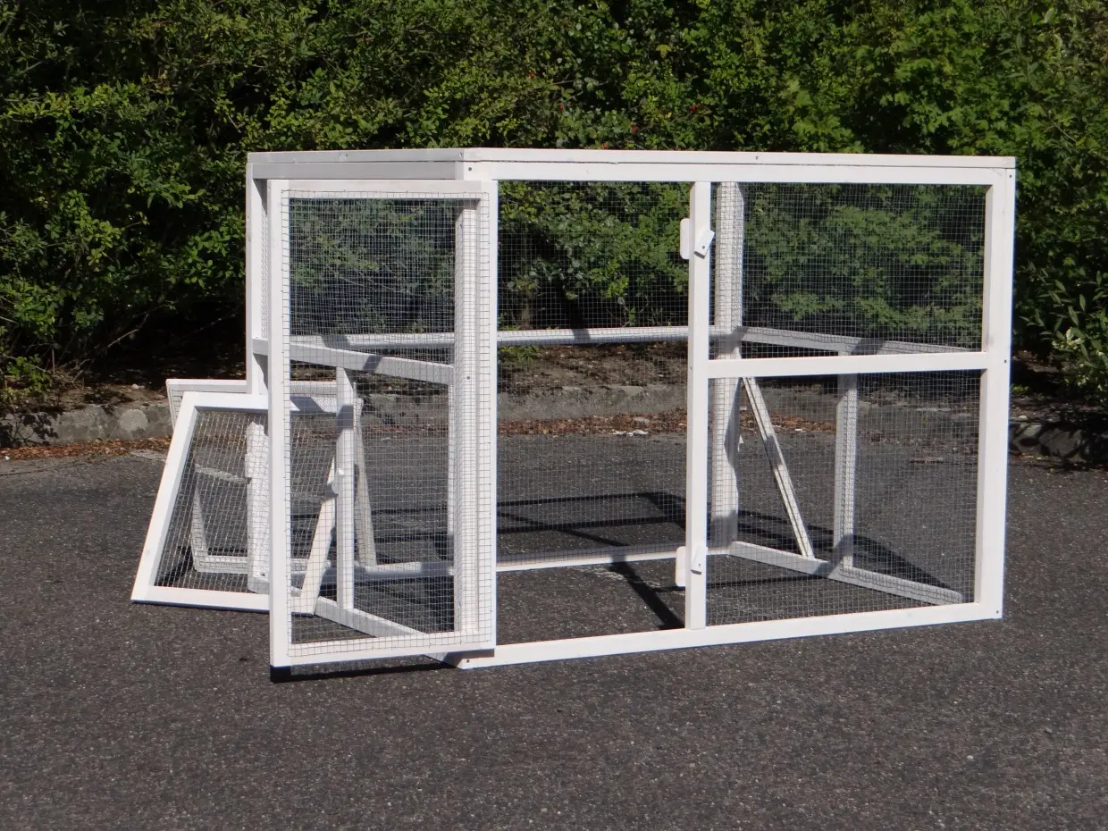 - Pour combiner enclos et poulailler, un panneau de treillis et / ou une porte doit être enlevé