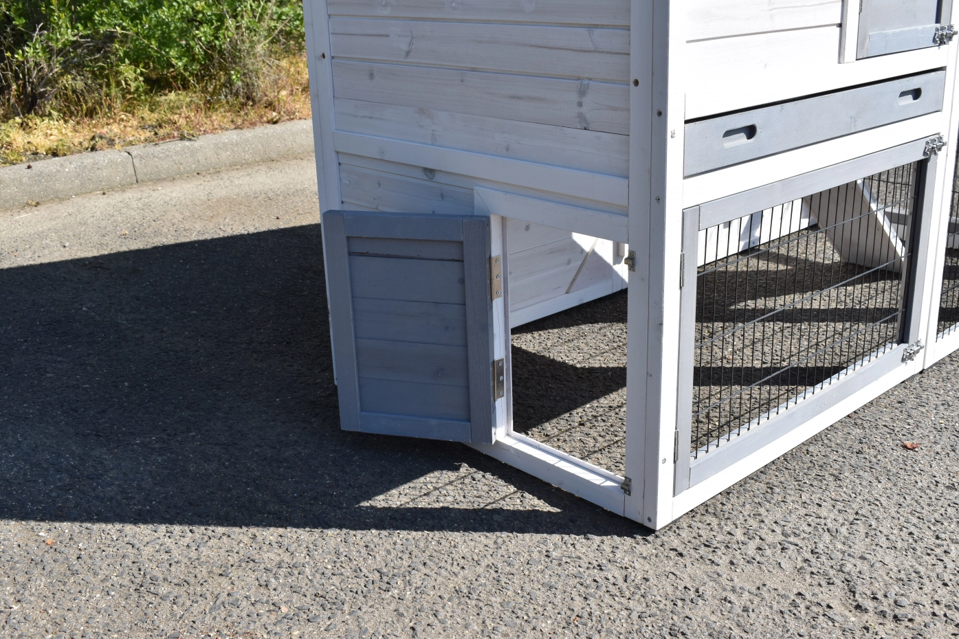 - Pour combiner enclos et poulailler, un panneau de treillis et / ou une porte doit être enlevé
