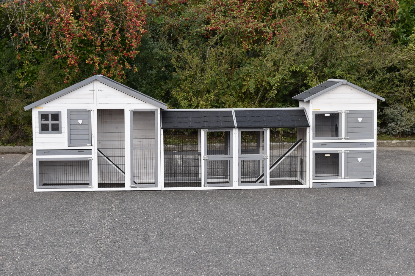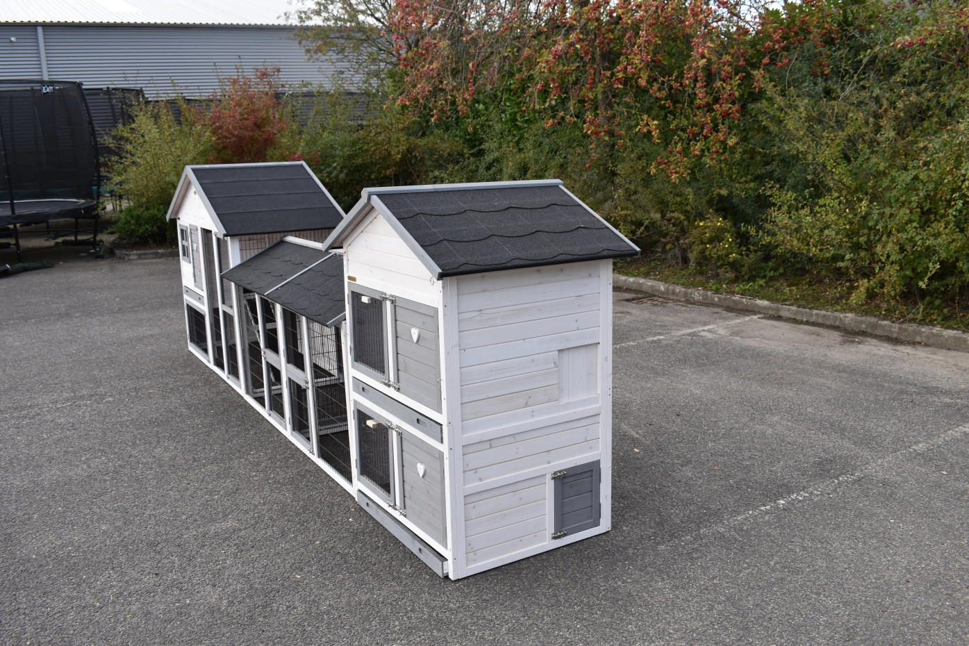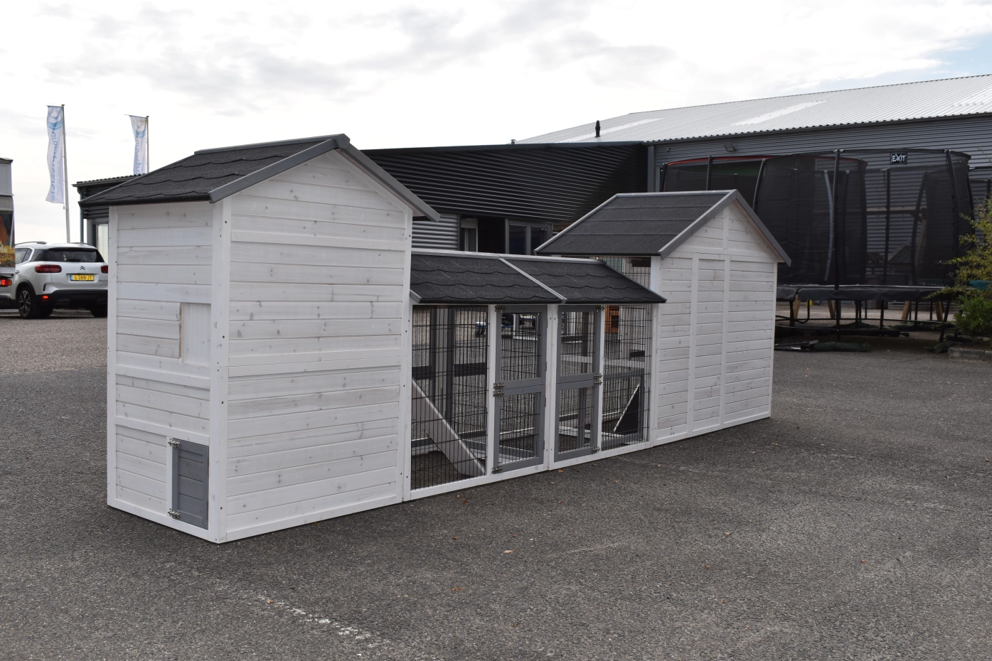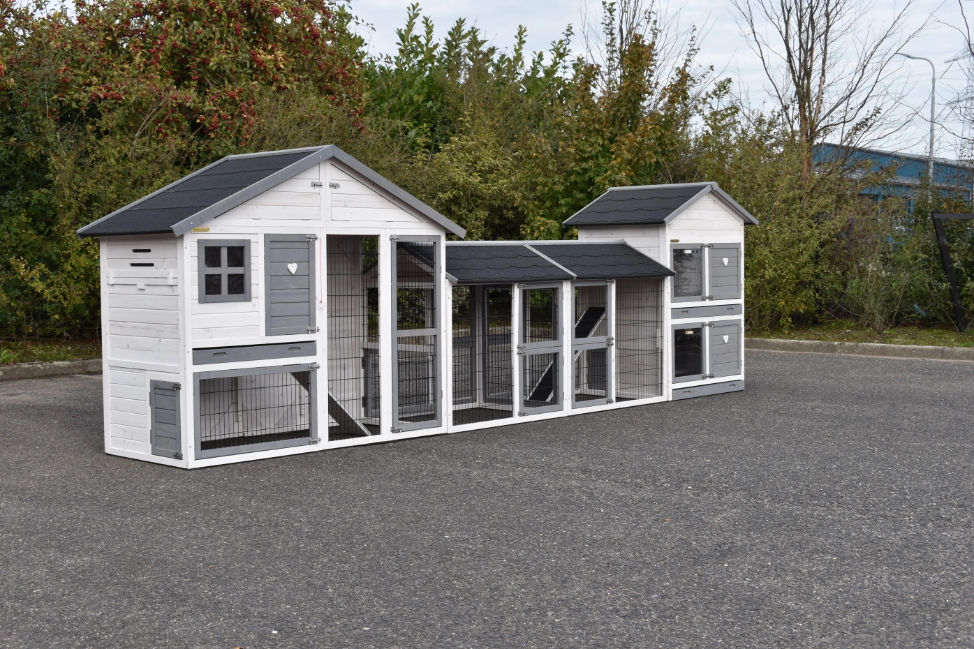 Le poulailler Holiday Medium a été agrandi avec le poulailler Double Medium et 2 enclos. Le poulailler Holiday Medium est équipé d'un tiroir coulissant et d'un grenier pratique. Le poulailler Double Medium possède 2 poulaillers fermés séparés, chacun avec un tiroir coulissant. Ce poulailler a également un grenier. Cette grande combinaison convient pour 9 gros ou 15 petits poulets.